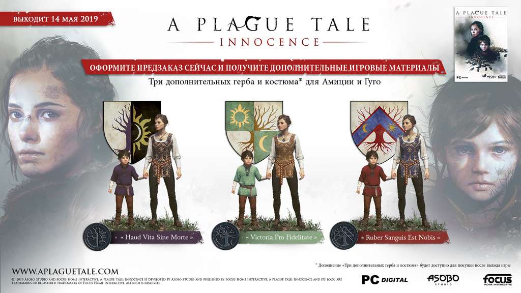 Если купить A Plague Tale: Innocence до релиза, то есть до 14-го мая 2019-го года, то удастся получить бонусы предзаказа. Они заключаются в 3-ех дополнительных костюмах и гербах для героев, которые помогут разнообразить путешествие Амиции и ее брата Гуго.