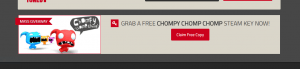 Индигала опять радует нас добротной раздачей игры Chompy Chomp Chomp, наделенной коллекционными карточками, ачивками и даже положительными отзывами покупателей. Надо зайти в аккаунт и нажать на кнопку баннера, после чего можно будет увидеть ключ активации в Steam.