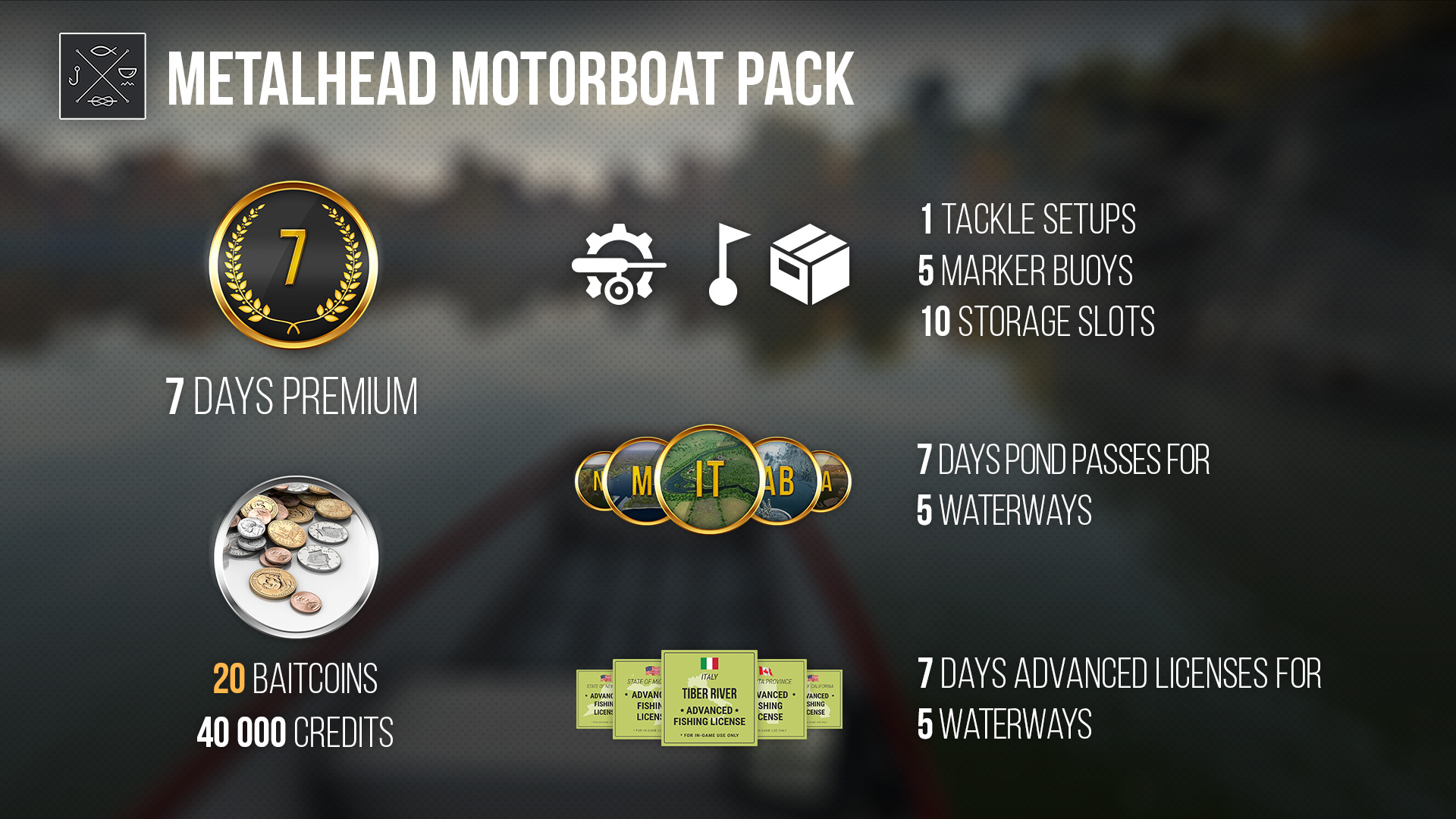 Ну что, готовы к захватывающему опыту рыбалки с моторной лодки? Тогда этот набор для вас! В состав Metalhead Motorboat Pack входит суперпрочная алюминиевая моторная плоскодонка Apus™ от компании Flaggmann™, а также превосходная комбинация из Special Edition удилища Loki™ и катушки Hornet Swarm™, множество различных воблеров и прочее рыболовное оборудование для идеальной рыбалки на воде! Вы также сразу получаете 7-дневные пропуски и Расширенные Лицензии для 5 потрясающих водоемов, включая фантастическое озеро Сент-Круа и живописную реку Тибр в Италии, и сможете наслаждаться рыболовным прогрессом на повышенных скоростях! В набор Metalhead Motorboat Pack входит: * 40 000 КРЕДИТОВ * 20 БЕЙТКОИНОВ * 7 ДНЕЙ ПРЕМИУМ АККАУНТА * 5 Маркерных Буёв * 1 Ящик-хранилище (10 Слотов) * 1 Укомплектованная Снасть МОТОРНЫЕ ЛОДКИ * Моторная Лодка Flaggmann™ Apus - Длина: 330 см, Ширина: 100 см, Вес: 90 кг, Двигатель: 10 лс, Эхолот: Усовершенствованный УДИЛИЩА И КАТУШКИ Удилища: * Loki 230 SE - Длина: 2.3 м; Тест: 20-65 г; Класс: Тяжелый; Рабочая нагрузка: 3.5–11 кг; Строй: Средний Катушки: * Hornet Swarm 5000 SE - Передаточное число: 5.0:1; Скорость подмотки: 90 см; Емкость шпули: Моно 0.5/100, Шнур 0.28/170; Мощность фрикциона: 9.5 кг; Фрикцион: Передний ОСНАСТКА * Лески - Длина: 1000 м: Флюорокарбон 0.4 мм - Нагрузка: 9.1 кг * Минноу Воблеры: Hunched Runner (x6) * Джеркбейты: Джерк #6/0 (x4) * Крэнк 5 м, #3/0 (x2) ОБОРУДОВАНИЕ * Садок GarryScott™ FishFort S Plus - Наибольшая рыба: 35 кг; Емкость: 120 кг ПРОПУСКИ НА ВОДОЕМЫ (7 ДНЕЙ): * Озеро Эмеральд (Нью Йорк) * Река Тибр (Италия) * Озеро Вайт-Мус (Альберта, Канада) * Озеро Сент-Круа (Мичиган) * Дельта Сан-Хоакин (Калифорния) РЫБОЛОВНЫЕ ЛИЦЕНЗИИ (7 ДНЕЙ): * Расширенная, Нью-Йорк * Расширенная, Италия * Расширенная, Альберта * Расширенная, Мичиган * Расширенная, Калифорния Далее