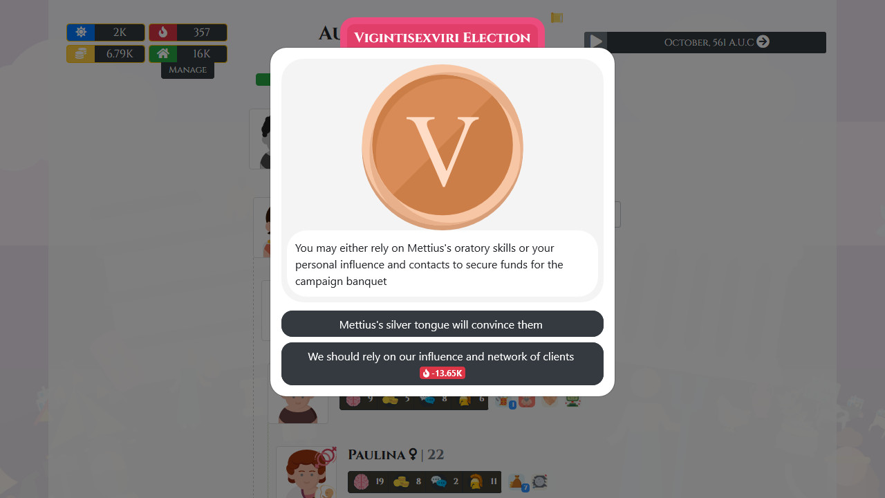 Citizen of Rome - Dynasty Ascendant is a family/Dynasty life sim set in the Roman Republic.You get to see how life was in the Ancient Republic, participate in their various customs, festivals and Ludi / sporting competitions, while raising a family and moving up in the social and economic hierarchy in the Republic.You can educate your children, marry them off, sponsor their elections and much more. You'll usually play as the eldest of your sons once your character dies.The game is open-ended without a set endgame just like in real life, but a grand goal for any ambitious Roman family was to land a Consulship of the republic. This could be your goal in the game as well, climbing the Cursus Honorum and becoming a "New Man" - "Novus Homo"WARNING: The game just like fate will beat you down from time to time and you might find all that you worked for being taken away from you in an instant, but the way things are set up you'll almost certainly end up growing wealthy and reach the Senatorial class at some point despite various setbacks. There is no game-over and life goes on no matter whatA core philosophy of the game is that just like in real life, there's no winning or losing, just experiencing life and having fun at it no matter where it takes you. The game should be fun in its own way at every level, no matter if you're a prole or a senator, but with things just playing differently and with different goals and challengesGameplay features: Fully offline, no ads, no in-app purchasesMarriage, Birth, Death, and SuccessionProperty and economySeveral key Roman festivalsTraits and SkillsEducationApprenticeships and employmentElections and Class progressionRandom interactions and eventsAchievementsDark ModeModding Support ( )Long live the Republic!Join us on Discord - Далее