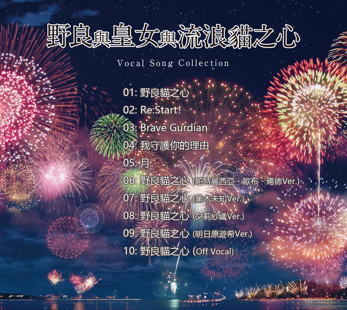 The Princess, the Stray Cat, and Matters of the Heart -Vocal Song Collection-Track List. 01 - Stray Cat Love02 - Re:Start!03 - Brave Guardian04 - Why I'll Always Be Your Shield05 - Moon06 - Stray Cat Love ~Patricia Version~07 - Stray Cat Love ~Michi Version~08 - Stray Cat Love ~Shachi Version~09 - Stray Cat Love ~Yuuki Version~10 - Stray Cat Love ~Off Vocal~