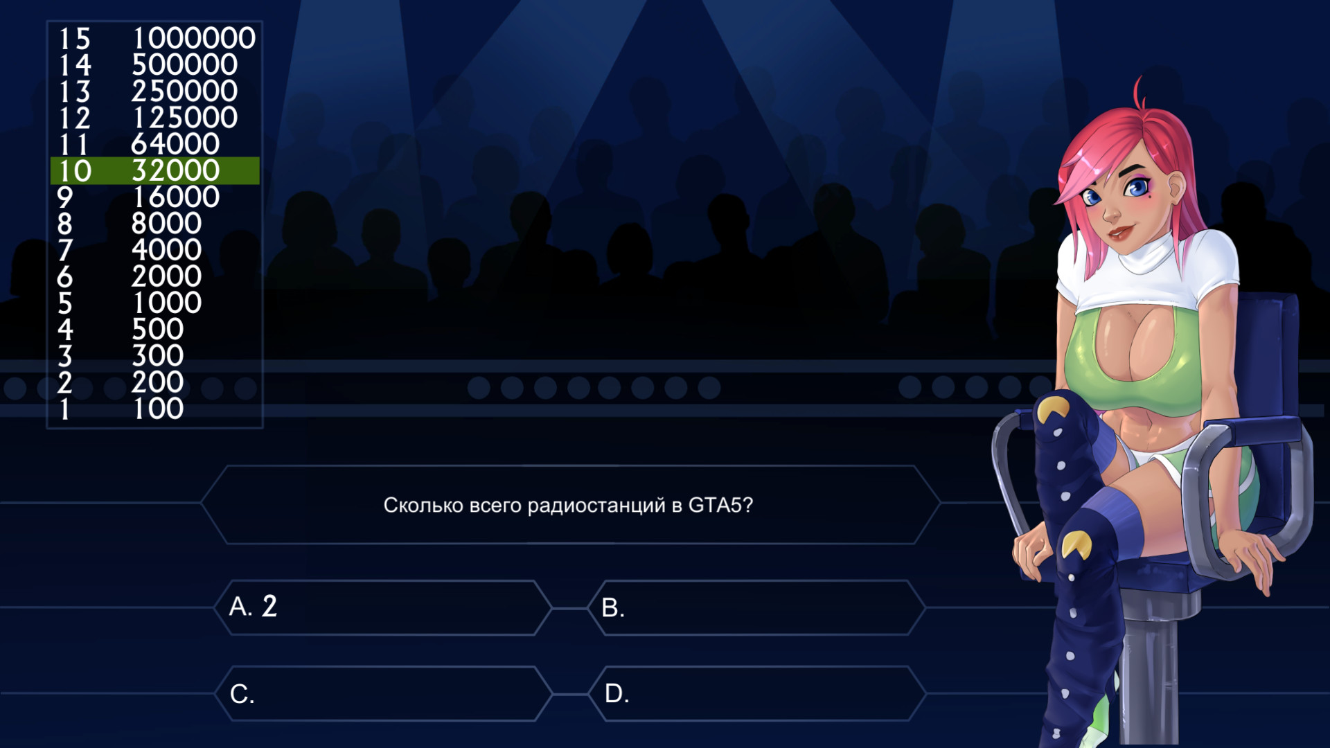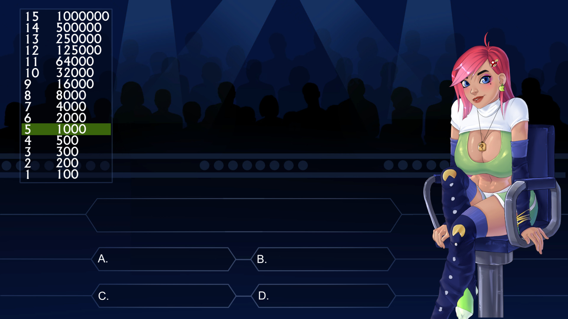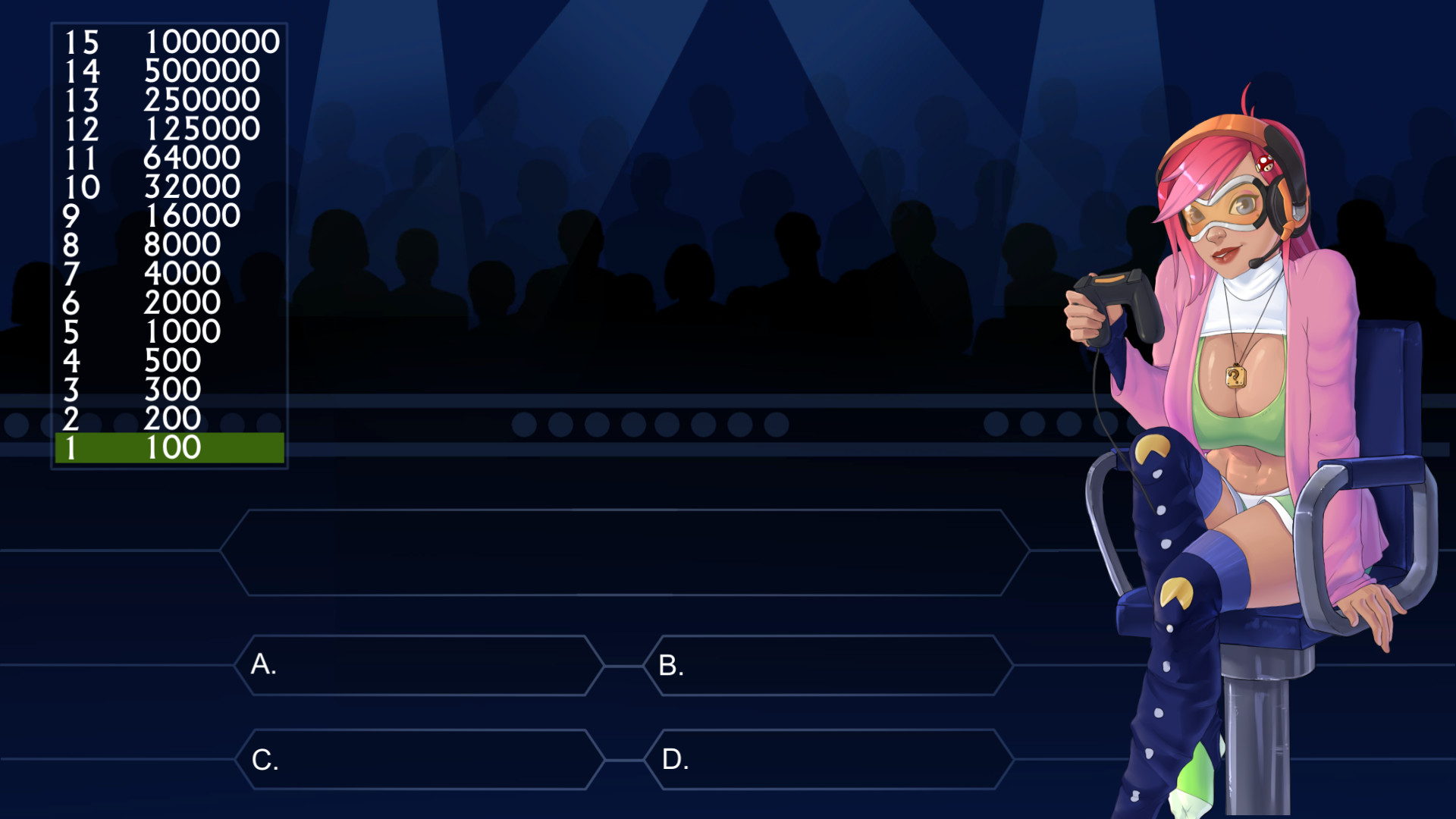 Сочетание всем известного ТВ-шоу с лучшим жанром игр из когда либо придуманных :) Девушка стример проверит твои знания об играх. С каждым правильным ответом она снимет с себя одну вещь, а после правильного ответа на последний вопрос откроется новая интересная сцена с ее участием :)Волшебное слово: "Senpai" Далее