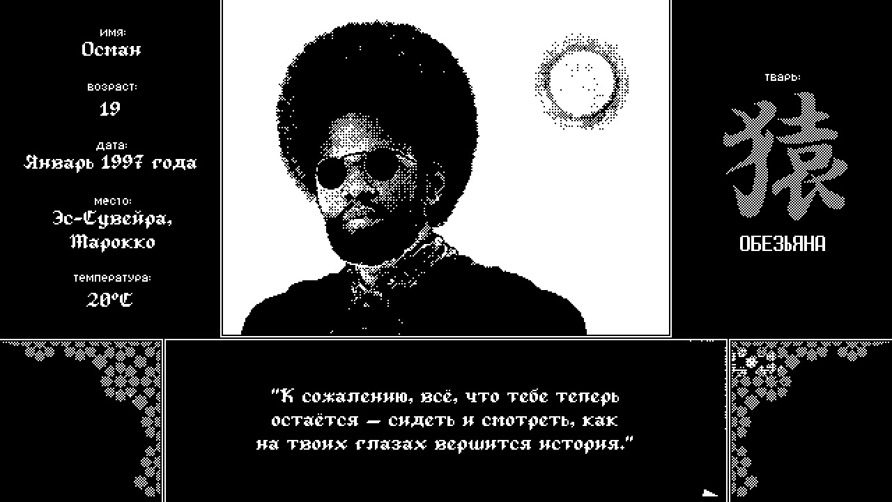 «Твари на продажу» — это сборник из пяти коротких историй: «Змея», «Коза», «Обезьяна», «Дракон» и «Паук». Они разворачиваются в разных местах и временах и затрагивают такие темы, как путешествия во времени, чёрная магия и бессмертие. В этом путешествии вы повстречаете персонажей знакомых и чуждых: от жителей сада на земной орбите и пришельцев с Нептуна до Параноидов из соседних временных линий и обитателей некоего Дворца реинкарнации.Помесь жанров point-and-click и визуальной новеллы. Игра ставит вас на место персонажей, которые оставили след в невидимой истории известного нам мира. Вы окажетесь в центре событий, повествующих о зловещей космической силе, желающей сокрушить вас и весь мир.Поступки и выборы, которые вы делаете на протяжении игры, влияют на исход каждого эпизода и в итоге приводят к вашей смерти или выживанию. Уклонитесь от гибели, и, возможно, вам удастся повлиять на историю.История, вдохновлённая сюрреалистическими ужасами ближневосточных и североафриканских народных сказок, разворачивается в пяти эпизодах, которые можно проходить в любом порядке. В каждом из них есть несколько концовок, так что кошмары, изображённые в «Тварях на продажу», можно проживать и перепроживать. Далее