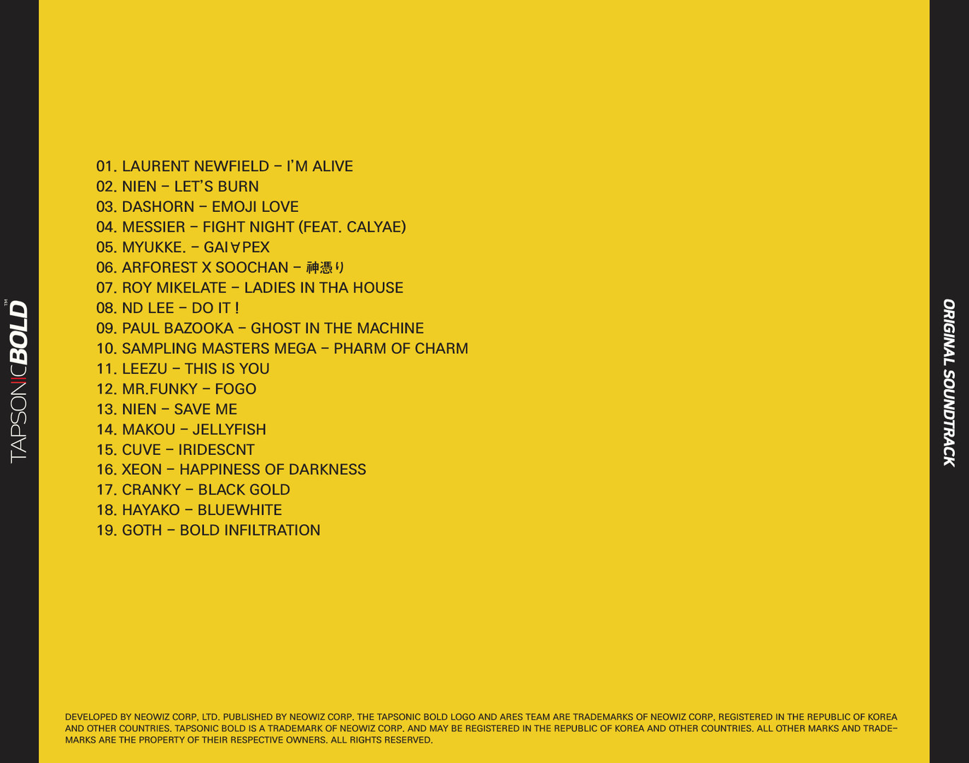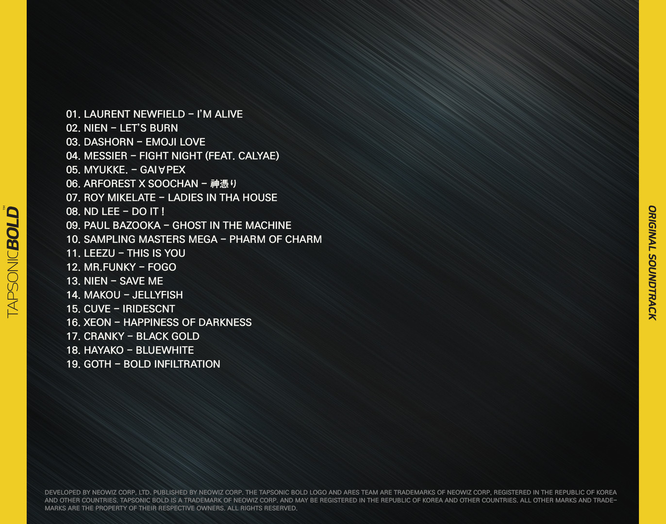 Track List. 01. Laurent Newfield - I'M ALIVE02. NieN - Let's Burn03. Dashorn - Emoji Love04. Messier - FIGHT NIGHT (feat. Calyae)05. MYUKKE. - GAI∀PEX06. ARForest x Soochan - 神憑り07. Roy Mikelate - Ladies in tha House08. ND Lee - DO IT !09. Paul Bazooka - Ghost In the Machine10. Sampling Masters MEGA - Pharm of Charm11. LeeZu - This is you12. Mr.Funky - Fogo13. NieN - Save Me14. Makou - Jellyfish15. Cuve - IRIDESCNT16. XeoN - Happiness Of Darkness17. Cranky - BLACK GOLD18. HAYAKO - BlueWhite19. GOTH - BOLD INFILTRATIONYou'll find the OST in your Steam local files folder:SteamsteamappscommonTAPSONIC BOLDOST Далее