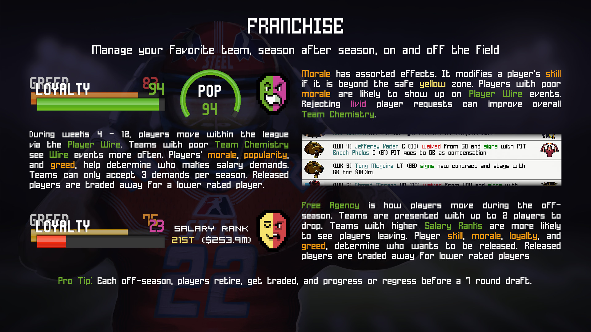 THIS GAME IS REALLY GOOD"BUY THIS! NOT MADDEN!" - AngryJoeShowLegend Bowl brings you back to the glory days of pixel style football games of the past! Enjoy a hybrid of arcade-style football and simulation aspects on and off the field. Fully customize players and teams to create an endless amount of variety in your league. Sim-based controls with challenging gameplay mechanics bring the fight to your doorstep! Legend Bowl includes Exhibition Mode, Tournament Mode, Franchise Mode, Training Camp Mode, and a boat load of customization options.EXHIBITION MODE. Play an exhibition match with any of the 32 teams in the league. Here you can pick up and play against the computer or a friend to see who can beat each other and get all the bragging rights!FRANCHISE MODE. Select your favorite team and play through an infinite number of seasons to see if you can win the Legend Bowl! You'll start off by selecting your favorite team and creating your very own coach or choose from an existing coach from the league. From there you'll play a full 17 week schedule, complete with player wire events, player and team stats, weekly wrap up news, and more to keep you engaged along the way. Player traits are a major factor in how they play each week and you'll have to manage the chemistry of your team to keep you in the winner's circle. There's also a complete off season where you'll take your team through retirements, free agency, player progression, and a full 7 round draft. The goal is to have a deep and immersive Franchise mode where you can have endless hours of fun and challenge!TOURNAMENT MODE. Take your team through a bracket style tournament tree to see if you can become a legendary squad! There are 16 teams in total and you must beat your bracket each week to get to the final championship game. Do you have what it takes to win it all?TRAINING CAMP MODE. Take on special drills to earn unlockable items and practice until your thumbs get sore! This mode is a sandbox where you can hone in on your skills and practice plays with your favorite teams.CUSTOMIZATIONS. Are you the creative type? Well look no further! In Legend Bowl, you'll be able to fully customize players, coaches, and teams to recreate your very own league. Choose from a variety of hairstyles, faces, visors, earrings, hats, headbands, gloves, and more to build as unique of a roster as you can dream up. This is one of the main pillars of our game and we can't wait to see what the community brings to the table!REALISTIC WEATHER. Weather is key to any football game, so why not in Legend Bowl? Play in clear, cloudy, rain, and snow types of weather. Be careful not to get struck by lightning! There's also a Day time cycle lighting system so you can feel the heat on the field.PRESENTATION. On the field stat overlays, halftime stats, end of game stats, field art, live referees, chain gang, mascots, advertisements, fans and more get you immersed in the game and bring the action to your screen!HYBRID ARCADE & SIM-STYLE FOOTBALL ACTION. Travel to the golden era of sports games when you had fun mixed with realistic gameplay. Customize your rosters and build a legendary team using speed, agility, acceleration, and more to battle your way through the gridiron!ON THE FIELD. Player movement is a mix between simulation and arcade based mechanics. Momentum and weight help to make your players "feel" alive! A unique throwing mechanic allows you to control the ball and give your receivers the best chance to catch the ball!RETRO PIXELATED GRAPHICS. Experience timeless pixelated graphics and fully customizable player faces, hair, helmets, hats, visors, facial hair, equipment, and more! The customization options are endless and make for a unique artstyle!RETRO CHIPTUNE SOUNDTRACK. Listen to classic chiptune music that make you feel like you're back in the arcade with your friends.For the best experience a gamepad is highly recommended (e.g. Steam Controller, Xbox 360, Xbox One, Playstation + many others will work with emulation) - The game can also be played with only a keyboard in single player mode. A controller is required in order to play local multiplayer. Далее