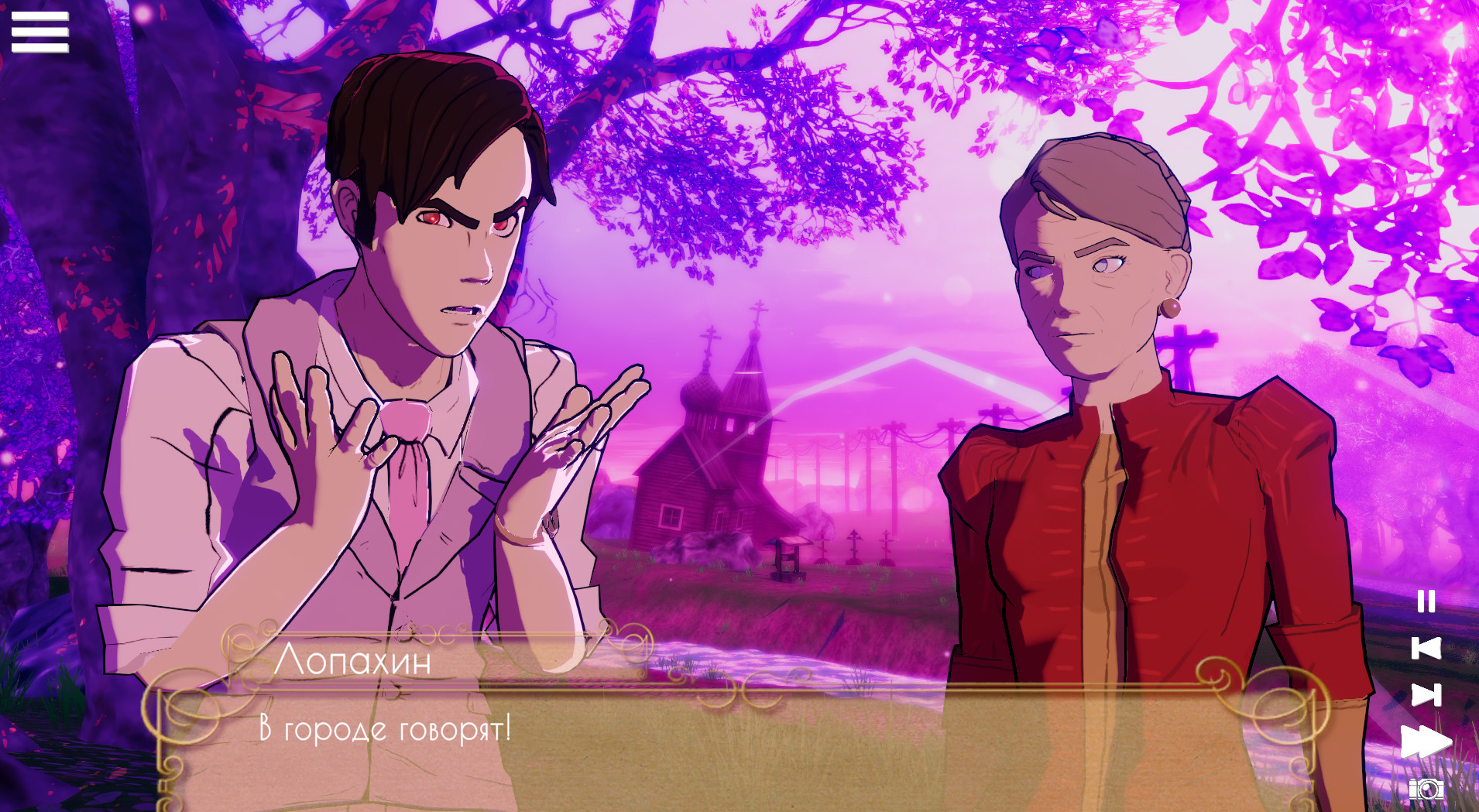 «Ведь так ясно, чтобы начать жить в настоящем, надо сначала искупить наше прошлое, покончить с ним, а искупить его можно только страданием..»«Вишнёвый сад» — это кинетическая визуальная 3D новелла-адаптация классической пьесы Антона Чехова. Эксцентричная аристократка пытается разделаться с долгами, чтобы не пришлось продавать любимый вишнёвый сад. Есть только одна маленькая проблема: бывшей помещице неведома ценность денег. Далее