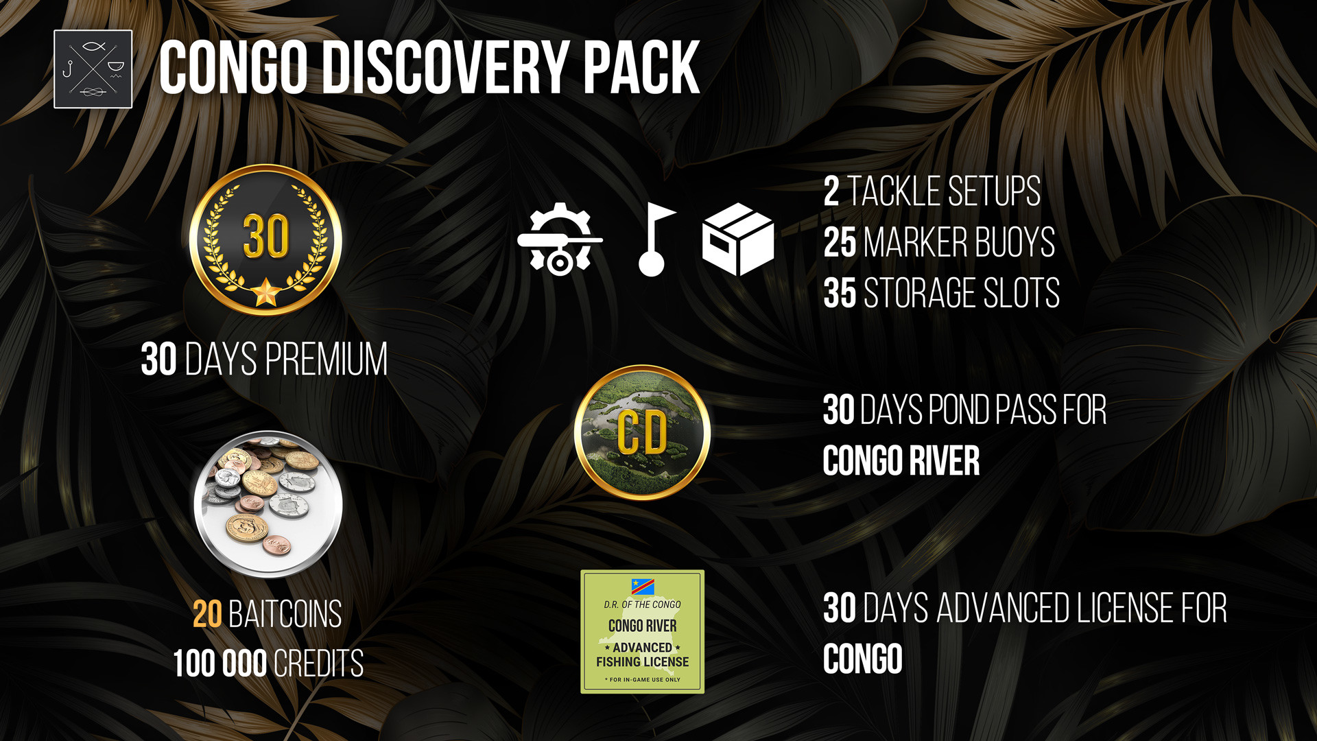 Итак, вы решили окунуться в удивительный мир африканской донной рыбалки! Чтобы вам были по плечу обитатели речных глубин Конго, мы собрали все необходимое в наборе Congo Discovery Pack. В него входит не одна, а целых две мощных удочки разных типов с катушками непревзойденного качества! Также в наборе вы найдете особые наживки для прожорливых африканских хищников, а главное – сверхпрочный и устойчивый катер Garry Scott™ Dráco™, оснащенный специальными держателями для удочек. И конечно же, в набор входит расширенная лицензия и 30-дневный пропуск на Реку Конго. Congo Discovery Pack включает в себя: * 100000 КРЕДИТОВ * 20 БЕЙТКОИНОВ * 30 ДНЕЙ ПРЕМИУМ АККАУНТА * 25 Маркерных Буёв * 35 Слотов * 2 Слота для Комплектов Снастей МОТОРНЫЕ ЛОДКИ * Лодка Garry Scott™ Dráco™ - Длинна: 745 см; Ширина: 215 см; Вес: 1350 кг; Двигатель: 300 лс; Эхолот: OEM, ElitePro; Держатели для удилищ: 2 УДИЛИЩА И КАТУШКИ Удилища: * UL-CHUBER™ Mokonzi™ 390 SE - Длина: 3.9 м; Тест: 170–280 г; Класс: Сверхтяжелый; Рабочая Нагрузка: 18–37 кг; Строй: Средний * Garry Scott™ EquatorMatch™ 260 SE - Длина: 2.6 м; Рабочая Нагрузка: 13–38 кг; Строй: Средний Катушки: * UL-CHUBER™ Fileur™ 11000 SE - Передаточное Число: 5.2; Скорость Подмотки: 110 см; Емкость Шпули: Моно 0.8/123, Шнур 0.32/343; Мощность Фрикциона: 36 кг; Фрикцион: Передний * Garry Scott™ L'impulsion™ 12000 SE - Передаточное Число: 5.6; Скорость Подмотки: 120 см; Емкость Шпули: Моно 0.8/123, Шнур 0.32/343; Мощность Фрикциона: 37 кг; Фрикцион: Передний ОСНАСТКА * Лески - Длина: 1000 м: * Монофил 0.85 мм - Нагрузка: 38 кг * Флюорокарбон 0.85 мм - Нагрузка: 36 кг * Флюорокарбон 0.87 мм - Нагрузка: 38 кг * Моно поводок 0.7 - Длина: 2 m; Нагрузка: 37 кг (x30) * Моно поводок 0.7 - Длина: 2 m; Нагрузка: 37 кг (x15) * Флюорокарбоновый поводок 0.85 (x10) - Длина: 0.25 m; Нагрузка: 36 кг (x10) * Флюорокарбоновый поводок 0.85 (x10) - Длина: 0.5 m; Нагрузка: 36 кг (x10) * Флюорокарбоновый поводок 0.87 (x10) - Длина: 0.25 m; Нагрузка: 38 кг (x10) * Флюорокарбоновый поводок 0.87 (x10) - Длина: 0.5 m; Нагрузка: 38 кг (x10) * Крючки: #2/0, #4/0 (x10) * Крючки Cap'n: #7/0 (x5), #8/0 (x5), #10/0 (x5), #12/0 (x6), #14/0 (x6) * Поплавки: Слайдер Тяжелый, Ваглер Тяжелый (x1) * Грузила: Грузило 175 г, Грузило 200 г, Грузило 225 г (x1) * Колокольчик * Наживки: Куски рыбы крупные (x20), Кусочки Мяса (x20), Куриная Печень (x20), Куски Рыбы Огромные (x20), Большая Печень (x20), Консервированное Мясо (x20), Почки Буйвола (x20), Мелкая Тилапия (x20), Личинка Ручейника (x50), Африканский Гигантский Водяной Жук (x50), Наживки: Банановый Хлеб (x100) СНАРЯЖЕНИЕ * Garry Scott™ Садок FishStronghold M Plus - Наибольшая Рыба: 140 кг; Емкость: 420 кг; ПРОПУСКИ НА ВОДОЕМЫ: Пропуск на Реку Конго (30 Дней) РЫБОЛОВНЫЕ ЛИЦЕНЗИИ (30 дней): Расширенная, Конго Далее