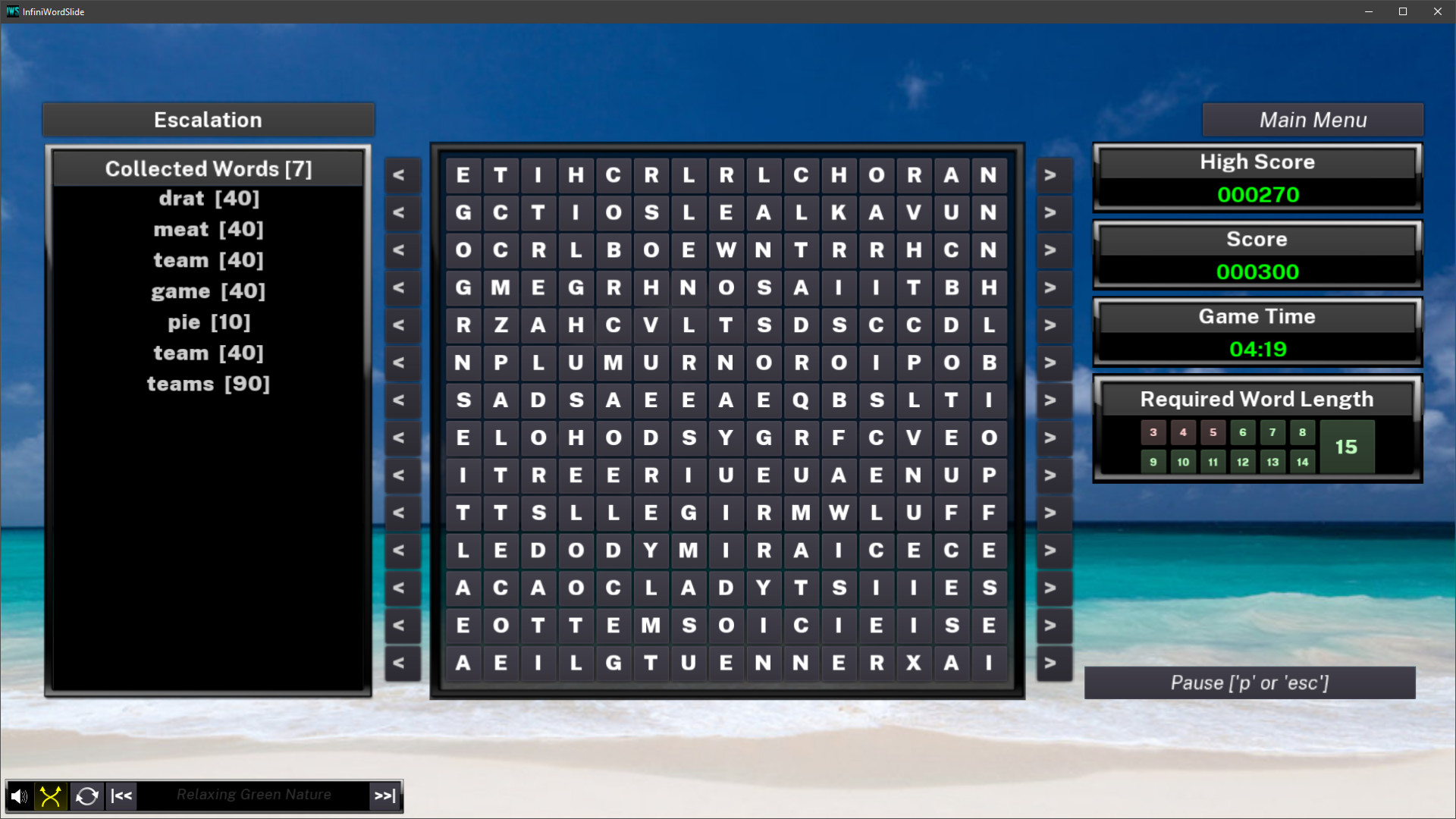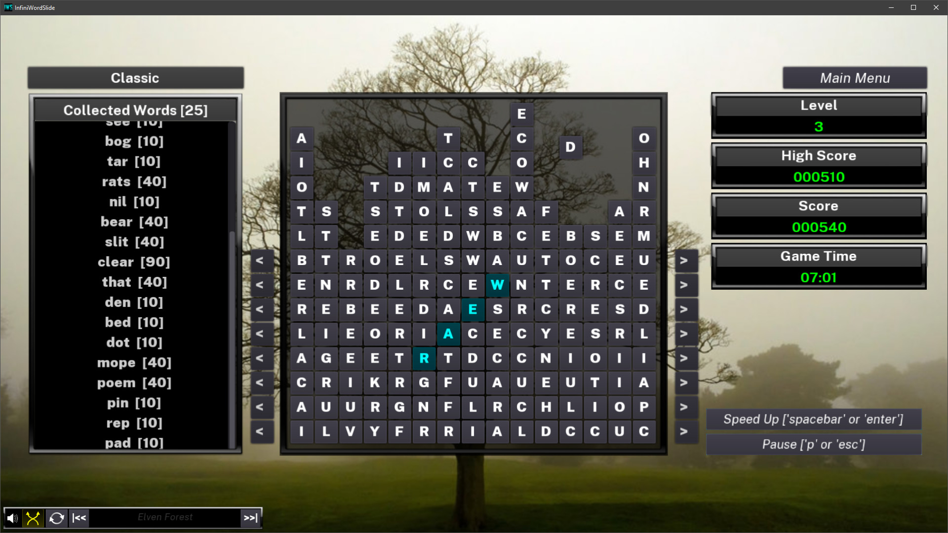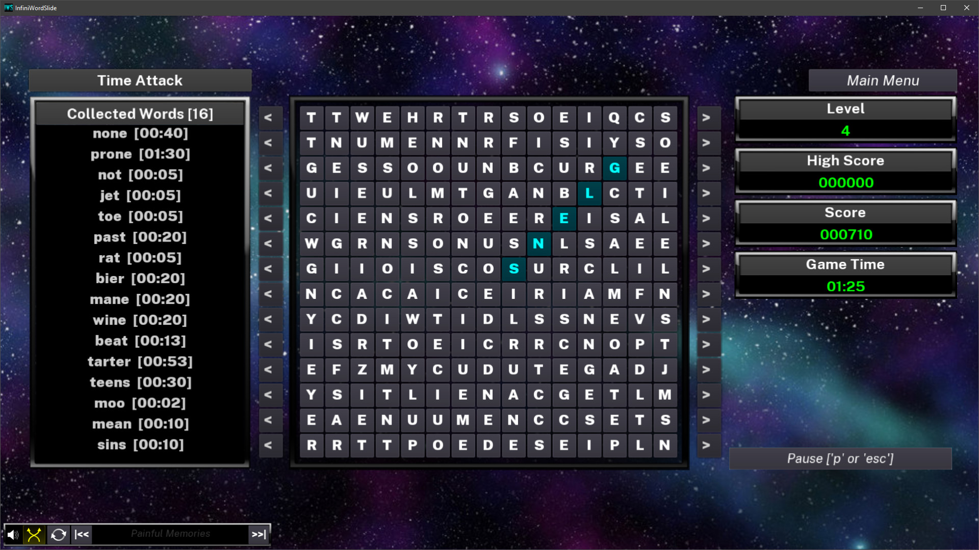 Midway between the word search and the *tris games, this game challenges your mastery of the language, your ability to strategize, your reaction time and your attention to detail. In the Classic mode, you must race the clock to find words on the grid and prevent the ever falling letters from reaching the top of the screen. Filled rows will let you slide sideways, a real key to staying alive! In contrast, the Zen mode gives you an eternally filled grid where your only goal is to find as many words as you want, at your leisure. If you'd rather play with a full grid, yet keep the pressure on, the Time Attack mode might be what you're looking for. Finally, the Escalation mode will reward your ability at making long words, for queuing small ones will mark the end of the game. Infinite gameplay, no real upper score, simple controls and clear mechanics makes this a fun arcade game without any cheap continues. More to come very, very soon. Далее