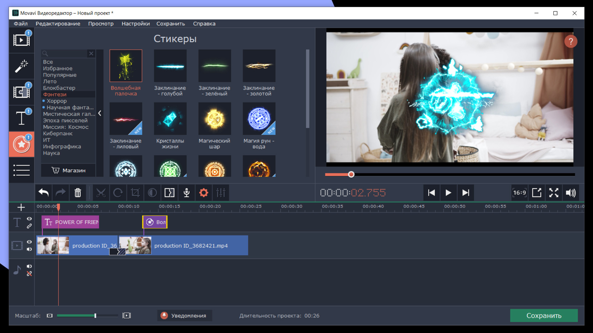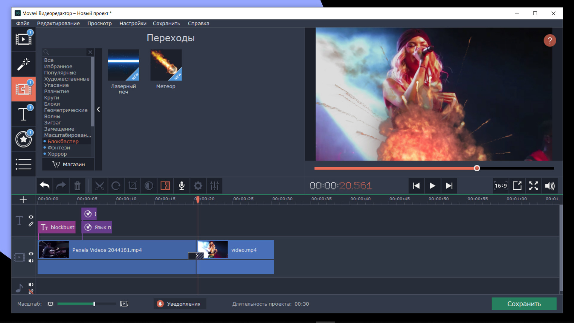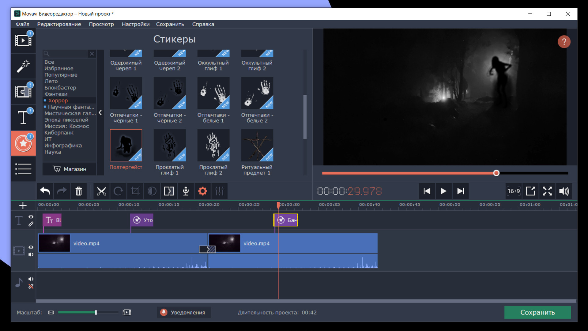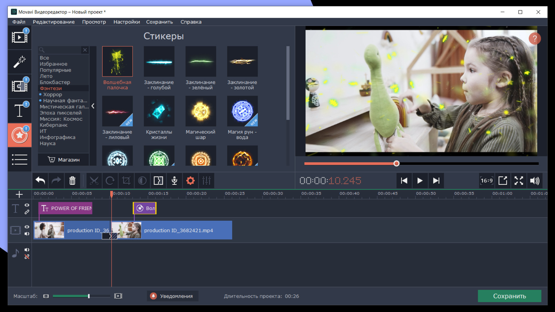 Создайте голливудский фильм с помощью взрывов, дымовых завес, сказочных фонов и футуристических переходов.В наборе 4 пака:БлокбастерФэнтезиНаучная фантастикаХоррорВыберите фон для эпичного сражения с инопланетянами или прикрепите магические элементы, чтобы сотворить заклинание. Добавьте пугающие маски в хоррор – так, чтобы кровь стыла в жилах.В наборе:14 титров 98 стикеров7 переходов16 фонов7 рамокЭтот DLC набор совместим с Movavi Video Editor Plus 2020. Далее