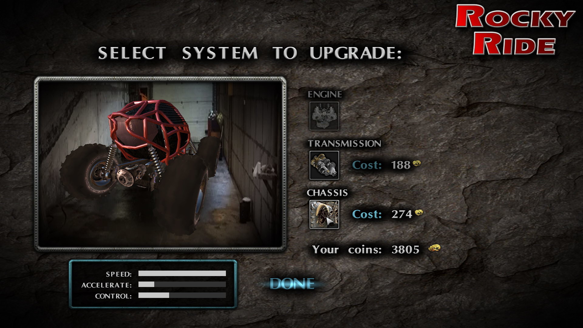 Добро пожаловать в аркадные гонки "Rocky Ride"! Вас ждут крутые виражи, непредсказуемые трассы, сумасшедшие скорости и опасные соперники. Сумасшедшая гонка на быстрых багги среди крутых скал и густых лесов. Собирай на трассе предметы, необходимые для победы. Модернизируй свой багги. Пусть он станет самым быстрым! Выбирай любую из огромного количества разных трасс, и – вперед! К призовым местам! - Разнообразные трассы причудливых конфигураций - Приятная 3D графика - Реалистичная физика Игру делал один человек, на энтузиазме. Программировал, рисовал модели и т.д. Далее