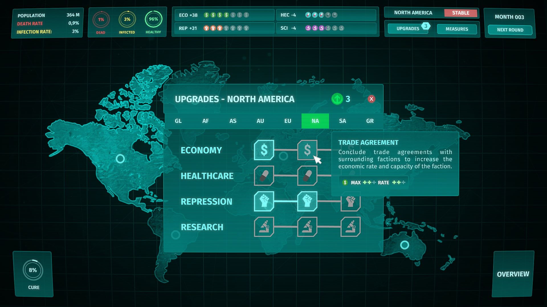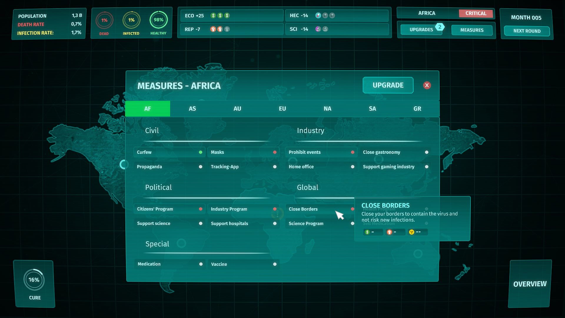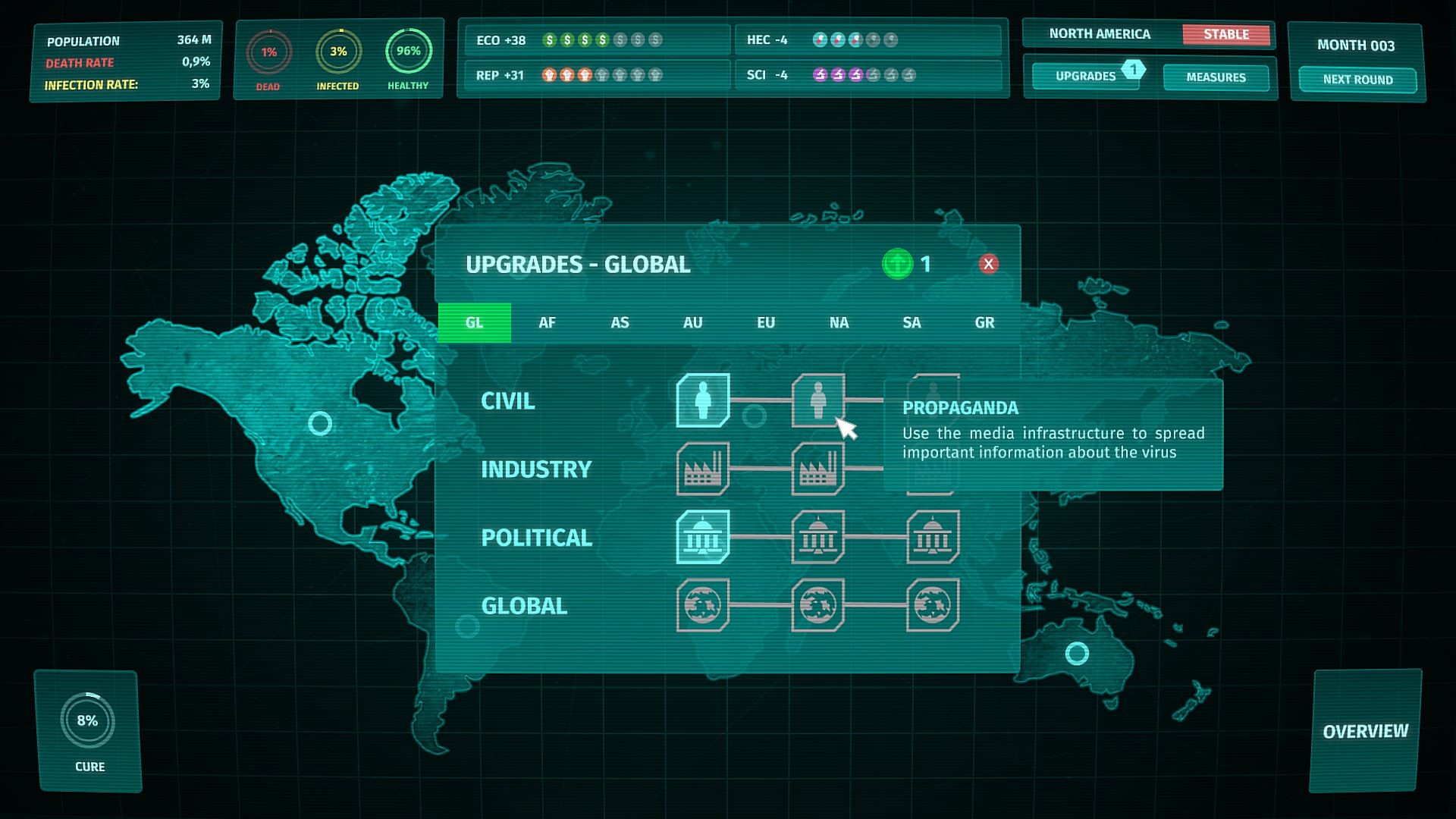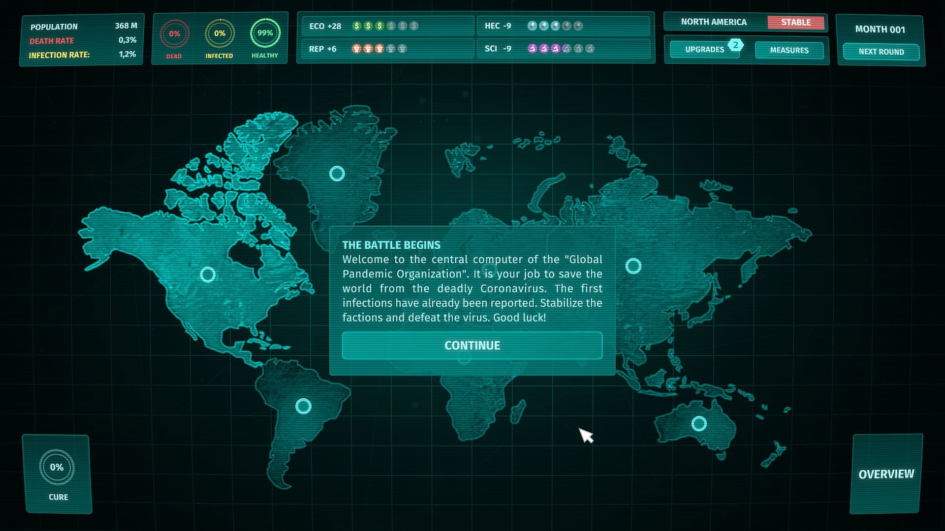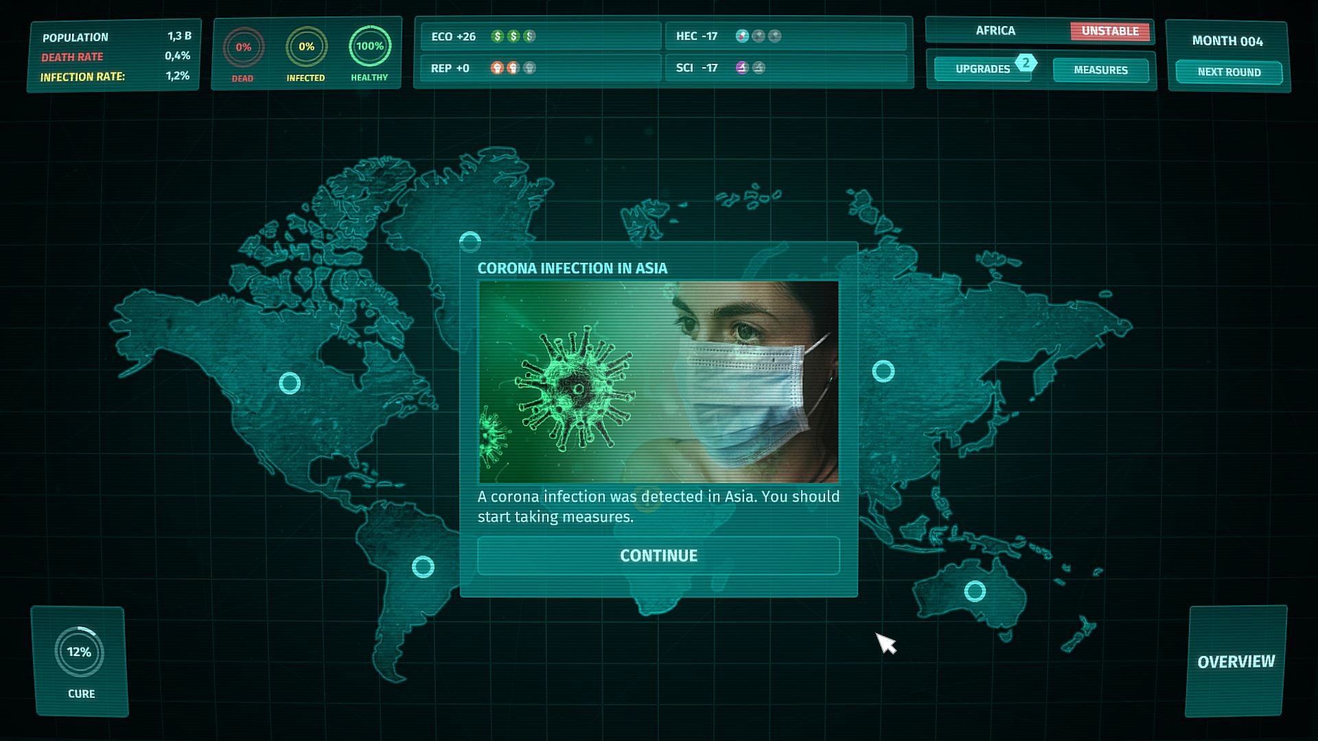 "Corona Simulator" is a sophisticated mixture of challenging strategy game and frighteningly detailed virus simulation. As a global pandemic leader, you must skillfully manage nations' resources, make tough decisions, and impose drastic measures to combat the deadly coronavirus and change the fate of mankind.To express his respect for the victims of COVID-19, the developer has voluntarily placed himself in domestic self-quarantine for the entire production period of the "Corona Simulator".How can Corona Simulator help combat COVID-19?. The game will come in two editions. The normal edition and the „Savior Edition“. Along with additional features, 20% of the profit made by this version of the game will be donated to the WHO COVID-19 Solidarity Response Fund. Далее