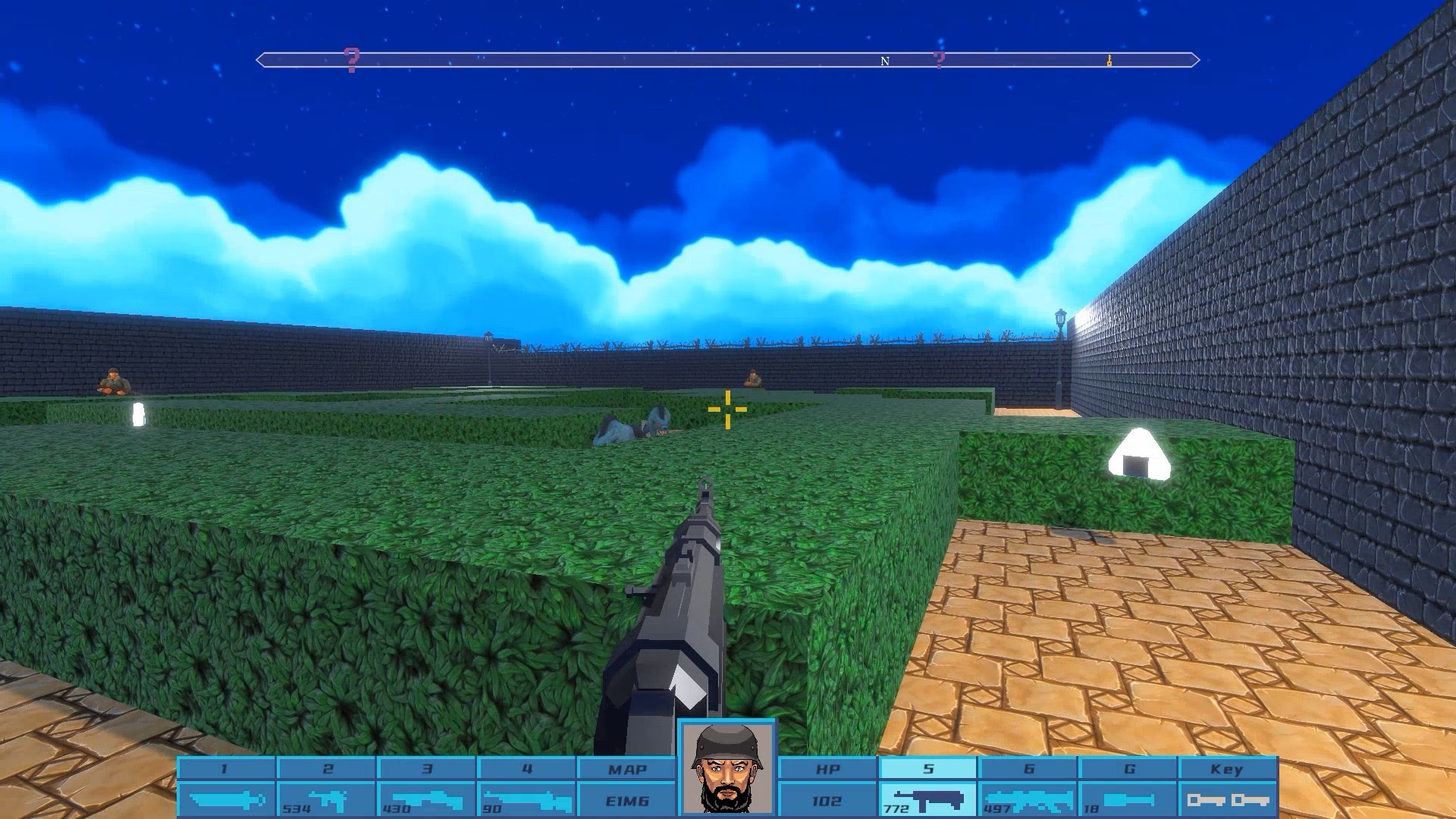 Hey! I am a big fan of "Wolfenstein 3D" and John Romero. I made this game to show my respect to them. I have collected and studied a lot of videos and articles of John Romero, learned a lot about game design concepts, and applied them to my game. For example, horseshoe-shaped game level design.Content. 27 well-designed game levels17 kinds of ferocious enemies10 kinds of expected supplies8 kinds of weapons with distinctive features3 exciting BOSS battlesNearly 100 tricky secret locationsAction. Move – WASDFast Move - Shift + WASDSwitch Weapons - 1~6Grenade - GWeapons. Da Dao – With the strongest attack power! For close fight only.Pistol – Better than nothing for a while if there are no other long-range weapons.Shotgun – As an Old School FPS, how can there be no shotgun?Rifle - One shot one kill!Submachine gun - pit-a-pat!Heavy machine guns - good spread!Grenade – Boom!Oil drum - Boom! Boom! Boom!Tip. Try to find all the secret locations and you will get many surprises. This is not difficult, because the locations are all marked on the compass. Далее