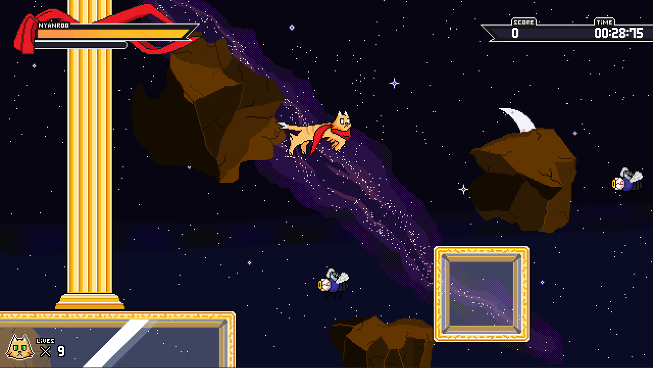 Nyanroo is a new platform game that pays homage to the 16-bit era.Chosen by a magic cloth you must face a gang of evil dogs trying to conquer the world. Gather different abilities with the help of the Power Yarns scattered through the world to slash and pounce your way through 14 stages and 7 amazing bosses.STORYA long time ago, the world was consumed by evil. To put an end to that, the gods themselves created a living magic cloth designed to give power to the one who wears it, the cloth searched for a warrior with a good heart, and with him they banished evil. With time.. the legends gave birth to what we call today as superheroes! But this story starts when the supervillain Iron Face and his pet dog Barkrow are about to defeat the current hero, Tornado Ted. Seeing his imminent defeat Ted decides to sacrifice himself in order to defeat Iron Face.Barkrow survives the attack, and swears revenge! Meanwhile, the living cloth chooses Nyanroo as the new hero! Now, as Barkrow gathers together the most powerful dogs to aid him, Nyanroo must fight back and stop them from taking over the world!MUSICThe soundtrack to Nyanroo was composed by The Super Marcato Bros. They are the brotherly duo of Karl & Will Brueggemann. The sound of Nyanroo was inspired by many beloved, groovy Genesis-era soundtracks, with some fresh elements mixed in as well. Далее