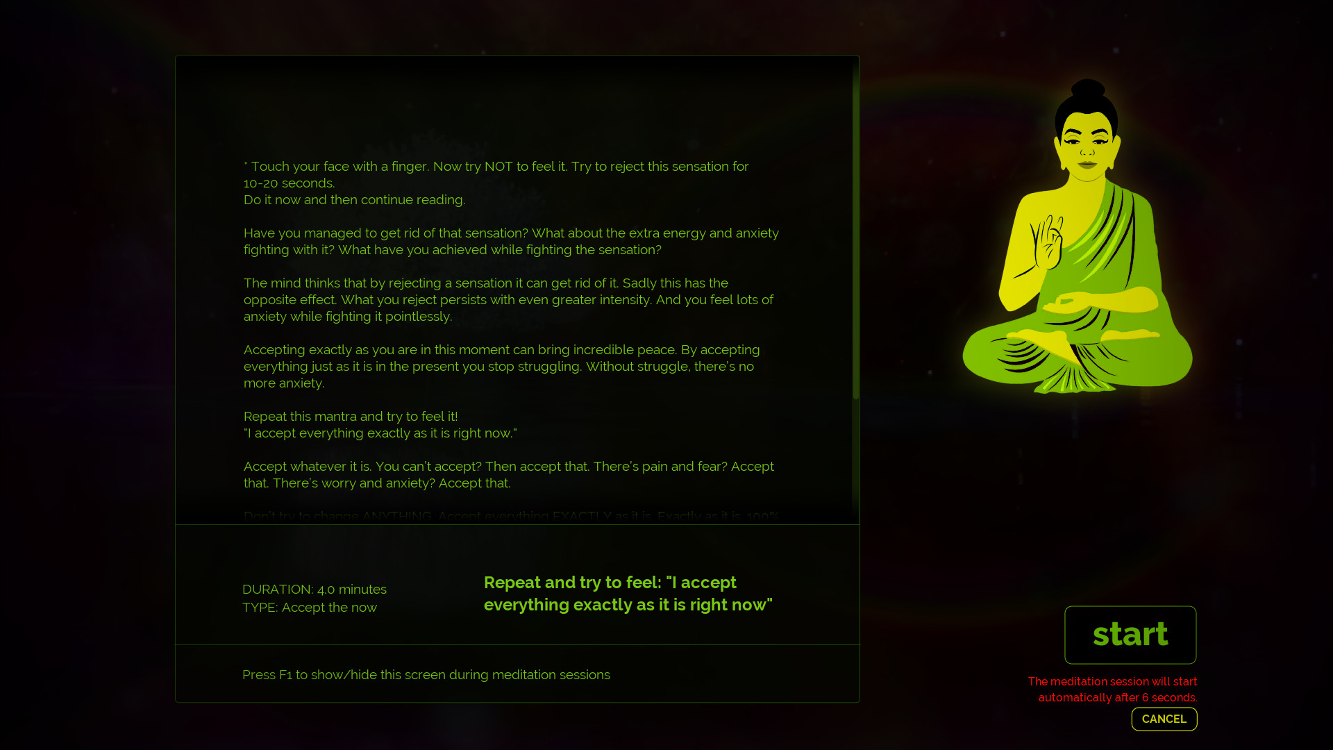 Easily improve your mental well being. Enjoy the benefits of healthy meditation practices in this unique game! Discover new ways to gain inner peace and relaxation. Rediscover the joy of life and the joy of being. The innovative quick meditation series offers you a convenient way of practicing daily! In a mater of 10-20 minutes you'll reap the rewards from carefully selected meditation techniques! Why I built this game for you and me. I made this game to help me with my overall mental state. In it I've put the best meditation techniques I've been taught and some discovered on my own. It's like a gym with various machines, but for your mind. Just like a gym I've designed it to be as pleasant and as efficient as possible.It's just a part of the answer. It's not a miracle cure or "a fast way to reach Nirvana in just 10 minutes". It's there to help you but it won't do your work for you. It will however make the practice of meditation easier and more pleasant!TO BE HUMAN IS TO SUFFER. Suffering comes in many forms but mental suffering is the most widespread. Depression, Anxiety, Panic Attacks, Worry, Grief, a huge amount of mental illnesses (OCD, ADHD, Bipolar Disorder, Psychoses, etc).Meditation and other mindfulness techniques can and will reduce the amount of mental suffering. These techniques, once learned, will stay with you forever. They will help you enjoy a more peaceful and happier life.Gamitate is designed to help you in 2 ways: 1) Teach you as many techniques as possible in an easy and FUN way. 2) Provide you with a pleasant environment to practice various meditation and mindfulness techniques. The techniques taught in this game come from a variety of sources: personal experiences, books, articles, etc. Some of them will work better for you than others. We're all cut from a different cloth so it's perfectly normal. You don't need to “master” each and every meditation technique. Just go through them all and stick with the ones that work best in your specific case. Note: Meditation doesn't replace medication and therapy. If you suffer from a mental illness visit a mental health specialist, such as a psychiatrist or psychologist. Don't stop taking your prescribed medication unless your doctor tells you to. It may be tempting to try to “cure yourself” through meditation but it's always a bad idea, especially if you suffer from a serious mental disorder. Please be aware that there are a handful of articles and studies which say that for a small number of people meditation may be harmful. If you experience negative side effects from meditation please STOP immediately. Далее