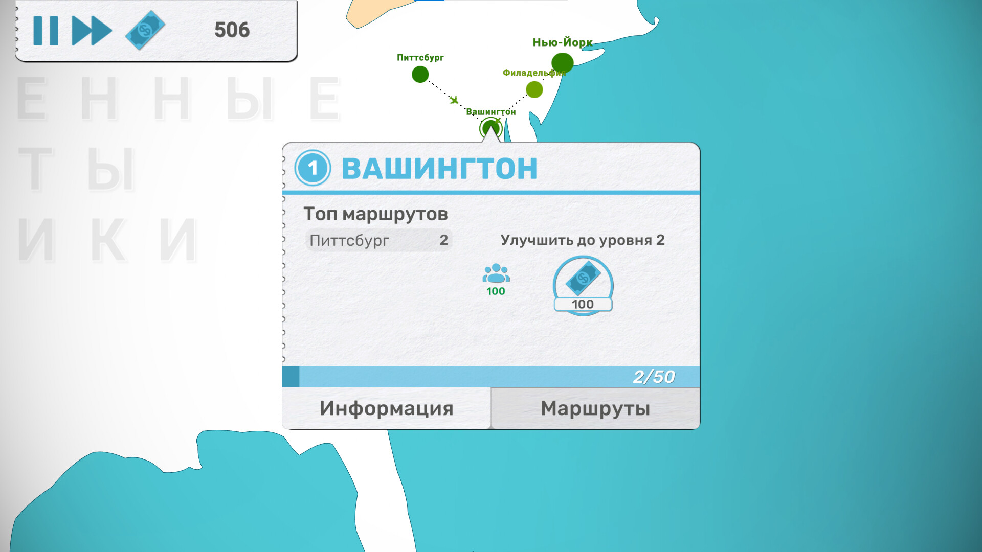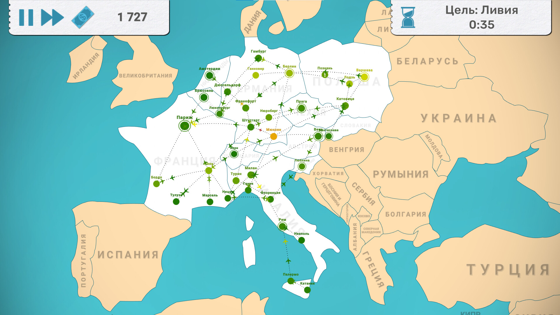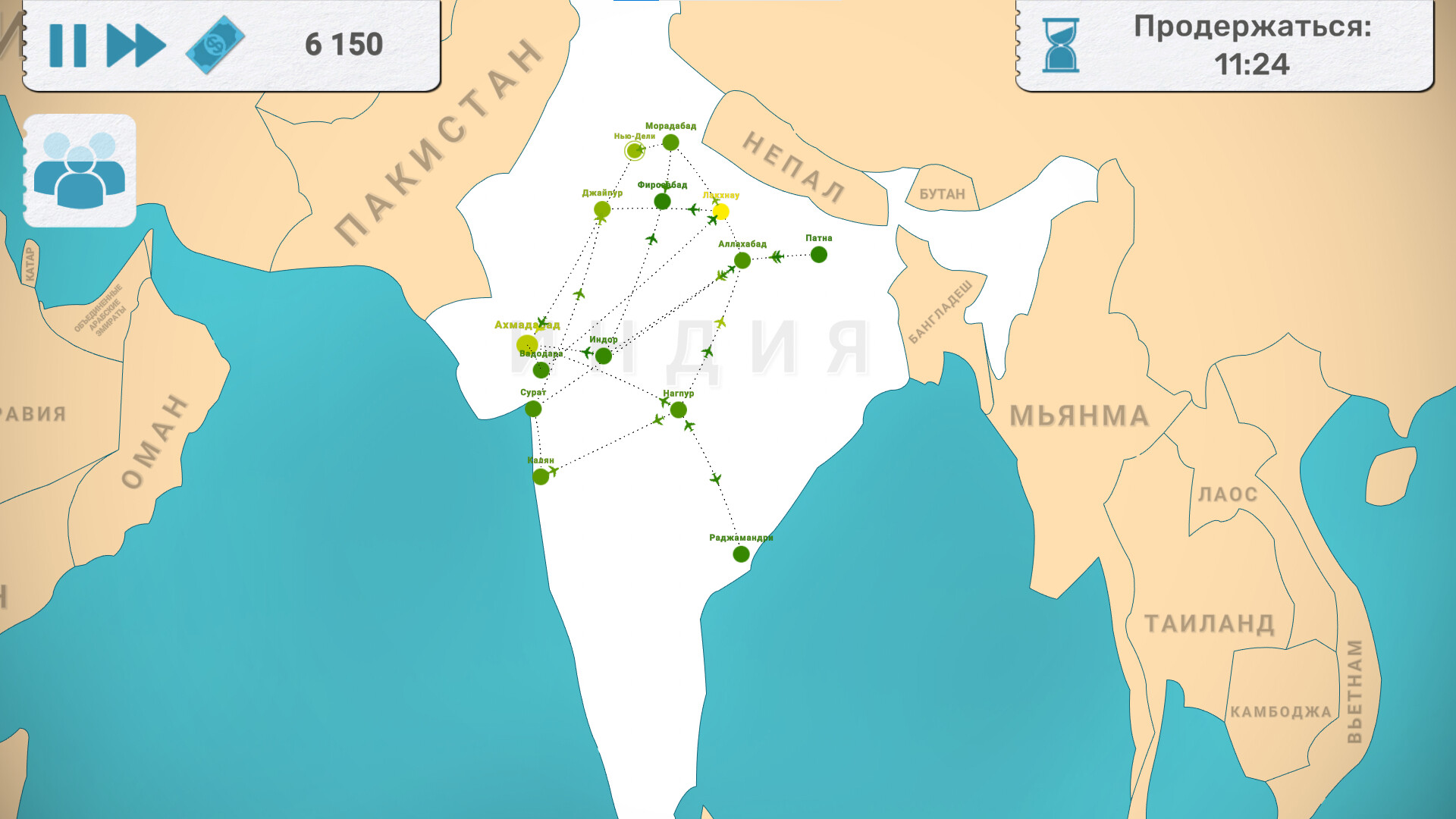 Развивайте свою авиационную транспортную сеть в разных городах и странах: стройте маршруты, запускайте новые самолёты, улучшайте самолеты и аэропорты!.. В игре реализована проработанная система пассажиропотока. Все города реальны, а их население соответствует действительности. Чем больше население, тем больше жителей этого города хотят куда-нибудь полететь. У каждого пассажира есть свой пункт назначения и, если вы не построили прямой маршрут, он будет лететь с пересадками. Вам всегда будет не хватать денег, чтобы соединить каждый город с каждым и сделать прямые рейсы, поэтому придётся грамотно анализировать, как соединить города наиболее эффективным способом, где будет находиться пересадочный узел. Как и у самолетов, у каждого аэропорта есть максимальный уровень вместимости пассажиров. Если хотя бы один аэропорт будет перегружен, вы проиграете. Вам доступны почти две сотни территорий по всему земному шару и десятки тысяч городов! В каждом из них можно построить аэропорт и начать перевозку пассажиров. Разные локации подразумевают разную тактику игры: в Европе очень просто соединять города и создавать много пересадочных узлов, так как расстояния небольшие, а вот над соединением сильно удаленных городов предстоит подумать, ведь чем длиннее маршрут, тем больше стоимость его запуска. Задача игрока в режиме «Откройте весь мир» - открыть все территории мира (открытие территорий стоит внутриигровых денег), покрыв своей транспортной сетью всю планету. В этом режиме новую территорию надо открывать каждые 6 минут, иначе вы проиграете.Сценарии – это совершенно разные уровни с определёнными начальными параметрами и целями. Например, продержаться определенное время или заработать необходимую сумму денег. Каждый сценарий уникален - где-то придется успевать подсоединять быстро открывающиеся города, а в другом - перестраивать свою сеть из-за запрета авиарейсов по причине эпидемии вируса на определенной территории. Также в игре есть ежедневные сценарии. Каждый день появляется новый сценарий, и вам нужно поспешить, чтобы занять место в списке рекордов игроков!. Иногда будут происходить случайные события. Они могут быть положительными (например, инвестиции в Вашу компанию), но могут быть и отрицательными (катастрофы, блокирующие полёты в какие-либо территории или из них), а возможно, и достаточно нелепыми (бизнесмен подал на вас в суд из-за того, что самолёт трясло в зоне турбулентности, и он разлил на себя кофе!). Вы никогда точно не знаете, чего ждать. . В игру добавлен богатый на возможности редактор пользовательских сценариев. Любой игрок может создать и опубликовать свой сценарий на сервер или сыграть в сценарии, выложенные другими игроками. Это позволяет игрокам создать бесконечное количество нового контента. Далее