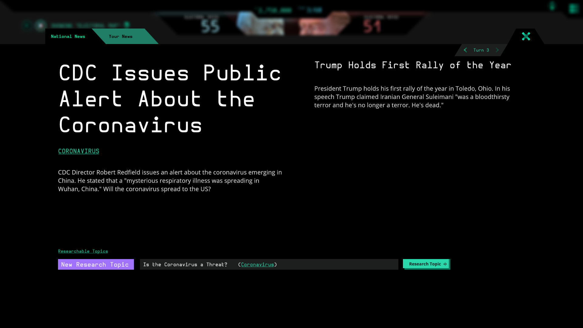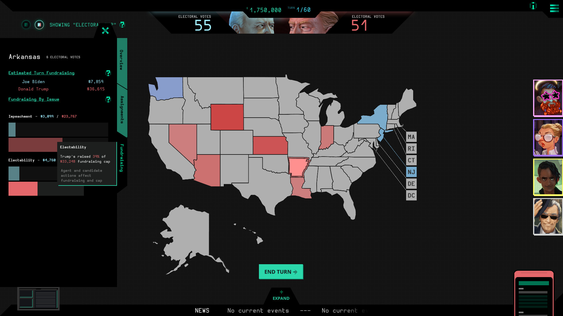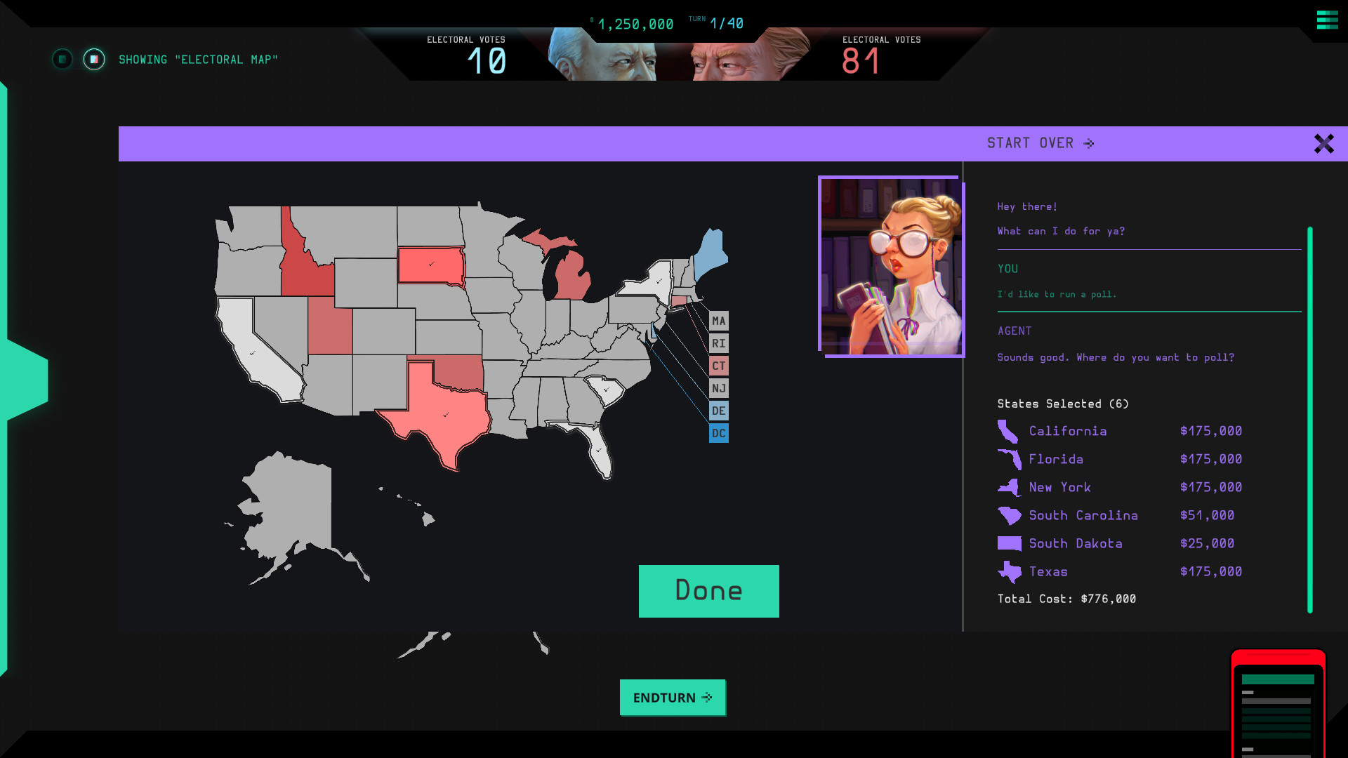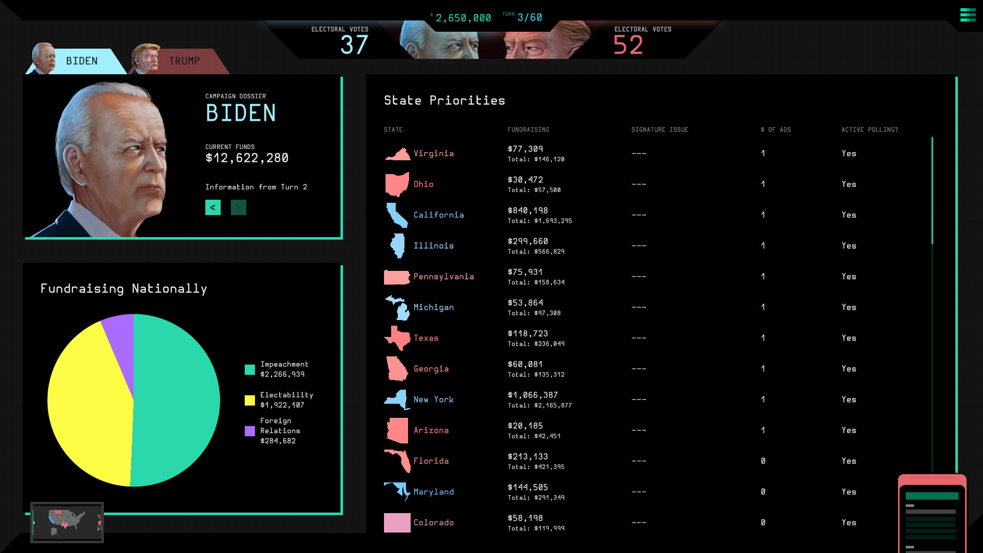 OverviewElectioneering is, at its core, a strategy game. The map is shrouded under a Fog of War, and as you pierce that Fog, you'll start to develop more specific strategies. We don't tell you how to run your strategy; there's no winning argument. Voters change; if you keep pounding things into them, there's a chance they'll respond. Well, if you can overcome their starting biases, challenging but possible! Key FeaturesElection simulator with virtual voters making the decision on who wins and who loses! There's no simple algorithm weighing how you're doing, it's all voter driven. Real world events from 2020.Procedurally generated voters. Up to 51,000. We have 15 distinct base voter profiles, from which we generate thousands of variants when you start a new game!Choose your Candidate and get them elected.Fog of War, neither you nor the Candidates ever see the true electoral map.Adapt your campaign to a dozen Issues such as Covid-19, Impeachment of Trump, and many more.Engage Dark Web Agents, Social Engineer, the Researcher, the Hacker, and the InfiltratorHack the Candidates and steal their plans.Research and choose the topics to spin in the media.Lie to the voters with ads.Hand-drawn Characters.As the Electioneer, your focus is on changing voter opinion to win votes for the candidate you support. 2020 has been a busy year. Events such as Trump's Impeachment or the COVID-19 outbreak create new issues for the voters to consider. As things unfold, you research topics within each new issue, such as Trump's acquittal and the first Covid-19 case in America, and make strategic ad buys to sway voters. While you're off spinning the issues, the candidates don't even know you exist. Their goal is to crush each other, just like the actual election. They apply strategies designed to win over voters using any method they can to win. Your job is to learn what voters think by taking out polls, hacking the candidates, and stealing information from their campaign! Making sure your candidate comes out on top is not going to be easy. The landscape is changing; electioneering mimics this new environment, asking users to choose between hundreds of different Events, Issues, Topics, and Arguments (spin) to reshape the conversation and even the country.StoryIt's been 4 years since you last got this phone call. It's time. America is choosing a new leader, and the world is watching. Some of us are doing more than watching; we're falsifying information, we're spreading lies. We're Electioneering. This time it's Trump and Biden; it's your job to use all the resources at your disposal to make sure that your candidate wins. Can you convince the voters to ignore what they see, ignore what they feel, and vote your way? Can you lie, cheat, and steal this election? We'll give you a weekly stipend and some contacts; the rest is up to you. If you get caught, we don't know you. If you lose, well. These aren't the kind of people you want to disappoint. Далее