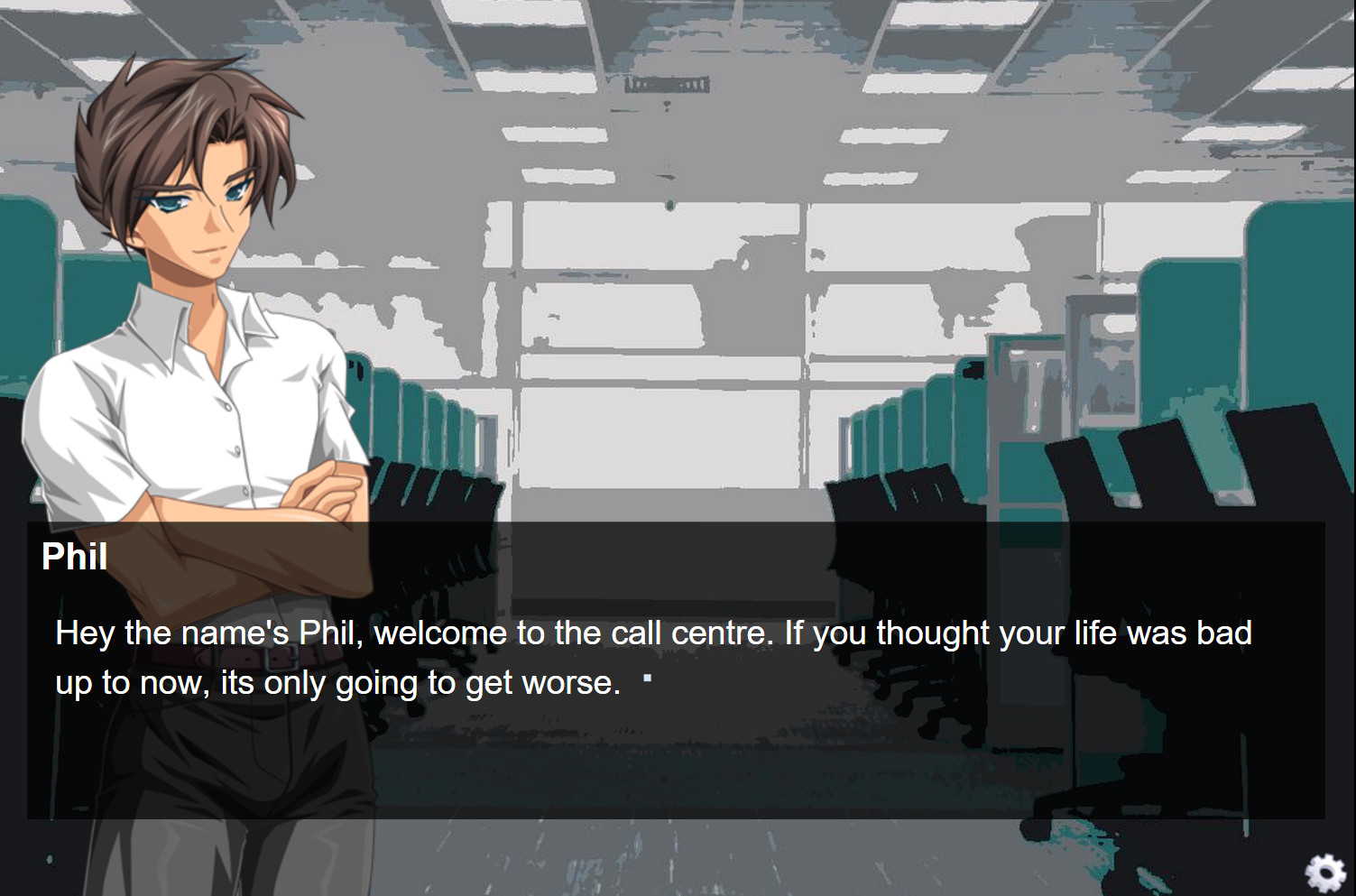 The Call Centre is a Visual Novel game in which you take the role of a call centre agent on their first day of the job ready to take calls from customers having technical issues. You'll help identify and solve their problems. Or maybe not. Features-Different customers with their own problems and personalities. -Multiple choices of how to respond to each call -Hilarious scenarios and responses -Input from your fellow colleagues -Performance will be reviewed This is a fantastic opportunity if you want to get yourself in a new role. You don't need years of call centre experience to join the team; just desperation enough to do the job. Please, please APPLY ASAP Далее