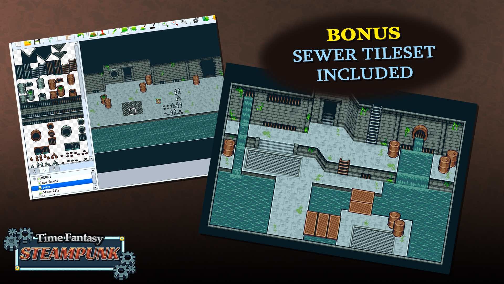 It's the industrial revolution! Create a steampunk city with this tileset expansion pack. A steam train tileset; for the engine itself and the inside of the train cars. New city buildings, with interior sets inspired by the Victorian era. A dungeon full of pipes and valves, and animated gear mechanisms. Bring it all to life with animated smoke and steam effects. And as a special bonus, this pack includes a sewer tileset. Features: * City buildings in the style of the industrial revolution (three color variations) * Steam trains: outside and inside * Victorian-inspired interiors * Dungeons full of pipes, valves, and clockwork mechanisms * Animated smoke and steam effects, and animated gears * Bonus: Sewer tileset * Formatted for RPG Maker VX/Ace, RPG Maker MV and RPG Maker MZ! * For use in RPG Maker Series or the engine of your choice Далее