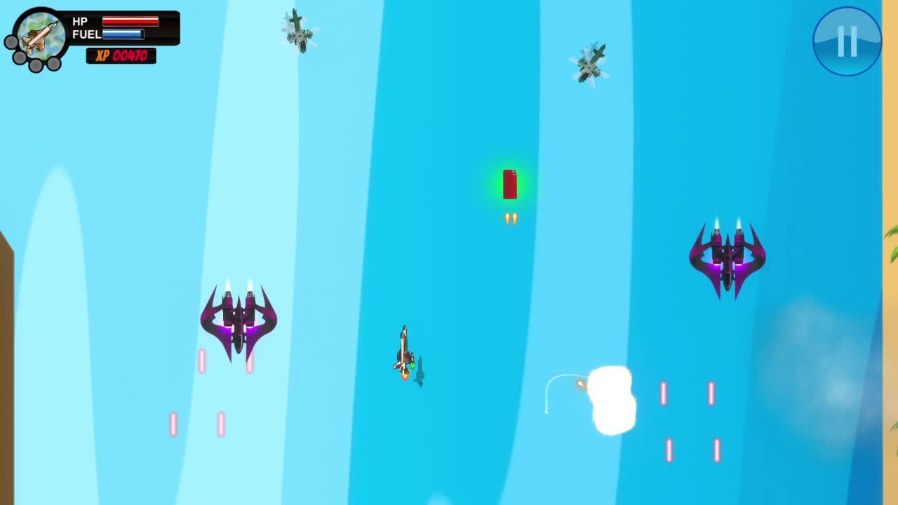 make Your Way to victory... River Attack is a shootting up style game 2D that combines harmoniously colored scenes with aerial shooting battles! Evolve your ship to defeat an alien invasion that has the technology to control human combat vehicles.Control a jet in top down view, shoot and destroy enemy ships by deflecting as many enemy shots as you can.In 2020 an alien invasion ravages the planet Earth and no weapon is effective against the space ships, as they have the technology to control human combat vehicles. Oliver, an aeronautical engineer, manages to adapt a ship so that it is not controlled by the aliens and is humanity's only hope. He seeks to rescue his girlfriend Marjorie, who is a pilot and was abducted in combat. Will you be able to help Oliver rescue his girl and save the planet?featuring: levels with different colors representing different times of the day. Intense shooting battles using 2D physics (shock waves caused by explosions). Colorful and well-made graphics Epic old Rock soundtracks. Evolve your ship into 6 different atributes: Health Points -This Affects the size of the jet life bar Missile Fuel -This affects the missile duration time after launching Missile Perfomance – This affects missile speed and missile curvature Missile Cooldown – This affects the recharge time of each missile Machine Gun – This affects fire rate, shot impulse and amount of bullets Jet Fuel – This affects the capacity of the jet gasoline tank. Далее