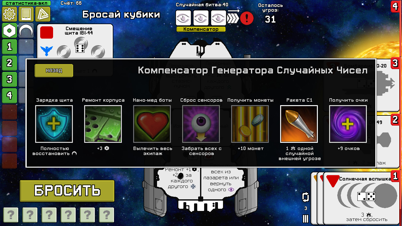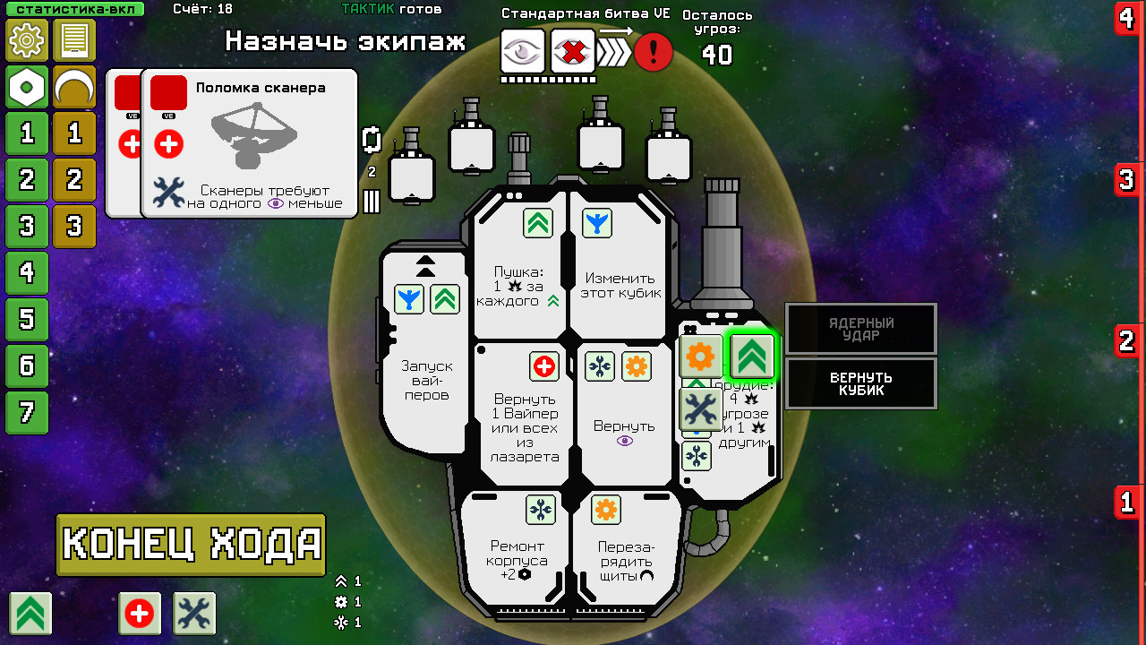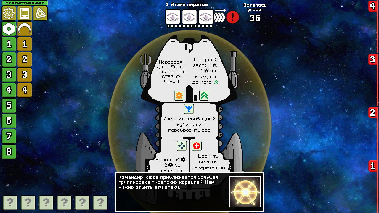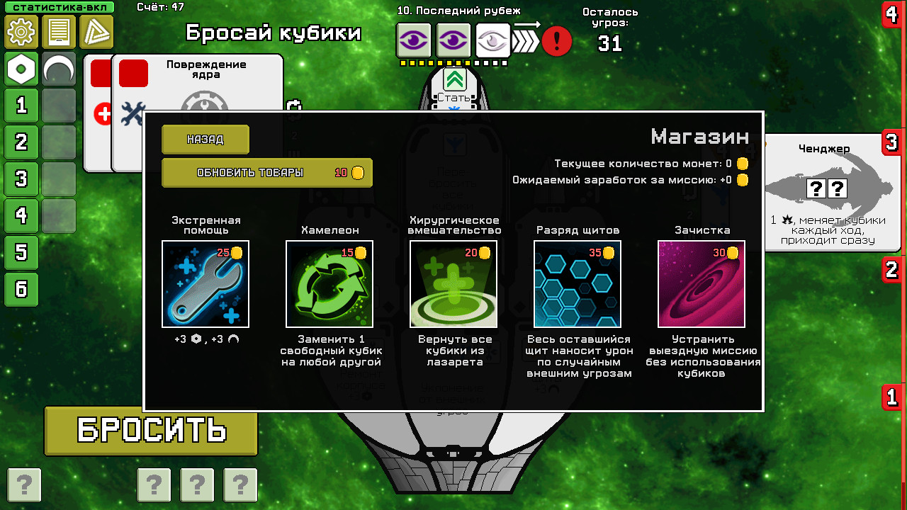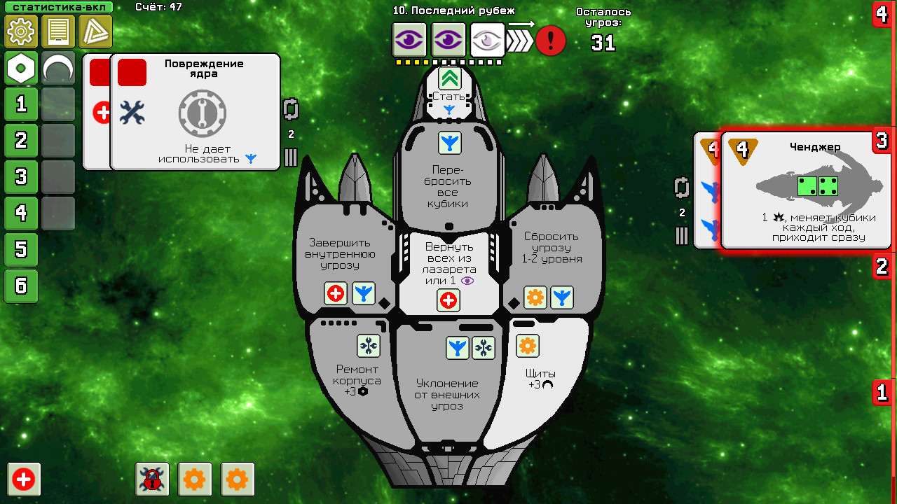 Dee-6: Dice Defenders - тактическая настольная игра, в которой вы почувствуете себя в роли командира космического корабля с экипажем в виде 6 кубиков. Каждый кубик имеет свою роль, в зависимости от выпавшего на нём значения (например: стрельба корабельными лазерами, восстановление щитов, ремонт корпуса, лечение раненых кубиков и другое). Вам необходимо продержаться под натиском постоянно прибывающих угроз, чтобы успешно завершить полёт. Эти угрозы бывают внешними (пиратские корабли, астероидные поля, туманности) и внутренними (абордажники, пространственные аномалии и даже инопланентные паразиты!). Выполняя миссии, вы будете накапливать монеты, которые позволят оплачивать услуги наёмников для исправления критических ситуаций в вашу пользу. В конце каждой миссии вам предстоит схватка с боссами, имеющими уникальные особенности. Ключевые особенности: * Проходите миссии и открывайте новые угрозы. Более 200 видов угроз! * Разблокируйте все 6 кораблей, каждый со своим уникальным стилем игры. * Играйте в 5 разных игровых режимов, среди которых кампания и случайная битва. * Выполняйте достижения и получайте за это монеты. 63 достижения! * Побеждайте в сражениях и улучшайте свою статистику. Карьерный рост даст вам больше монет и очков! * Легко модифицировать. Вы легко сможете создавать свои угрозы и миссии, также перевод на свой родной язык. Данная игра не имеет никакого официального отношения к разработчикам настольной игры Deep Space D-6, её создателям TauLeaderGames, а также к Tony Go (но она, несомненно, вдохновлена ею). Далее