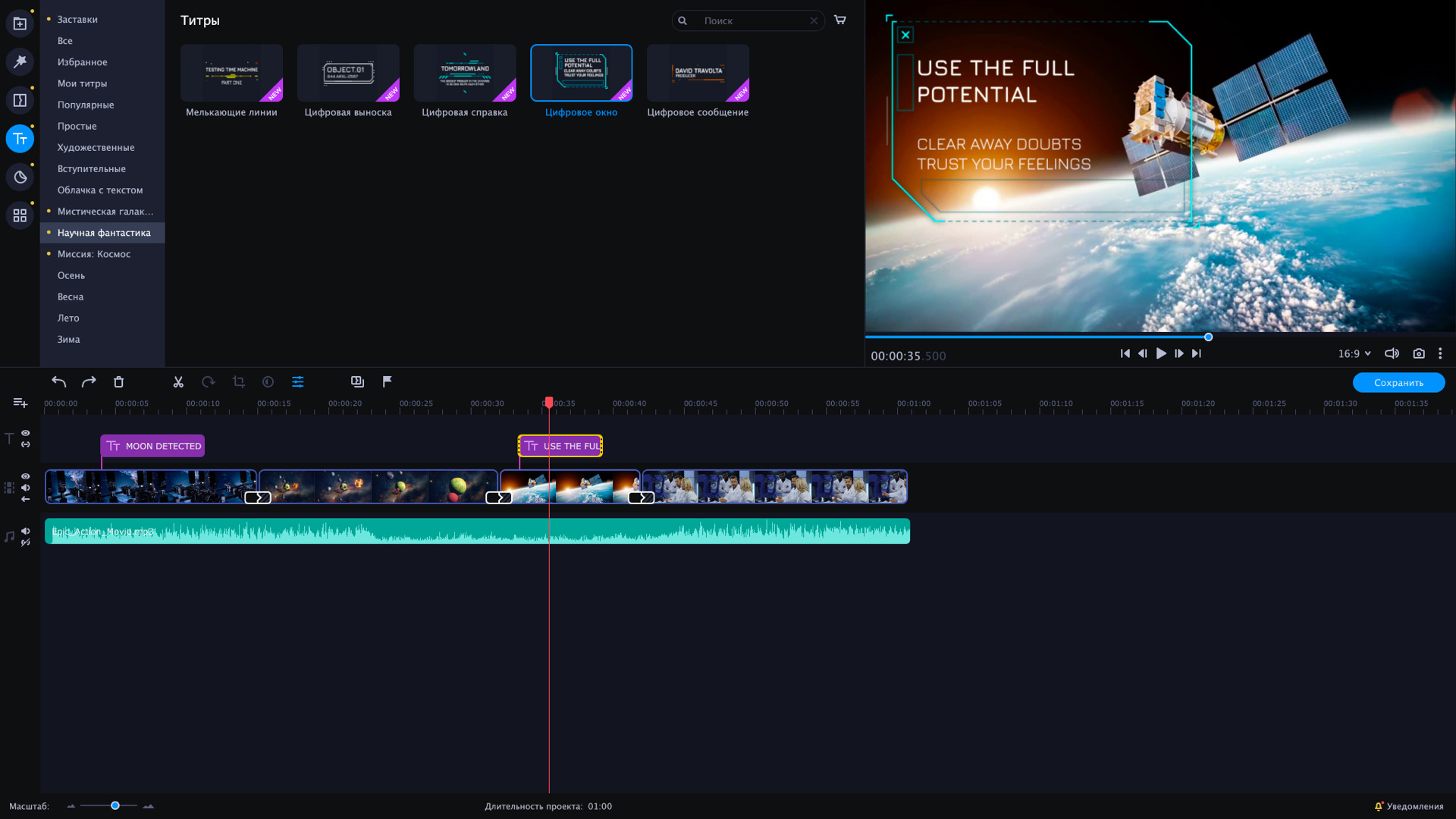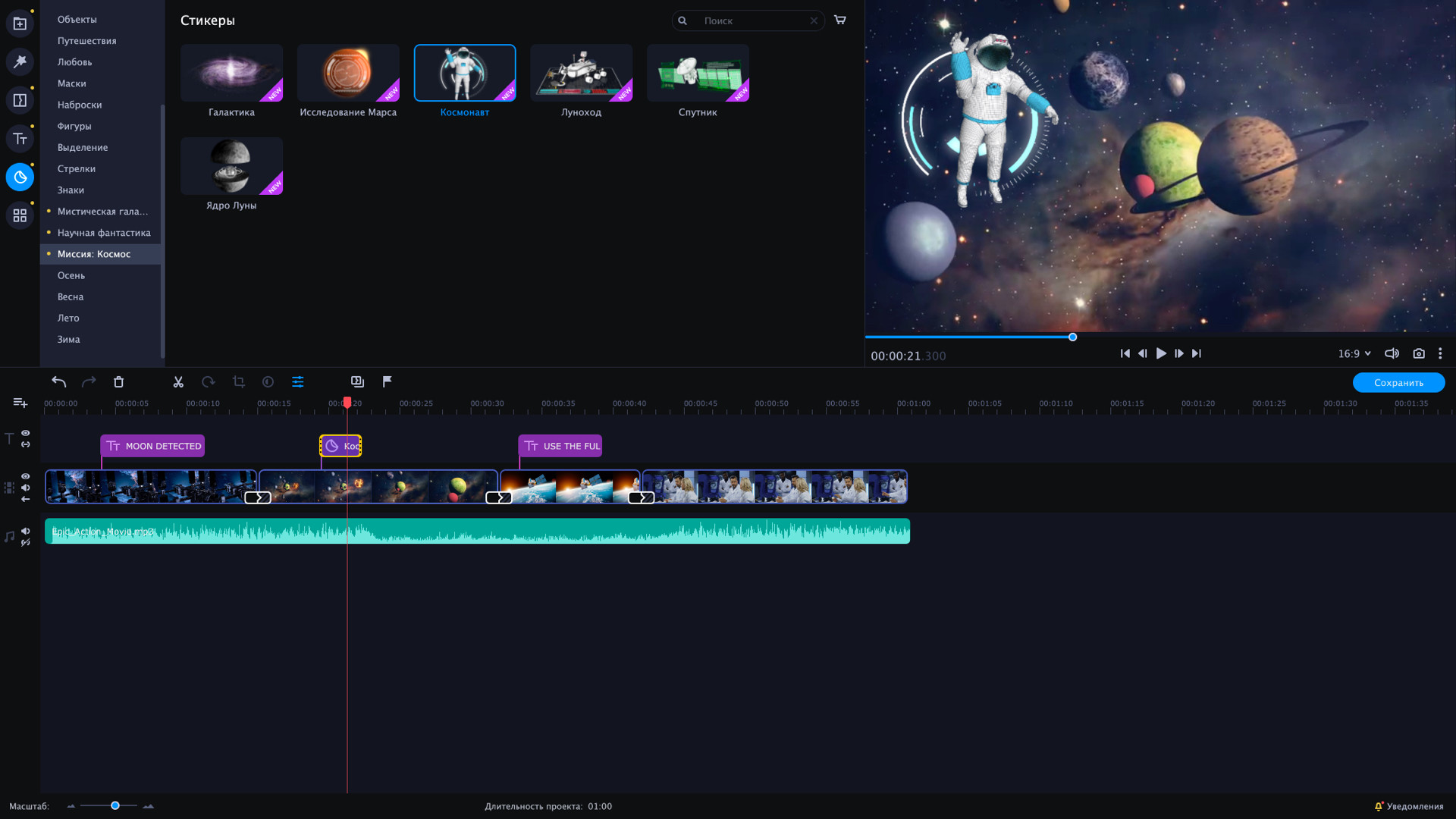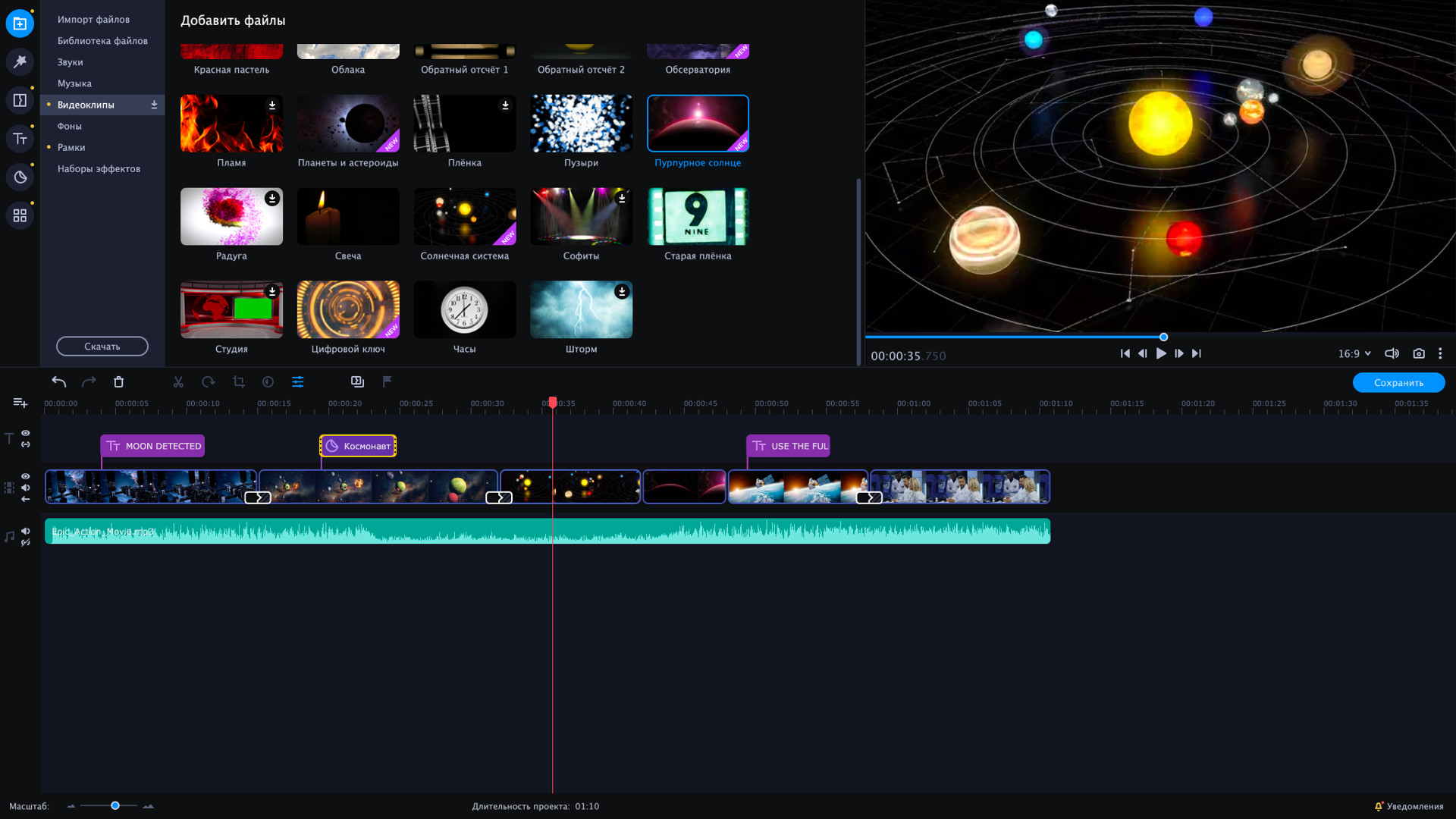Исследуйте таинственные планеты и параллельные вселенные с этим межзвездным набором.Ваше приключение будет полно неожиданных открытий и находок. Добавляйте космические эффекты и пробуйте переходы в стиле киберпанк во время миссии в открытом космосе. Изучайте новые планеты и записывайте их геоданные.В наборе 4 пакета эффектов:Научная фантастикаМиссия: космосМистическая галактикаНабор заставок VHSНабор включает:16 титров44 стикеров10 фонов3 перехода11 интро1 рамкуЭтот DLC набор совместим с Movavi Video Editor Plus 2021. Далее