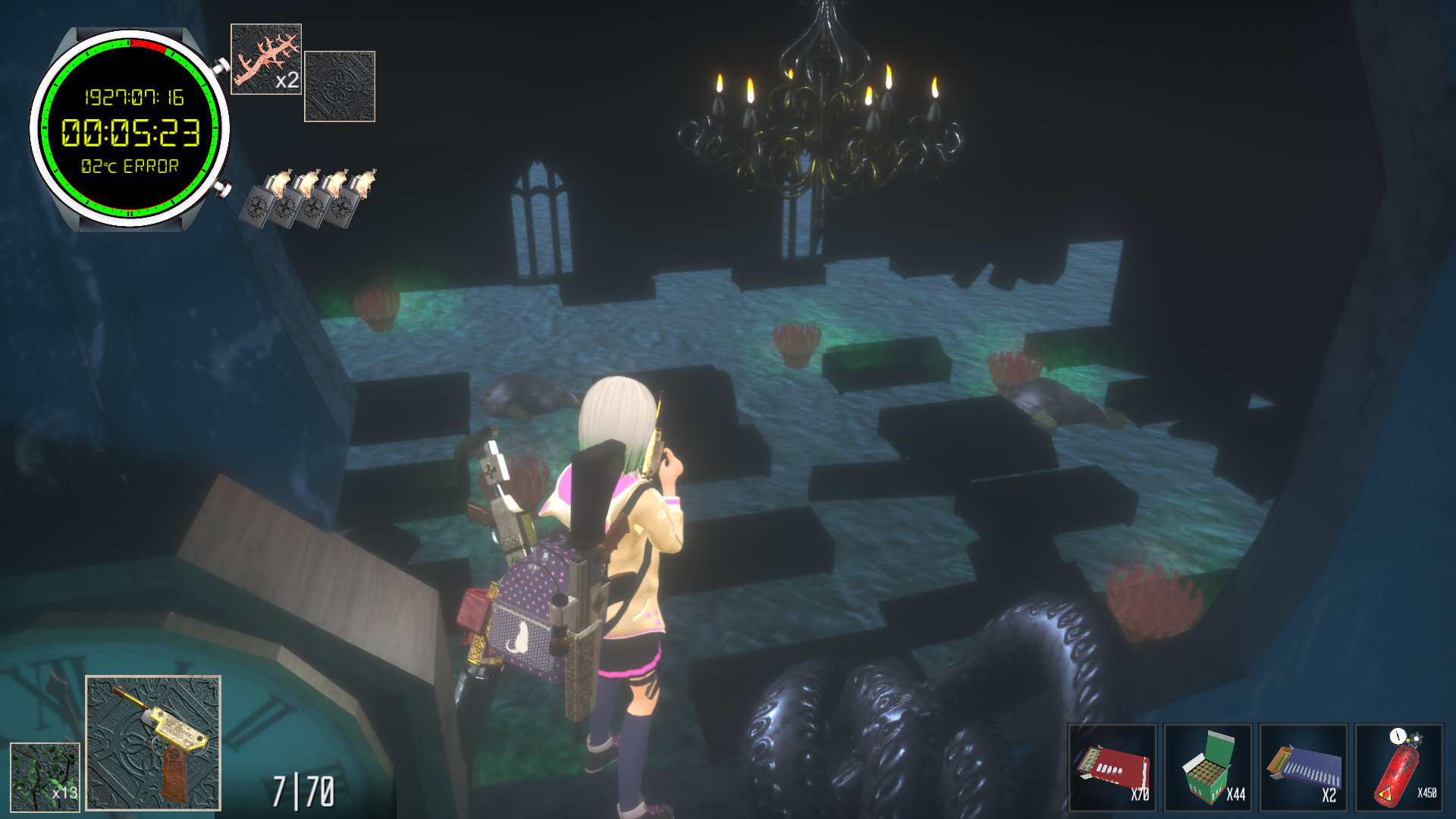 Exploration Section. For the 600 seconds that remain until the day changes, Mutsuki can explore the church inside this tranquil dream world.Arm Mutsuki with guns, ammunition, and fire bottles to boost their fighting strength.Health boosting red mint and health recovering green mint will help to stave off the risk of death.Doors blocked by coral can be opened with coral keys.Some walls can also be damaged by guns, and there are bookshelves that can be interacted with to reveal hidden items.In addition to the 4 guns hidden inside the church, there are another 4 special shining weapons as well.Combat Section. After 600 seconds have passed, a new day begins and it's time to press into the submerged church.Mutsuki must search for the bell that will grant an audience with the lord of this nightmare, all while battling, or evading, the monsters that block the way.Dying inside this nightmare resets everything, and starts the dream over from 23:50 on the 15th of July 1927.There are no weapons to be found during the combat section, which makes your actions during the exploration section of vital importance.There is however ammunition and recovery items to find, some of which can be discovered in secret rooms, making exploration an important factor of this nightmare section as well.Regarding language in the game. There is no dialogue or narration in this game, in text or in voice, only a simple controls manual in English.Relation to the Cthulhu Mythos. 600 Seconds ~The Deep Church~ is partly based on the Cthulhu Mythos, a fictional universe primarily derived from the works of the authors H.P. Lovecraft and August Derleth.It is not solely based on the Cthulhu Mythos however, as it also contains aspects of its own original setting, as well as allusions to works besides those listed above. Далее