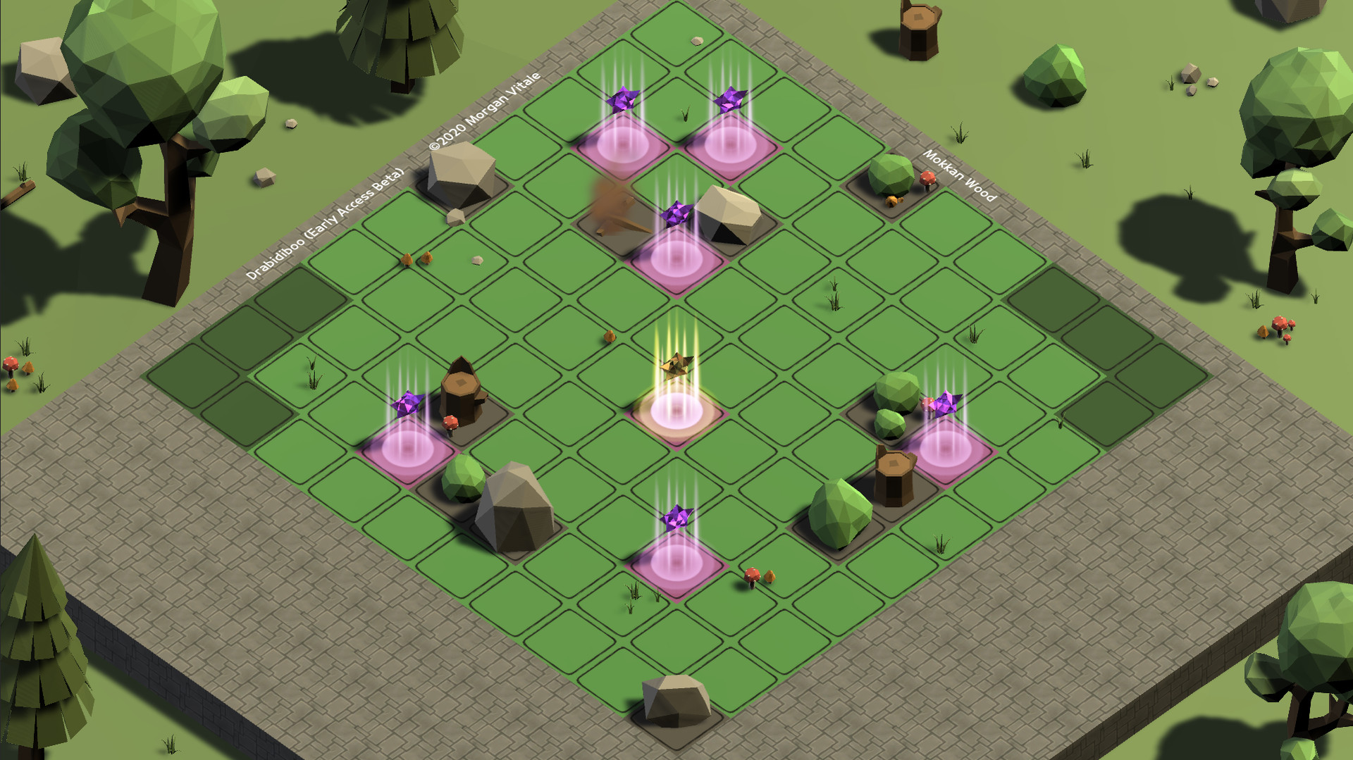 Drabidiboo is a turn-based strategy game of prediction with a strong meta component, containing a large set of Pets to collect and use to build up your team.Learn to play in 30 seconds!. A match is played by 2 players on a board of 10x10 tiles, locally against the AI or via internet with a random opponent.Each player must form a team of 4 Pets; to keep the game balanced, each Pet has a cost (crystals) and both players can spend only a given amount of them to form the team.You win if you own more Star Gems than your opponent when the last one is collected.You lose if each of your pets faint.Win and loss conditions are always evaluated at the end of the turn.The match is made up of rounds. A round has 2 phases: DECLARE and RESOLVE.During the declare phase, you must give an order to each of your Pets. Simultaneously your opponent will do the same.PLEASE NOTE: you don't know what your opponent is about to declare and vice versa. This is a game of prediction!(You can declare an order using the Pet cards that surround the board)You are blue. Your opponent is red.During an order you can declare: when to act (last / first) where to go (movement) to turn or not (rotation) what to do (action)Of course, you can also decide to skip one or all of these commands if you want your Pet to stand still. ;)That's all! Now you have all the info you need to play a match.Good luck! :) Далее