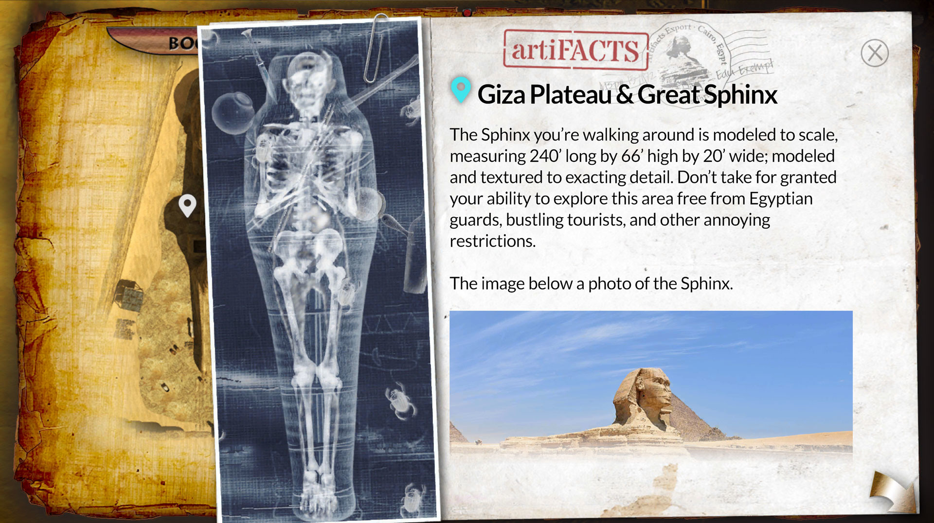 We are excited to unveil Riddle of the Sphinx's™ proprietary in-game hint and solutions system, known as the Book of the Dead-Ends™!The Book of the Dead-Ends™ is a nod to the real-world ancient Egyptian Book of the Dead; a collection of funerary scrolls. However, with the Book of the Dead Ends™, you can actually reveal the mysteries of ancient Egypt and ultimately solve the Riddle of the Sphinx!We've compiled all of the scrolls into one in-game, contextual tome featuring individual hint and solution scrolls linked to each area of your adventure. Not only will you discover overarching and very specific hints, but you will have instantaneous solutions to individual areas, items, and puzzles, as well as the solution to solving the whole adventure!Plus, we have included exclusive Developer's Notes and artiFACTS. Developer's Notes feature exclusive behind-the-scenes information, notes, and sketches. ArtiFACTS™ contain interesting factual, historical data relating to your current area.Unlock this invaluable treasure trove of riddle-revealing scrolls to further enhance your epic Egyptian adventure! (Hint: you may come to the point of needing to consult these papyrus sages if you get stuck.) Далее