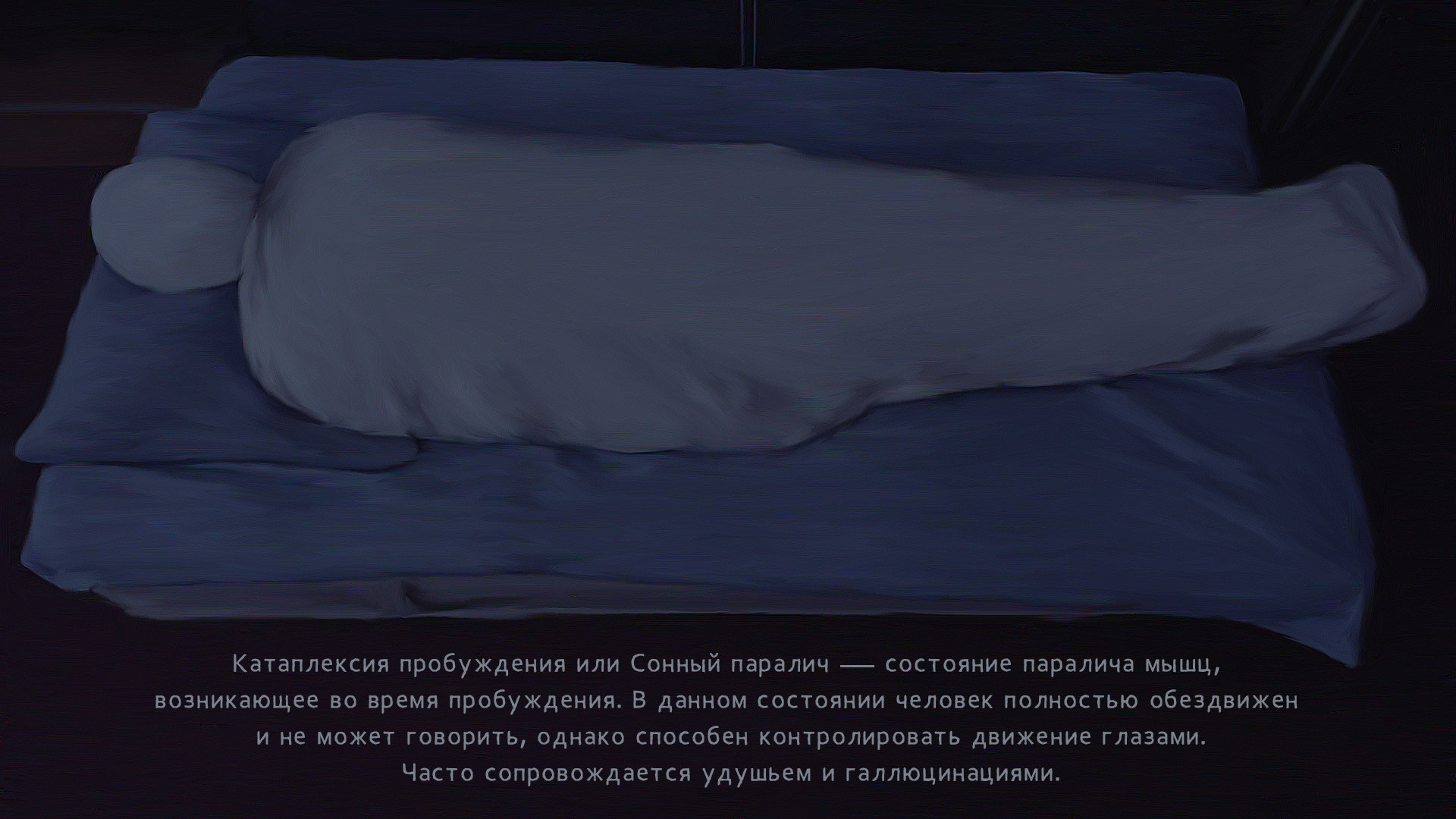 Катаплексия – это небольшая визуальная новелла, сочетающая в себе несовместимые жанры комедии и хоррора. Все зависит от выбранной интерпретации событий и настроя читателя. Поверить в мистичность происходящего или разглядеть логичные объяснения. Ужаснуться состоянием безысходности или посмеяться над комичностью ситуации. Решать вам. Хотя герою истории в любом случае придется несладко.Особенности: Возможность выбрать настроение повествования: ироничное или серьезное.Визиты различных потусторонних сущностей.Фоны, совмещающие галлюцинации с реальностью.Нестандартный взгляд на действительно существующее явление под названием Катаплексия.Многие фрагменты истории были основаны на личном опыте. Далее