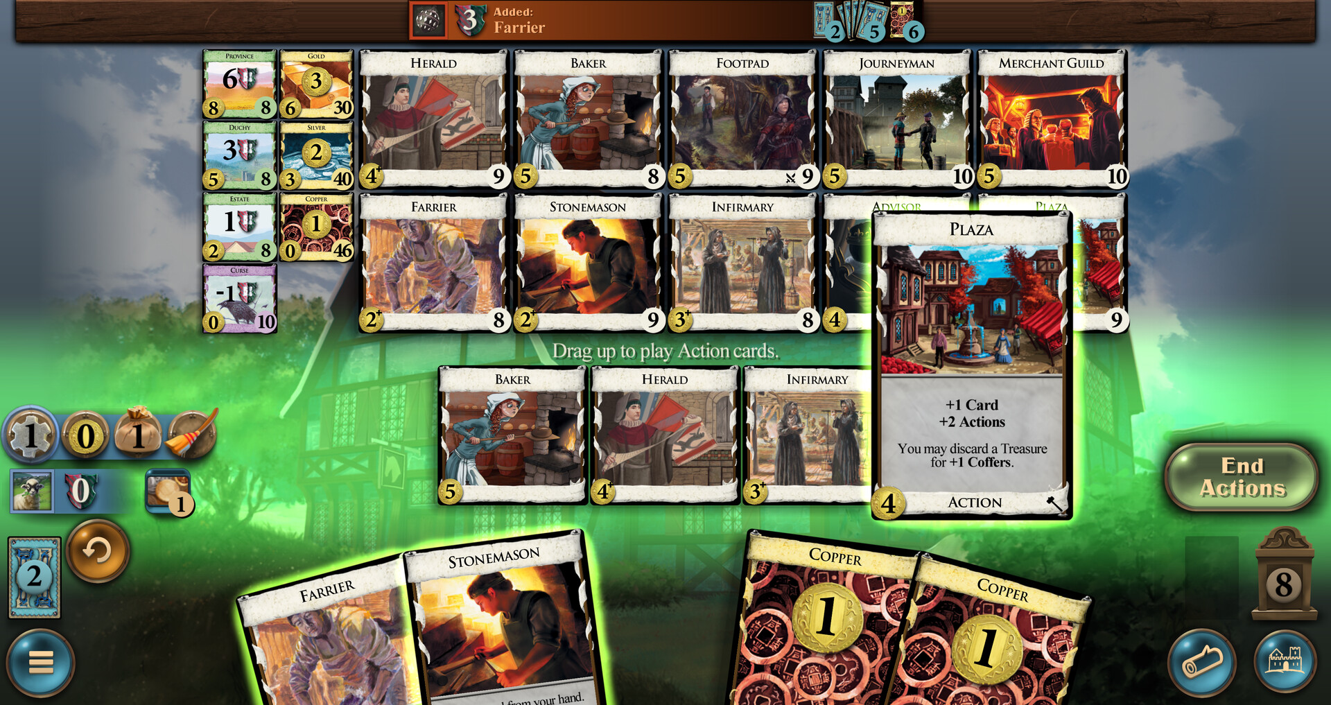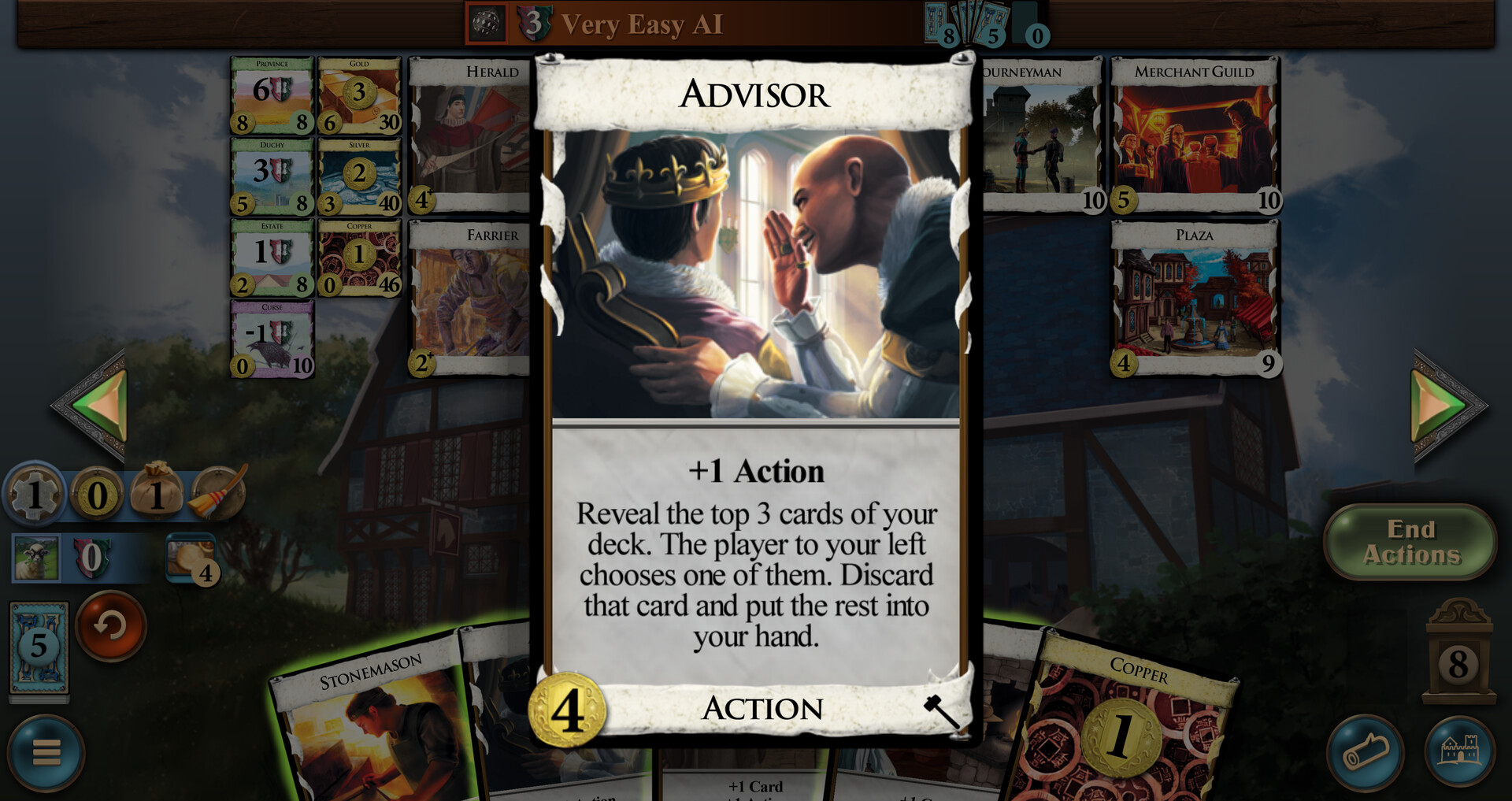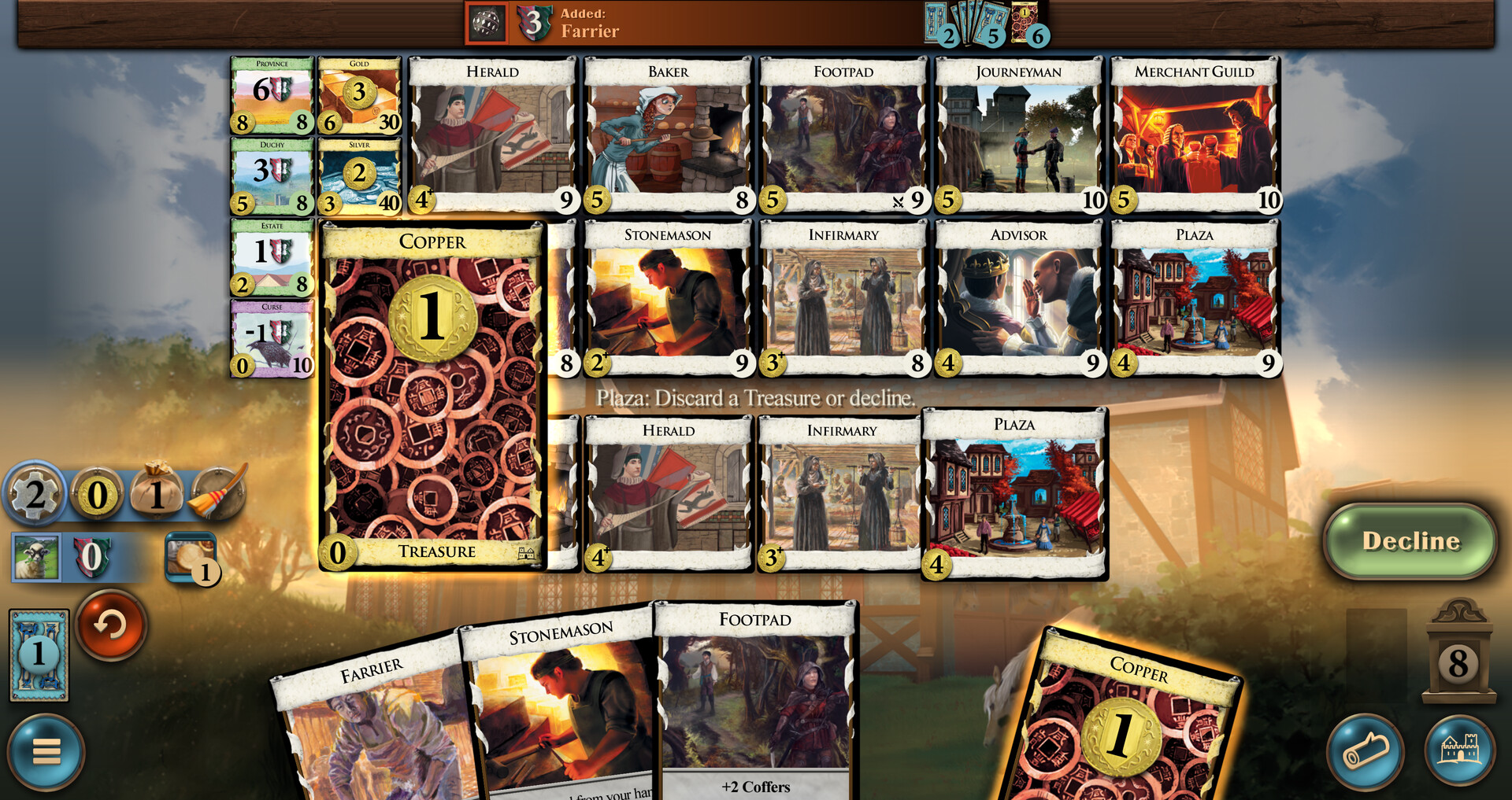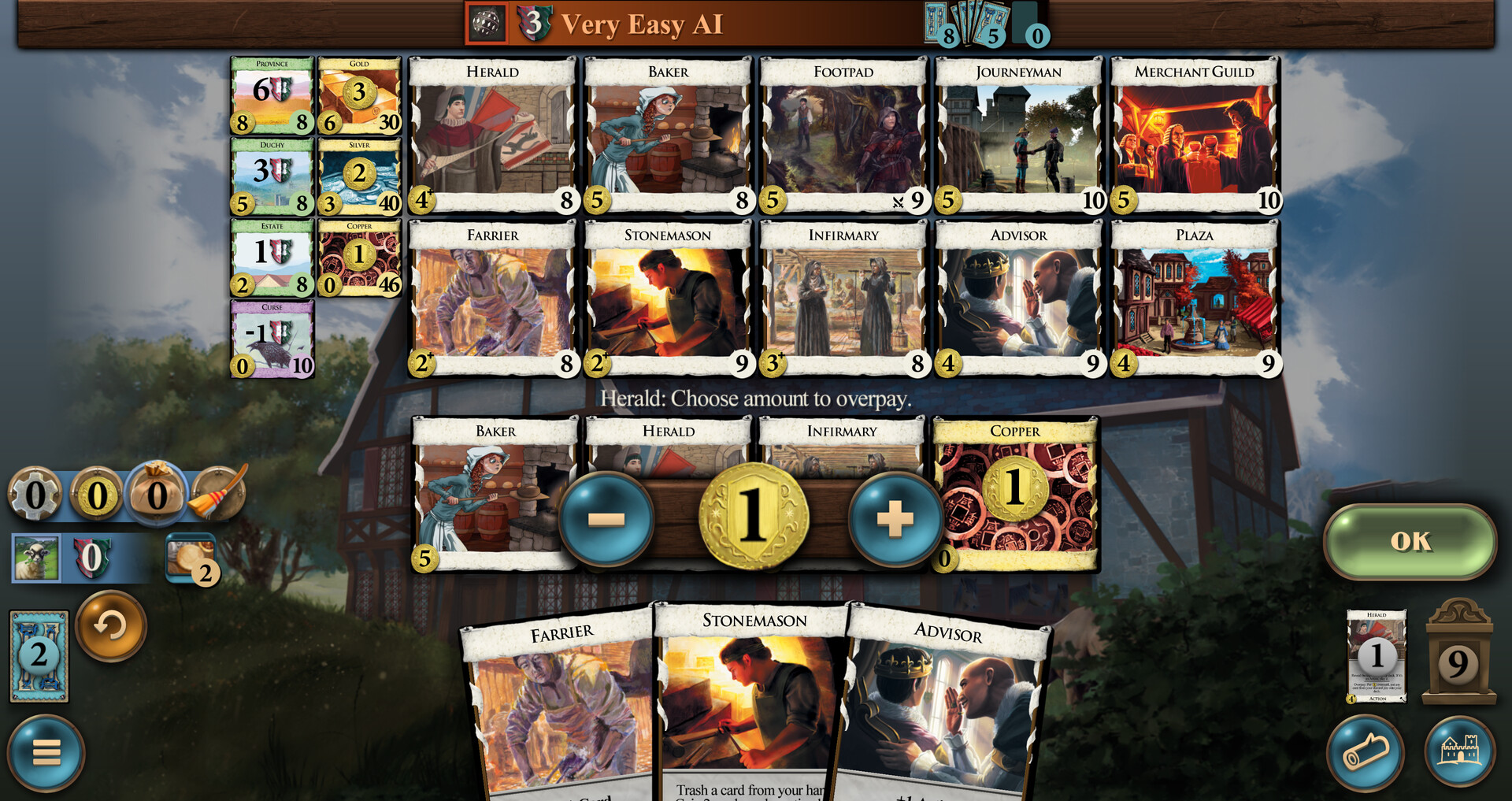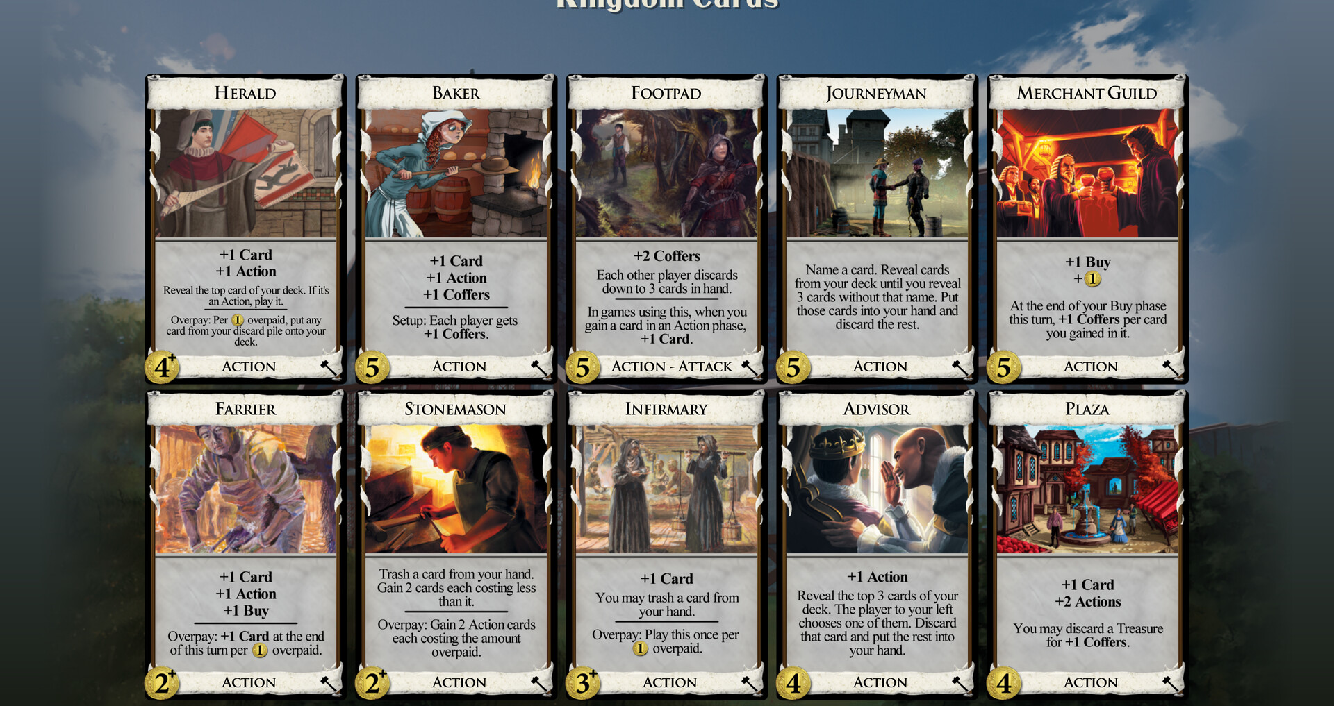 This is a small expansion, with Butchers, Bakers, and Candlestick Makers. Introduces Coffers, which are coins you can save for when you want to use them, and overpay, which lets you pay more for a card to get extra out of it.Some cards have an "overpay" ability. Such cards have a "+" next to their cost. You may pay additional coin when buying these cards. If you pay at least 1 coin extra, the card will trigger an ability.Players can accumulate Coffers. These are tracked on the Coffers counter. During the Buy phase, before buying a card, players can spend Coffers to increase their total. Unspent coffers are saved for future turns.Flavor. Jobs, everyone's worried about jobs. Whatever happened to tilling the fields in obscurity? The economy is just a trick, like stealing someone's nose, but lately people seem to have seen through it, like when you realize someone hasn't really stolen your nose. So now everyone's joining a guild, learning a craft, and working on a masterpiece – a painting so beautiful it blinds you, or a cheese grater so amazing that you never eat cheese again. The only people left tilling the fields are the ones doing it ironically. The guilds cover everything – ironic tilling, butchering, baking, candlestick making, shoemaking, cheesemaking, cheese destruction. Your advisor is convinced that somehow, control of the stonecutters is key to world domination. Very well. You will have stone handled so expertly that the world trembles before you.-- Donald X. VaccarinoFeatures. 13 Unique cards - small sized expansion13 Kingdom cards5 cards using Coffers4 cards with OverpayMedium complexity Далее