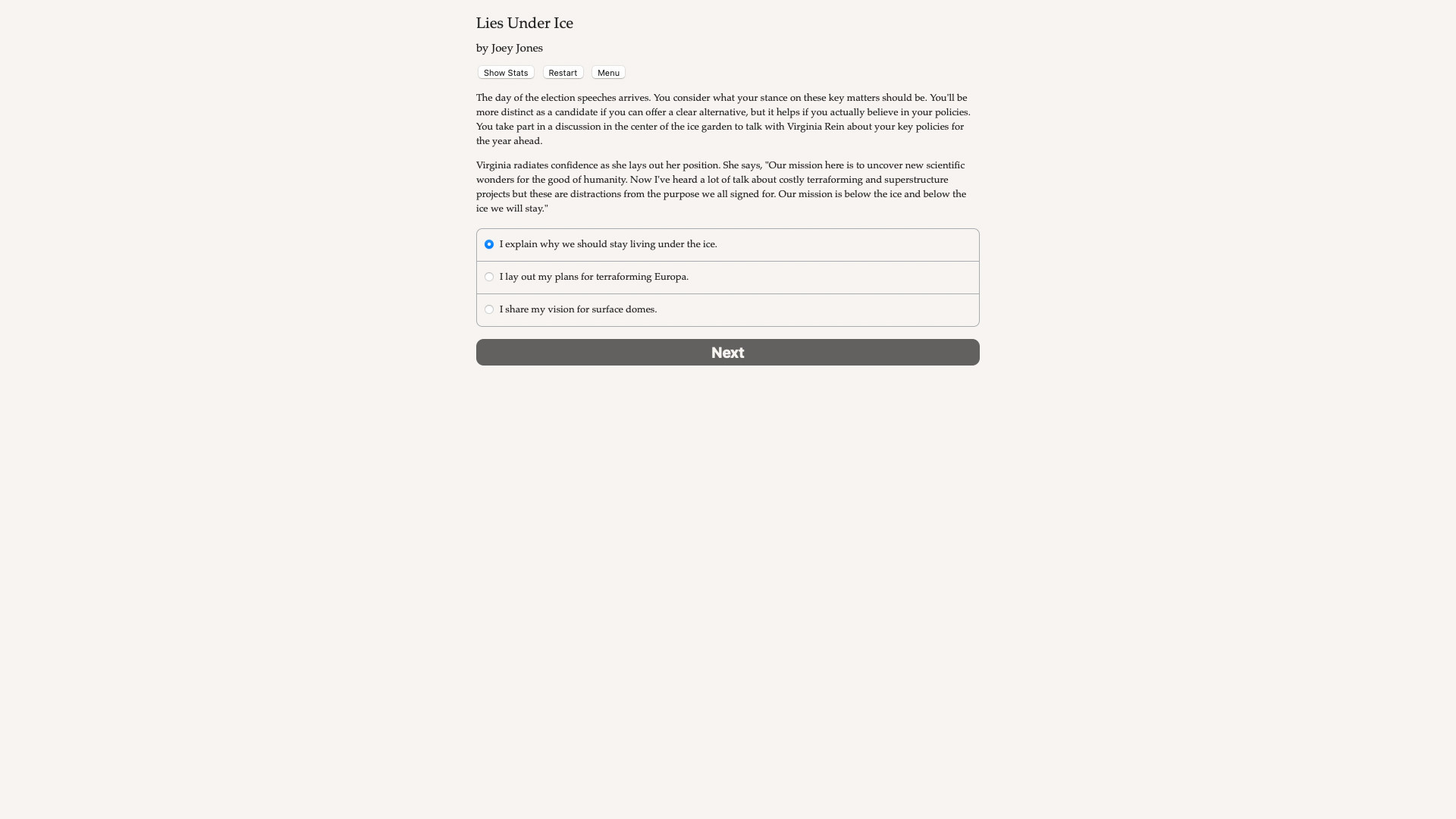 Lead the first settlement on Jupiter's frozen moon, Europa! What alien life lurks beneath the ice? Who is sabotaging your mission? Who can you trust?Lies Under Ice is a 200,000-word interactive science fiction novel by Joey Jones, where your choices control the story. It's entirely text-based—without graphics or sound effects—and fueled by the vast, unstoppable power of your imagination.The year is 2079. Your mission is to build a settlement, explore Europa's treacherous oceans, terraform the moon, and send findings back to Earth.But political factions within your colony vie for dominance, constantly on the brink of open conflict. While they are technically collaborating on this mission, each one has their own goals for Europa. Will this colony be a site for new trade? A home for Earth's ever-growing population? A clean slate where humans can break free of older social models? How far will each side go to get what they want?With the most advanced science at your disposal—massive terraforming systems, gene splicing, AI therapy-bots, nerve-connected bionic prosthetics, and more—you can venture from the safety of your spaceship out into the hostile frozen world. Descend beneath the ice of Europa, pilot a submarine through frigid waters that no human has ever seen, and uncover ancient secrets of an alien world.There's definitely alien life here. But does it pose a danger to you and your fellow settlers, or is it the greatest opportunity that humanity has ever known?Play as male, female, or nonbinary; gay, straight, bi, or aromantic; poly or monogamous.Choose among six distinct professional backgrounds: diplomat, aerospace engineer, arcologist, asteroid miner, pilot, or marine biologist.Manage the complex needs of an extraterrestrial base: prioritize the comfort of the workers, maximize scientific output, build luxury domes, dig mazes of ice tunnels, or engage in terraforming.Navigate the treacherous politics of Earth's squabbling factions from millions of miles away!Interact with Europa's alien ecosystem: will you release fish as a sustainable food source, bring along cats for companionship, or rely on synthetic creatures to avoid introducing invasive species?Run for office in Europa's fledgling government!Delve beneath the ice, and reach for the stars! Далее