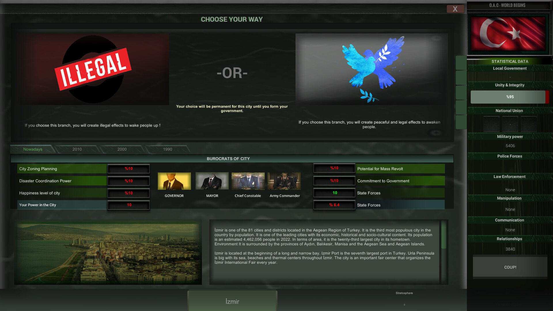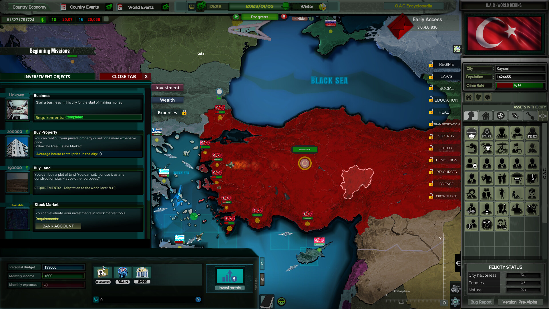 Ver: Pre-AlphaСначала захвати власть в своей собственной стране!. O.A.C усердно работает, чтобы вдохновить свой жанр и стать ещё лучше в категории глобальных стратегий.Даже если вы — не совсем человек.. Каждая страна обладает своей внутренней динамикой: политическими структурами, социально-экономическими системами и культурными основами. Религии, этнические группы, профессии, НПО, национальные проблемы, эпидемии, стихийные бедствия, экономики и множество других особенностей уникальны для каждой нации.Среди всего этого разработайте собственную стратегию захвата власти в своей стране, оставаясь на первый взгляд обычным человеком.Великая война — После старого правительства. Если вы одержите победу в борьбе за власть, ваше путешествие в O.A.C только начинается.Мировая технологическая трансформация привела к новой эпохе нанотехнологических войн. В то время как могущественные страны продолжают наращивать свои экономики, малые государства остаются уязвимыми целями — без выхода и обречёнными на поглощение.Вы сами определяете свою роль в этой системе. Каждое принятое вами решение и выбранный путь сначала повлияют на вашу судьбу, затем на судьбу вашей нации, а в итоге — на будущее всего человечества.Период Апокалипсиса. Вас ждёт богатая и футуристическая история.От цивилизаций за пределами «Известного мира» до тайных мировых организаций..От древних тайн, связывающих прошлое и будущее, до самого существования человечества — всё готово к раскрытию.Будучи могущественным лидером на пороге апокалиптической эпохи, вы определите условия существования для всего человечества.И помните:Вас всегда будет поджидать большая опасность, чем простого человека.Мир O.A.C начинается! Далее
