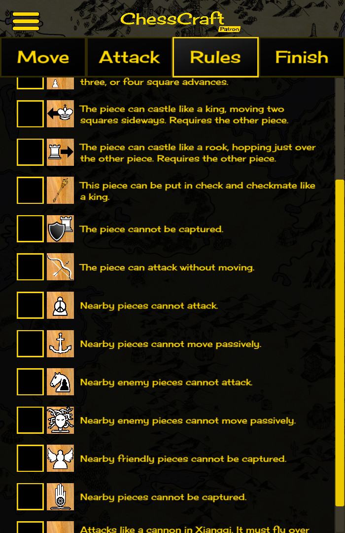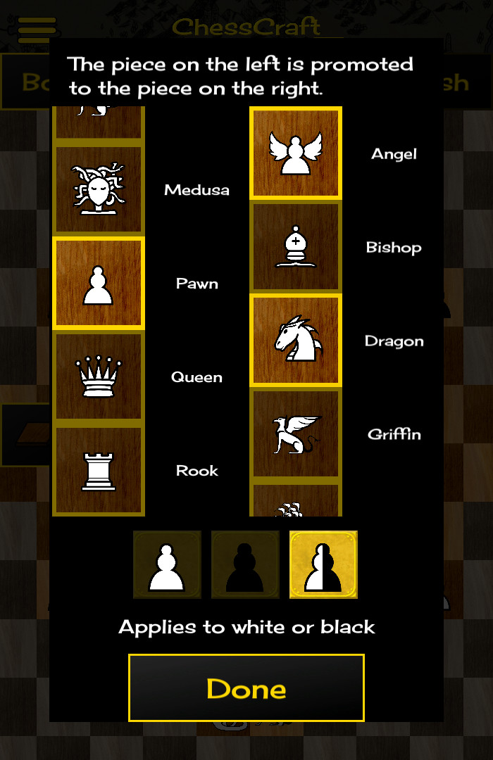 Никогда не играйте ту же игру в шахматы снова! ChessCraft - это шахматная песочница AI. Создайте свой собственный Шахматная доска, правила и Фигуры. Играть против компьютера. Играйте со своими друзьями онлайн. Выиграйте призы, играя 80 различных шахматных игр в режиме приключений. ChessCraft также является крупнейшей в мире базой данных вариантов шахмат.Многие шахматные игры уже существуют. Тем не менее, только ChessCraft позволяет вам создавать такие интересные Шахматная доска, Фигуры и правила и сразу играть приличный компьютерный противник.Создайте новые Фигуры с любым комбинацией движений 8 Слон или ЛадьяR. Или с любым Конь двигаться в коробке 7 на 7. Создайте новый Шахматная доска любой формы и размера. Отключите или включите любой квадрат в коробке 16 на 16. Поместите специальные правила в любом месте, как акции или телепорт. Создайте Фигуры, которые не могут быть захвачены. Создайте Фигуры, которые атакуют без перемещения Создать Фигуры, которые останавливают другие Фигуры от перемещения. Затем компьютерный противник использует компьютерную науку, чтобы понять ваши творения и играть против вас. Далее