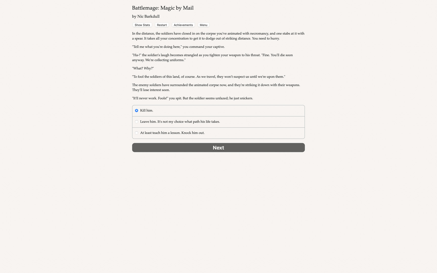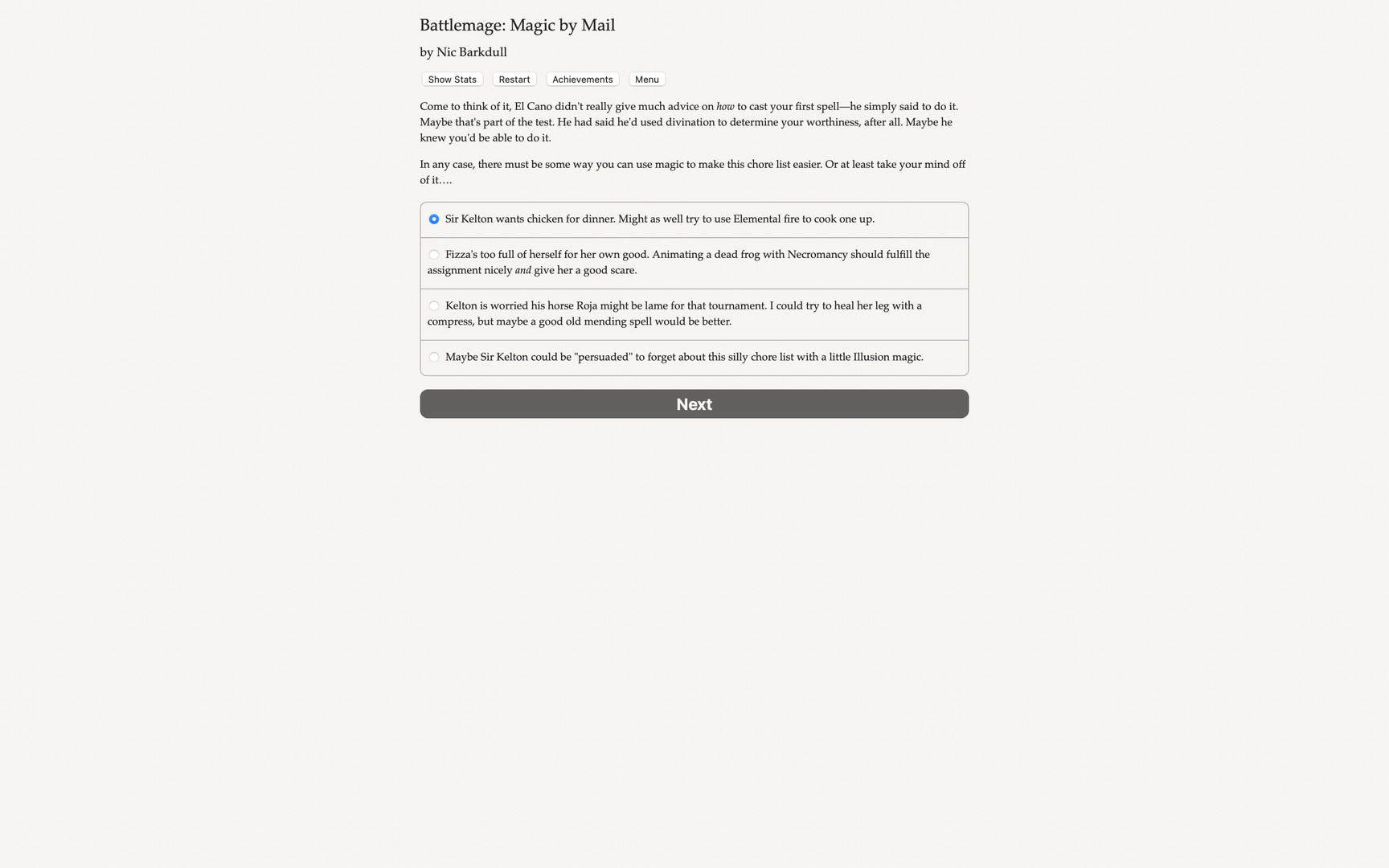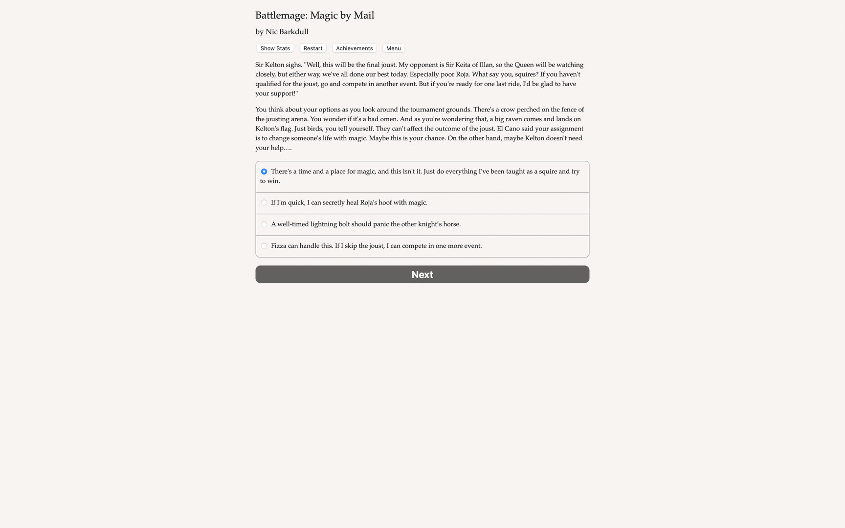 Will you defend your kingdom with forbidden magic, or backstab the crown? Win tournaments, kiss a prince or princess, or just seize power for yourself!Battlemage: Magic by Mail is a 168,000-word interactive novel by Nic Vasudeva-Barkdull. It's entirely text-based, without graphics or sound effects, and fueled by the vast, unstoppable power of your imagination. You're lucky you saw that ad at the market. "Learn from home! Full battlemage qualification by mail!" it said. Now, your first battlemage assignment is finally here! At last, you can master the magical arts of elementalism, illusion, healing, and necromancy.Yesterday you were just a squire, but today you're an aspiring battlemage! But Sir Kelton says that squires aren't allowed to practice magic, so you'll need to act like you actually want to be a knight, at least for now.With the powers you can unlock, maybe you can win a tournament or two, or get in good with the royal family—you can even try your hand at the game of court politics. Or if you really want to get on Kelton's good side, prove yourself on the battlefield, defeating the mysterious invaders that threaten your kingdom's borders.But beware, if you're not careful, you'll suffer from Arcane Corruption. At first, Corruption warps your physical appearance, but it soon takes over, putting the magic in control.You won't let that happen, will you? Play as male, female, or nonbinary; gay, straight, bi, asexual, or poly. Manipulate minds with illusion magic, master the elements, channel the forces of life with healing magic, or harness death with necromancy. Compete in tournament events like combat, archery, and jousting. Navigate the royal court and use intrigue and betrayal to gain power. Defend your kingdom from mysterious invaders led by a powerful battlemage. Compete with other students to gain the notice of the legendary El Cano. Romance a fellow squire, a humble stableboy, a prince, or a princess.Will you be a loyal squire, a powerful battlemage, or ruler of the realm? Далее