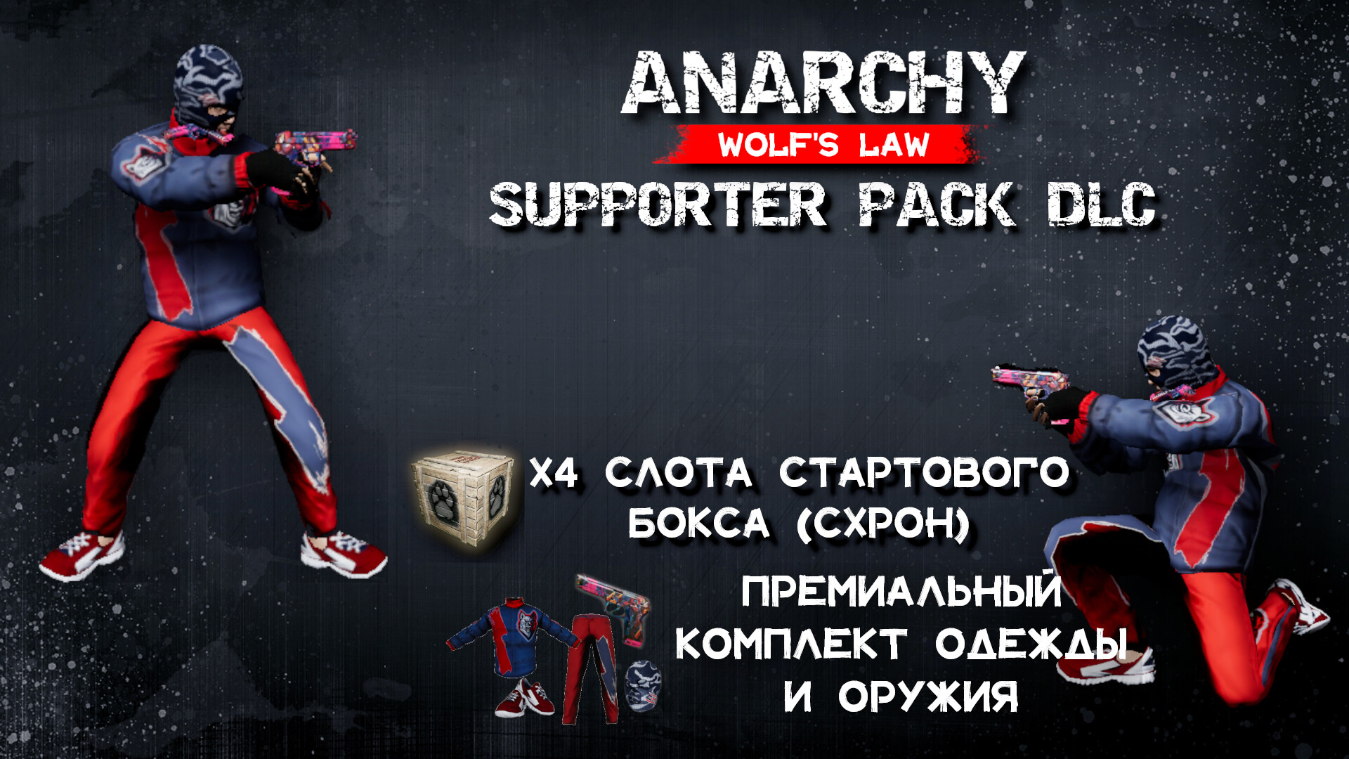 Всем привет, мы рады анонсировать Anarchy: Supporter pack. Это набор дополнительных плюшек для людей, которые хотят поддержать разработчиков и поучаствовать в развитии проекта Anarchy Wolfs law В набор Anarchy: Supporter Pack входят следующие цифровые предметы:* + x4 слота стартового бокса (Схрон)* + Премиальный комплект одежды и оружия (будем постепенно добавлять эксклюзивные, прикольные плюшки) Захват территорий От всего сердца благодарим вас за вашу поддержку, поскольку мы разрабатываем для вас лучший экономический экшн-шутер на выживание. Команда AWL. Далее