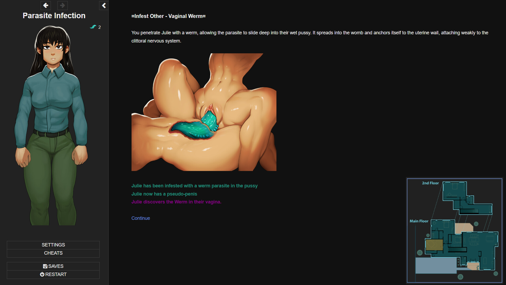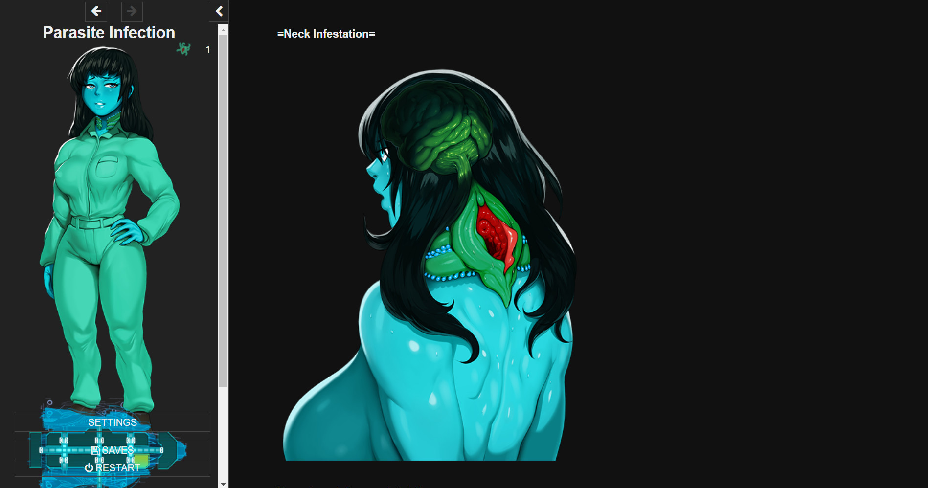 You are Chet, an average person working in a mundane job. One day you are accidentally abducted onto an alien ship as part of their bio-weapon science experiment. Explore and discover what is going on - escape if you can! Or maybe you won't want to. The vessel is filled with parasites capable of merging with and altering the body in various ways. Why are we putting this on steam: 1) It's just really cool to have a game on steam 2) The game is expanding with fan-made versions on rpgmaker, ren'py, and fan-made language localizations. Publishing on steam feels like a natural next step. 3) It is a good game development and publishing experience for the resident coder, who wants to get more into game development. Steam's rigorous submission process actually forces a lot of good generalized practices for game publishing in terms of asset management. Parasite Infection has been evolving from a pure text-based choose your own adventure story into a fairly complex game involving mind control, body modification, gender fluidity, and unique sex acts which are physically impossible under normal circumstances. The art started as stick figure hand drawn abominations (by me) and has turned into the amazing artwork you see in the screenshots (by ModeSeven). Player feedback and ideas have helped to push the game forward. There are some truly out of this world sex situations in this game which I wouldn't have thought up if it wasn't for communication with the fans. As per user feedback, we have just updated the game with parts 2+3. If you want to venture offroad, you can find larger versions of the game around the web. However, part 4+ are under construction and will not work very well (if you find versions w/ them on the deepweb somewhere) Some people have said this game is addictive. If you feel you are playing it too much, please take a break and go outside. Parasite Infection started as a way of sharing an erotic fantasy, and that's still the primary goal. I don't need your money that badly (although it does help - the artwork was only possible once I monetized the project). Games should be about fun, not entrapment. Yes I know how ironic it is that I'm saying this about a game literally designed around mind control, but it's what I believe. Finally - if you choose to buy this game, thank you for your support. I will be monitoring feedback and improving the game based on reviews and discussion. Далее