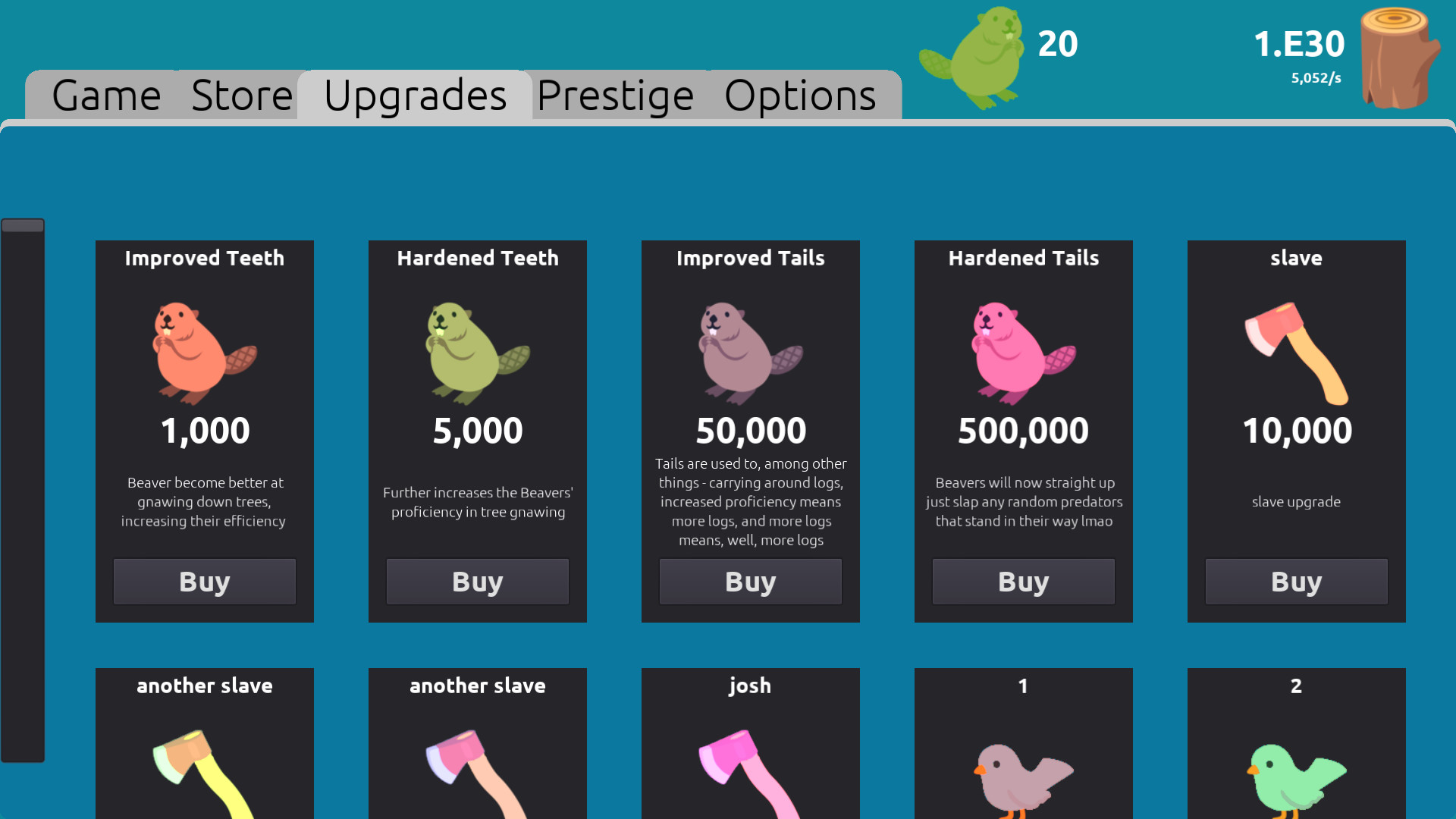 Beaver Clicker is a fun, casual, and strategic Idle GameThe game gives you 1 goal, collect L O G. To help you with this endeavour, you will get help from all kinds of places, like recruiting Squirrels, and even various sorts of Fungi to help you in your wood collecting journey Features:Use logs to get even more logsCollect tons of achievements!Contains at least 17 beaversGet your own pet beaver :)Cloud saving, so you can keep the beavers you love safe <3Wait there's 19 beavers now??Gluten-freeMany unique power-upsOh, I thought i might have found the 20th beaver, but it was actually just the 7th one again& Much Much More!P.S if you play this, please count all the beavers for me Далее