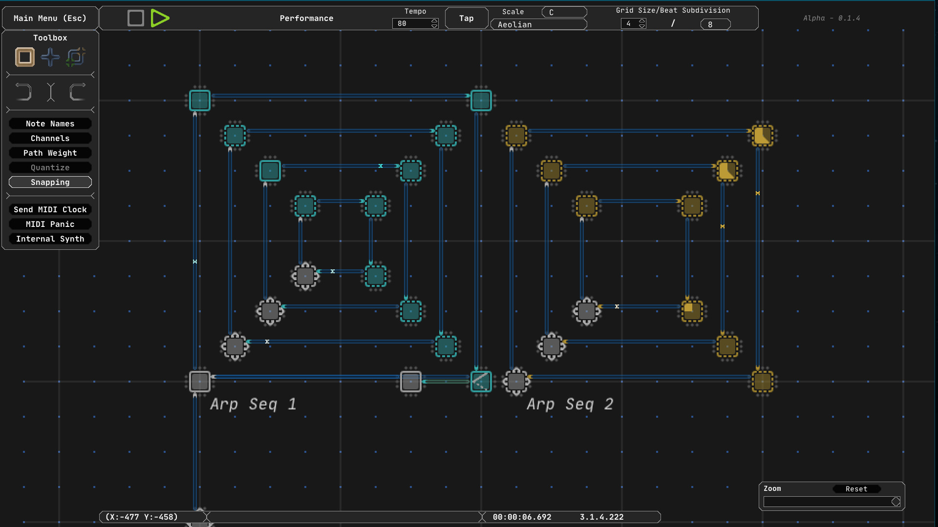 This looks fun, what is it?. Midinous is a non-linear MIDI sequencer (directly viewable as a MIDI input in your DAW) allowing users to create expansive looping complex sequences which don't subscribe to a definite timeline. Rhythm is determined only by a user's imagination. Midinous can, however, still send MIDI clock messages to sync up devices and software. It's not a DAW, nor can it make more than simple sounds using basic waveforms (sine, square, triangle, etc) with its "Internal Synth" option, but it generates MIDI data meant to be sent to other applications. Midinous sends transport, Note, and CC messages on its automatically-created MIDI ports, allowing up to 16 channels of data to be sent simultaneously.If you are unsure if Midinous is right for you, try the free demo!That sounds confusing. How does it work, really?. Seamlessly! Open Midinous, find it as a MIDI input device in your DAW and start creating. Midinous emulates a hardware MIDI controller by creating its own MIDI Input/Output port on a computer, throwing away the need for any 3rd party software. Launch Midinous, and it can start sending MIDI data within seconds!Still lost. MIDI?. Musical Instrument Digital Interface (MIDI) is the technical standard Midinous adopts to send data to other applications (usually, but not limited to, Digital Audio Workstations (DAWs)). Although Midinous can make simple sounds on its own, it is best used with a DAW.Grid Based Editing. Midinous works on a grid system where the distance between each tile is a quarter note. Arrange objects called ‘Points' and connect them together with ‘Paths' to quickly create complex looping or branching sequences of MIDI data. Branch to points randomly or instantly, split signals, or have signals travel in order of Path creation. Turn snapping mode off for complex rhythms and odd timing!Customization and Accessibility. Most keyboard controls have been made accessible by way of remapping, and the interface can be recolored as desired. Make Midinous as friendly as it needs to be. A left-handed mode is also included.“Infinite” Canvas. Midinous provides a virtually infinite scrolling canvas for creations. Though technically not limitless, Midinous can support the wildest of creations with full support for scrolling, panning, and zoom. Add thousands of points and connect them for wild sequences.Scale Snapping. With Midinous' scale snapping functionality, set a group of Points to a certain scale, or ensure the entire project aligns with a desired mode. Choose a key and a scale to quickly change the way a sequence sounds.Relative Signals. Carry MIDI data across multiple pathways with relative assignments for every attribute a Point object may have, such as MIDI Note, CC, Channel, Velocity, Duration, and more. Good for ascending sequences and arpeggios.Support For Other Operating Systems. Midinous is being developed in a cross-platform framework that allows it to run on Mac, Linux, and Windows.Please note! If you don't hear anything in the program while a sequence is running, that is normal. Midinous can generate simple tones using the program's "Internal Synth" option, but its main function is outputting MIDI data for use in other programs like Digital Audio Workstations (DAWs). Далее