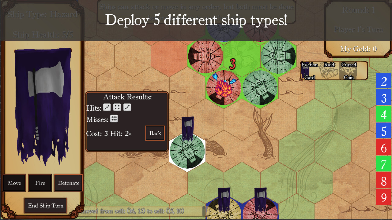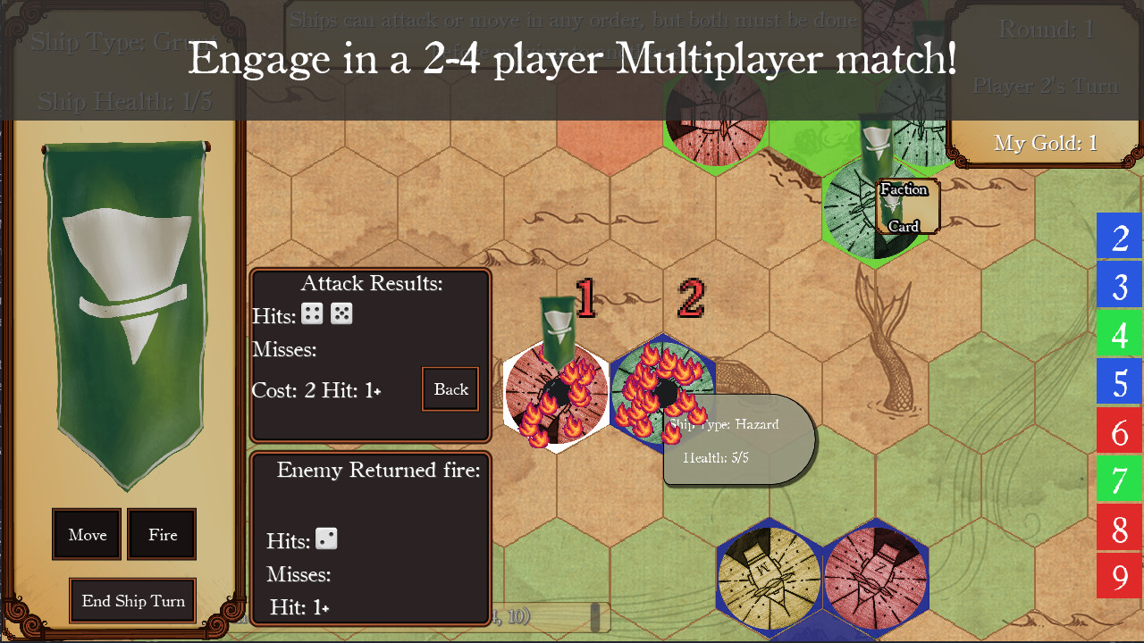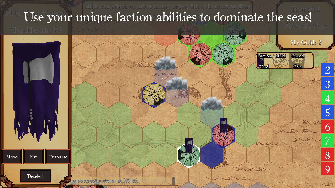 Players begin the game as one of six factions with control of three islands, a fleet of ships and a handful of gold.A player obtains victory over the other players by controlling 6 islands or being the last ship sailing. There are many routes to that victory but the journey will without a doubt involve sailing your ships, firing cannons, seizing islands, and using faction abilities.Sail ships. Players can move up to 3 ships on their turn and are able to move a ship up to 3 tiles unless aided by Known TradewindsShips are able to turn in any direction players desire. Think of the movie Pirates of the Caribbean where they dropped anchor and drift a U-turn and outmaneuvered the Black Pearl.Fire cannons. Step one of firing your epic cannons, count the number of tiles to the target. That is the minimum you need to roll to hit the target.Step two, pay your crew to load and fire that cannon! 1 coin to fire a single shot. Roll to see if it is successful.If successful, place a damage token under the target, if unsuccessful, roll better next time.Seize islands. When seizing an island, a player must first be adjacent to the island they would like to control. Once in position, pay 2 coins for the island along with a mast that belongs to the faction you are wrestling island control from.Seizing an island that is defended is very costly. For each enemy ship that controls that island within 2 tiles adds 1 coin to the overall cost of seizing the island.Use faction abilities. When playing with faction abilities, each player selects 1 of the 6 factions to be. Each faction comes with 3 exciting and unique abilities that no one else has access to. These will help players turn the tide of war.Abilities can cost coins to use or be limited on when you can use them, such as on your turn or when you seize an island.On the left side of each faction card is an illustration, some adjectives to describe the faction and a quote the faction can be heard saying from time to time. Далее