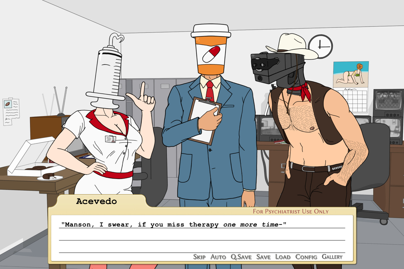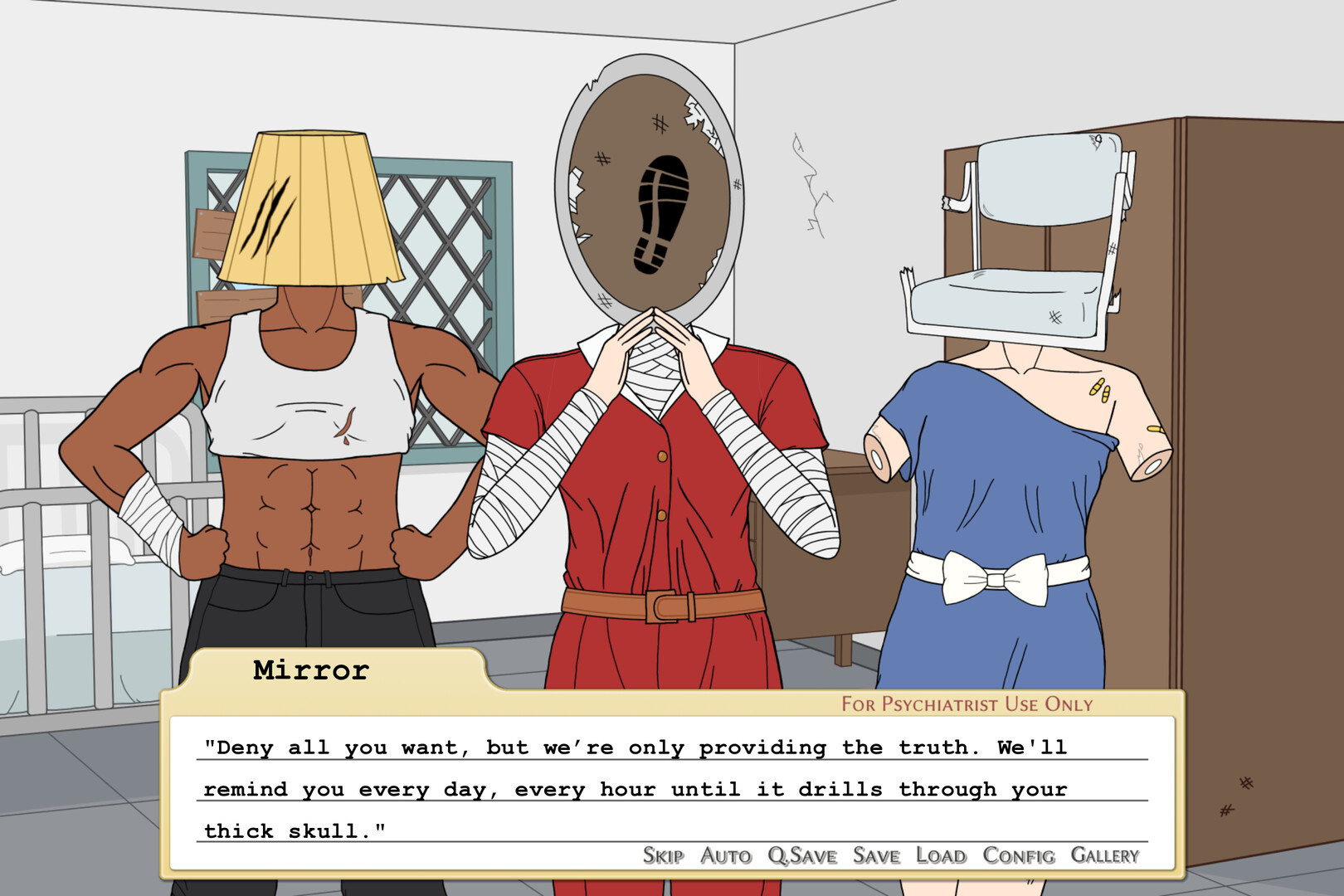 Meet Manson Moss, a schizophrenic man who sees everyone with an inanimate object for a head. Due to a certain 'incident', he is sentenced to mandatory rehabilitation in one of New York's most ill-managed psych wards in the year of 1986. He plots his escape, but the eccentric occupants of the Ward can't let him leave—so they get a little friendly with him instead. Help Manson navigate love, psychosis, and countless misadventures in this dark comedy visual novel, Object Ward.Features: 4 male and 2 female love interests & a friendship route. Homo/Hetero/Bisexual adult content can be turned off in settings.21 endings with choices that matter. Over 160k words of an unforgettable story!Horrible punsPartial voice actingOver 100 unique CGs and a fully original soundtrack!Characters: Далее