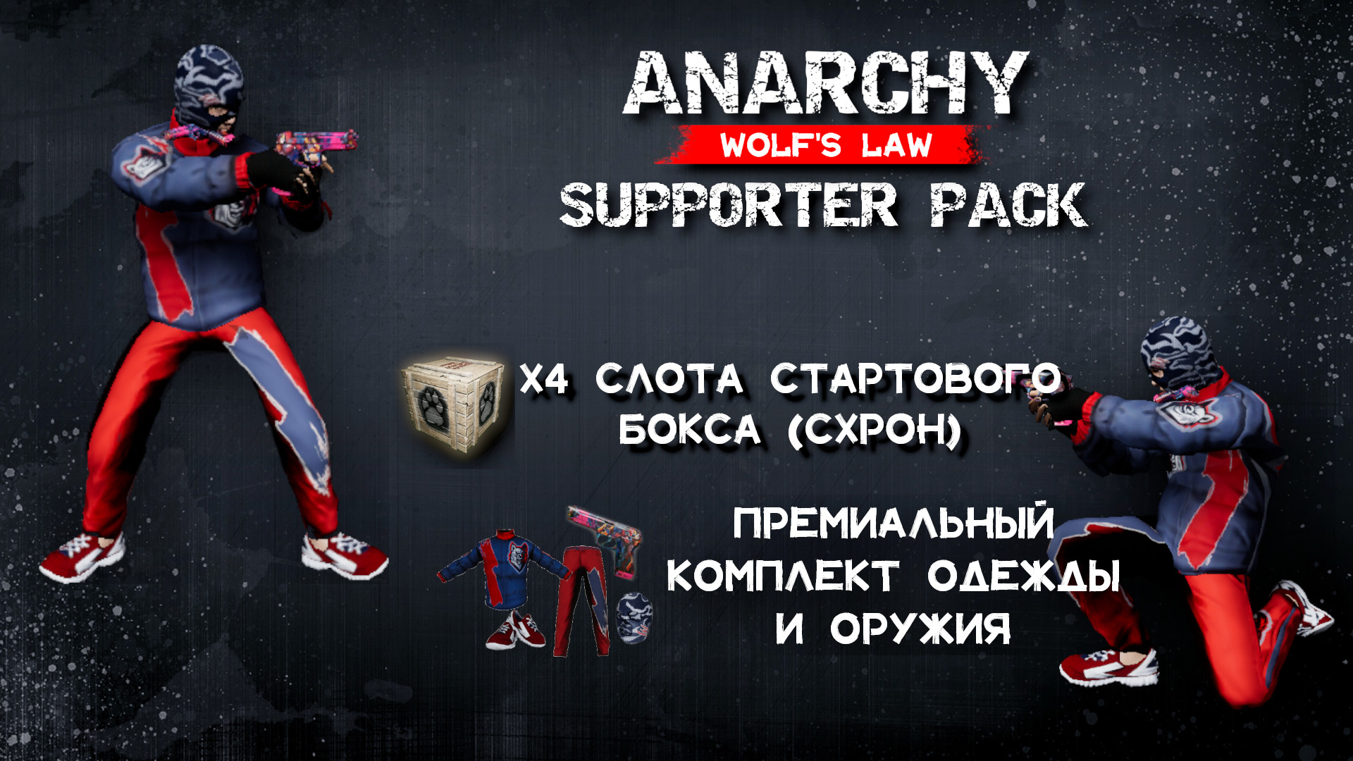 Всем привет, мы рады анонсировать Anarchy: Supporter pack. Это набор дополнительных плюшек для людей, которые хотят поддержать разработчиков и поучаствовать в развитии проекта Anarchy Wolf's Law В набор Anarchy: Supporter Pack входят следующие цифровые предметы:* x4 слота стартового бокса (Схрон)* +...Всем привет, мы рады анонсировать Anarchy: Supporter pack. Это набор дополнительных плюшек для людей, которые хотят поддержать разработчиков и поучаствовать в развитии проекта Anarchy Wolf's Law В набор Anarchy: Supporter Pack входят следующие цифровые предметы:* x4 слота стартового бокса (Схрон)* + Премиальный комплект одежды и оружия (будем постепенно добавлять эксклюзивные, прикольные плюшки) От всего сердца благодарим вас за вашу поддержку, поскольку мы разрабатываем для вас лучший экономический экшн-шутер на выживание. Команда AWL.Далее