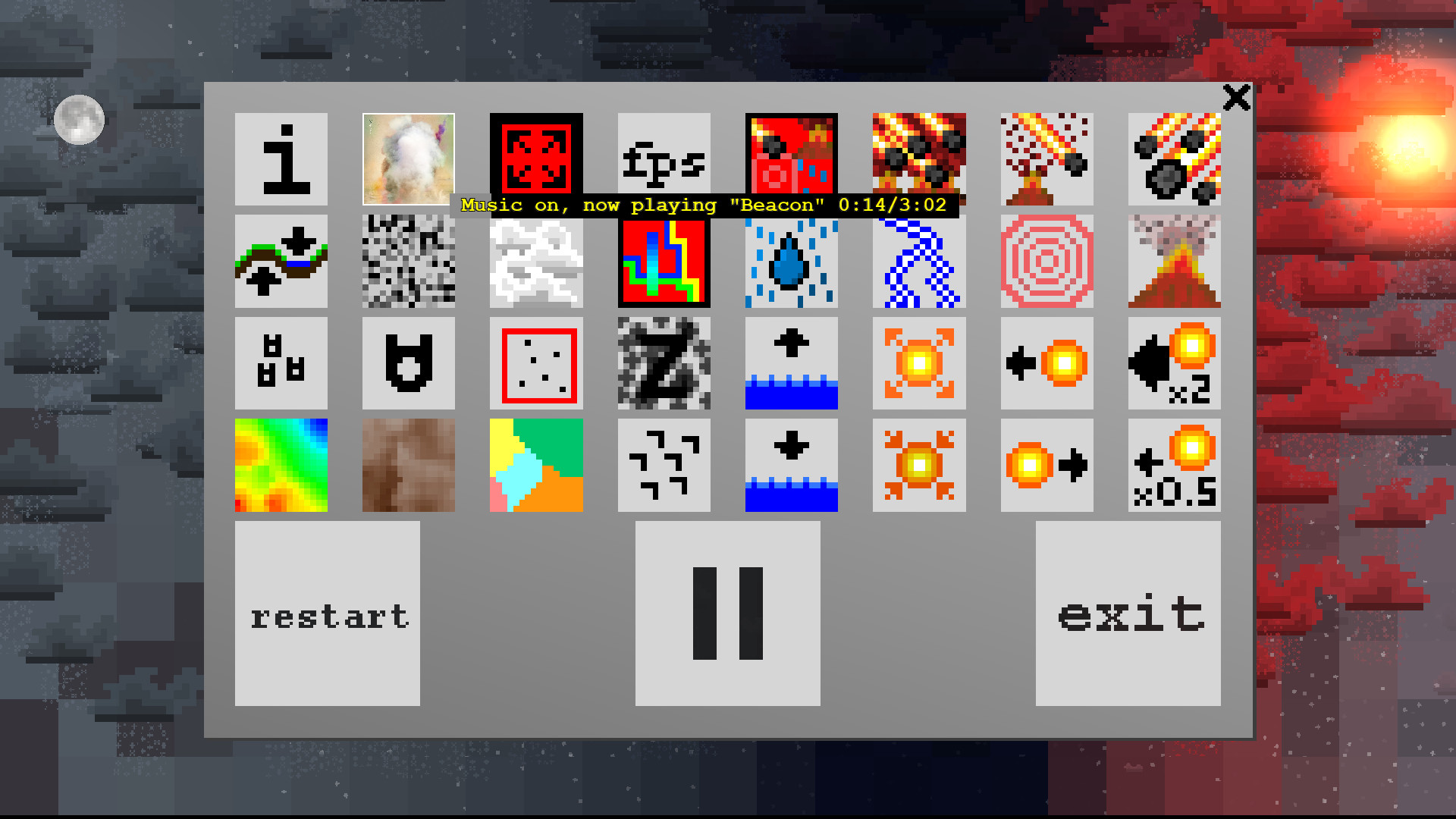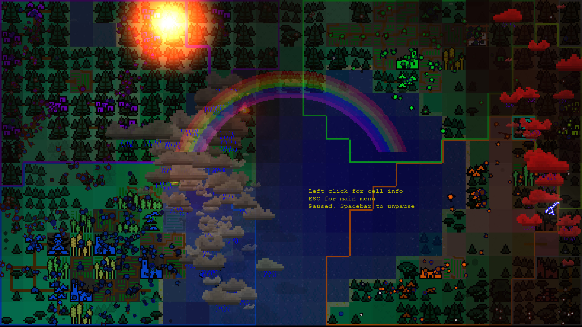 Ardarium is a 2D simulation that automatically generates a random map and populates it with plants, animals, and humans. The point is to be something pretty and colorful that you can watch like a screensaver or play like a simple sandbox game. Animals look for food, avoid danger, and reproduce. Humans do those things and also build nations, go to war with each other, and cultivate the land. The world constantly changes. Land deforms because of erosion, tectonic uplift, volcanos and meteors. Elevation changes cause coastlines to shift and alter weather patterns. A forest might turn into a desert because it no longer gets rain. A submerged hill can become an island if the land rises above the water. A human settlement might thrive due to an abundance of food and then decline because of disease. Animals evolve to be bigger or smaller, faster or slower, based on which ones survive to reproduce. Anything the player can do, like spawning animals or starting meteor showers, is something the simulation also does automatically. You can leave it running as long as you want and the world will continue as normal. Далее