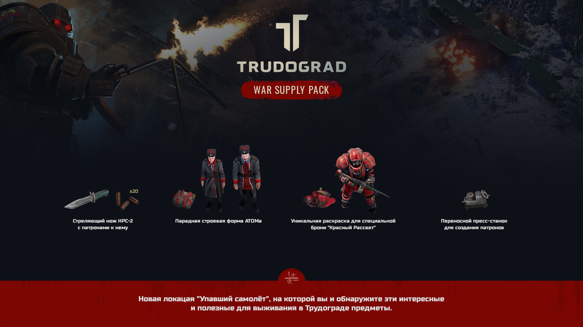 ATOM RPG: Trudograd - War Supply PackНабор War Supply Pack для ATOM RPG: Трудоград расширяет возможности игрока по изменению внешнего облика своих персонажей, добавляет в игру новый образец оружия уникальной конструкции, и инструмент расширяющий возможности персонажа создавать амуницию.Этот набор содержит ряд предметов, которые могут пригодиться в первые часы игры, но не окажут существенного влияния на общий баланс и прохождение игры в долгосрочной перспективе. Главная задача этого набора — поблагодарить тех, кто выбрал поддержать нашу студию даже после приобретения игры.Спасибо, что вы с нами, и пусть будет… АТОМ!War Supply Pack включает в себя:Стреляющий нож НРС-2 с патронами к нему;Переносной пресс-станок для создания патронов;Парадную строевую форму АТОМа;Уникальную раскраску для специальной брони "Красный Рассвет";Новую локацию "Упавший самолёт", на которой вы и обнаружите эти интересные и полезные для выживания в Трудограде предметы. Далее