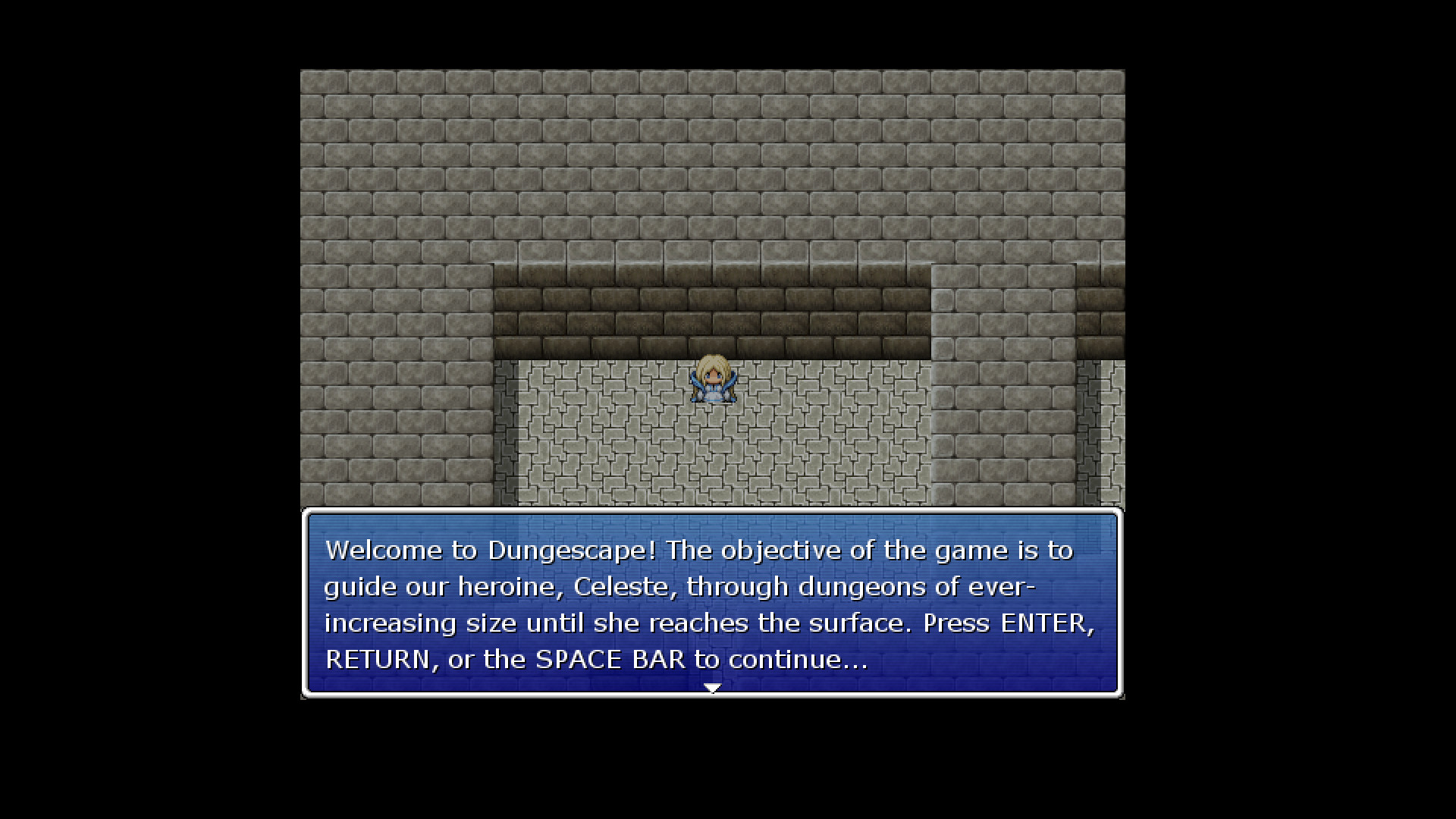 Dungescape! is a casual, minimalist escape-room game in which players take control of Celeste, a young noblewoman who has been kidnapped and trapped in a labyrinth of mazes of ever-increasing size and complexity. More than 40 rooms await to challenge adventurers in this humble kickoff for solo-dev Autism Fanaticism Gaming! Dungescape! is developed in RPGMaker VX. For those new to this popular franchise of 2D JRPG engines, the relevant controls are as follows: - ARROW KEYS: Move Celeste (+HOLD SHIFT: Sprint), Highlight Menu Option. - ENTER/RETURN or SPACE BAR: Confirm, Advance Text. - ESC: Go Back, Cancel, Open In-Game Menu. Далее