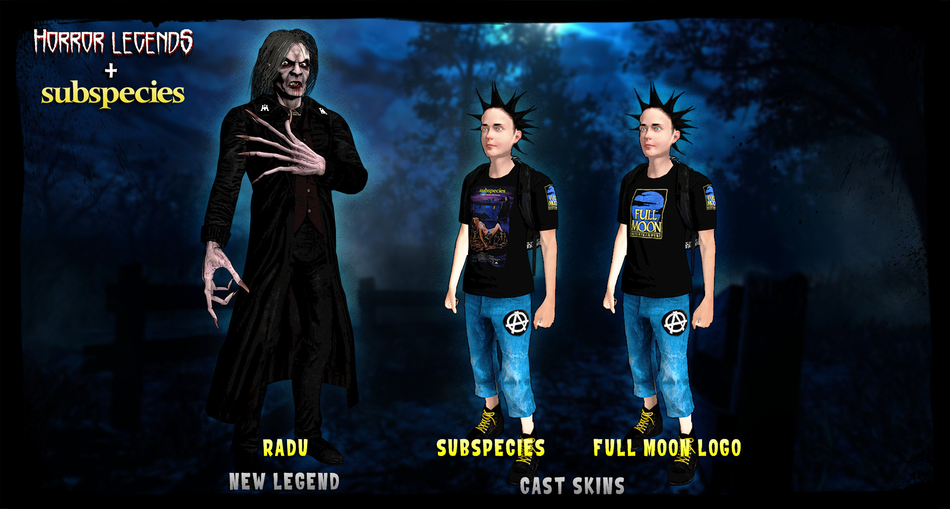 Radu Vladislas from Full Moon Features' “Subspecies” descends upon the world of Horror Legends. Includes over 20 new unlockable skins and 2 new playable characters with brand new abilities.Play as Radu. Anders Hove reprises his role from the classic horror films as the voice of Radu accompanied by the haunting original film score of The Aman Folk Orchestra. Reap the blood and souls of your hapless victims with Radu's iconic sword and dagger and their ravenous finishing moves, empowered with the blood of saints from the Bloodstone itself. The “Subspecies” scurry out from the darkness. Radu Vladislas does not hunt alone, his demonic minions the “Subspecies” are never far behind. These skulking demons stalk and terrorize their master's prey, growing more numerous when the vampire feasts upon another victim as the players slaughtered by Radu become his dreadful servants.A bloody tribute to the classics. In addition to being able to play as the dark horrors Radu Vladislas and his “Subspecies” minions, this DLC offers 7 unlockable skins for the dread vampire and his malevolent underlings. You will also gain access to 10 new skins for your cast members featuring the branding of the iconic horror film studio Full Moon Features.New Legend: Radu VladislasNew Minion: Subspecies10 Cast skins featuring Full Moon branded T-shirts!7 Unlockable skins for Radu7 Unlockable skin for the Subspecies Далее