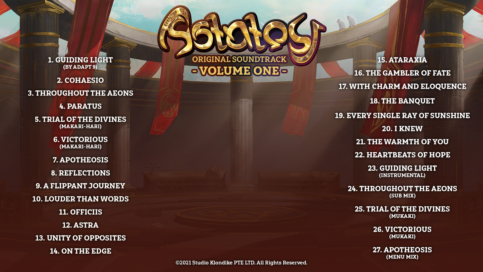 The Astatos Original Soundtrack by Esteban Tamashiro with more than two dozen original tracks, is an eclectic album that blends the flavours of ancient instruments with epic orchestrations, religious undertones, and chill and cozy tunes. A thrilling musical journey that brings our card-battling-hero-flipping adventure to life!Volume One of the Astatos Original Soundtrack is currently available, with Volume Two being added closer to the game leaving Early Access.