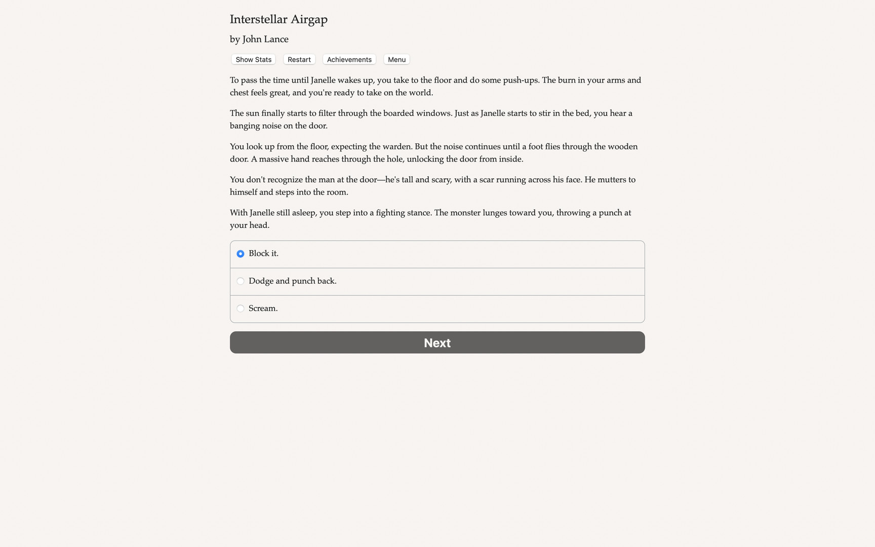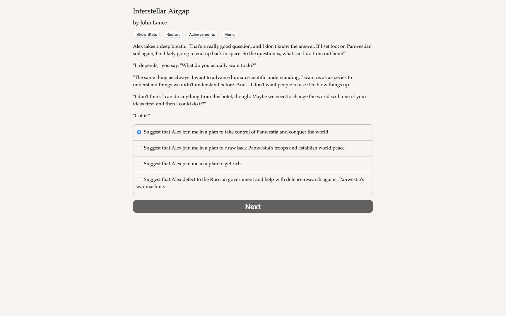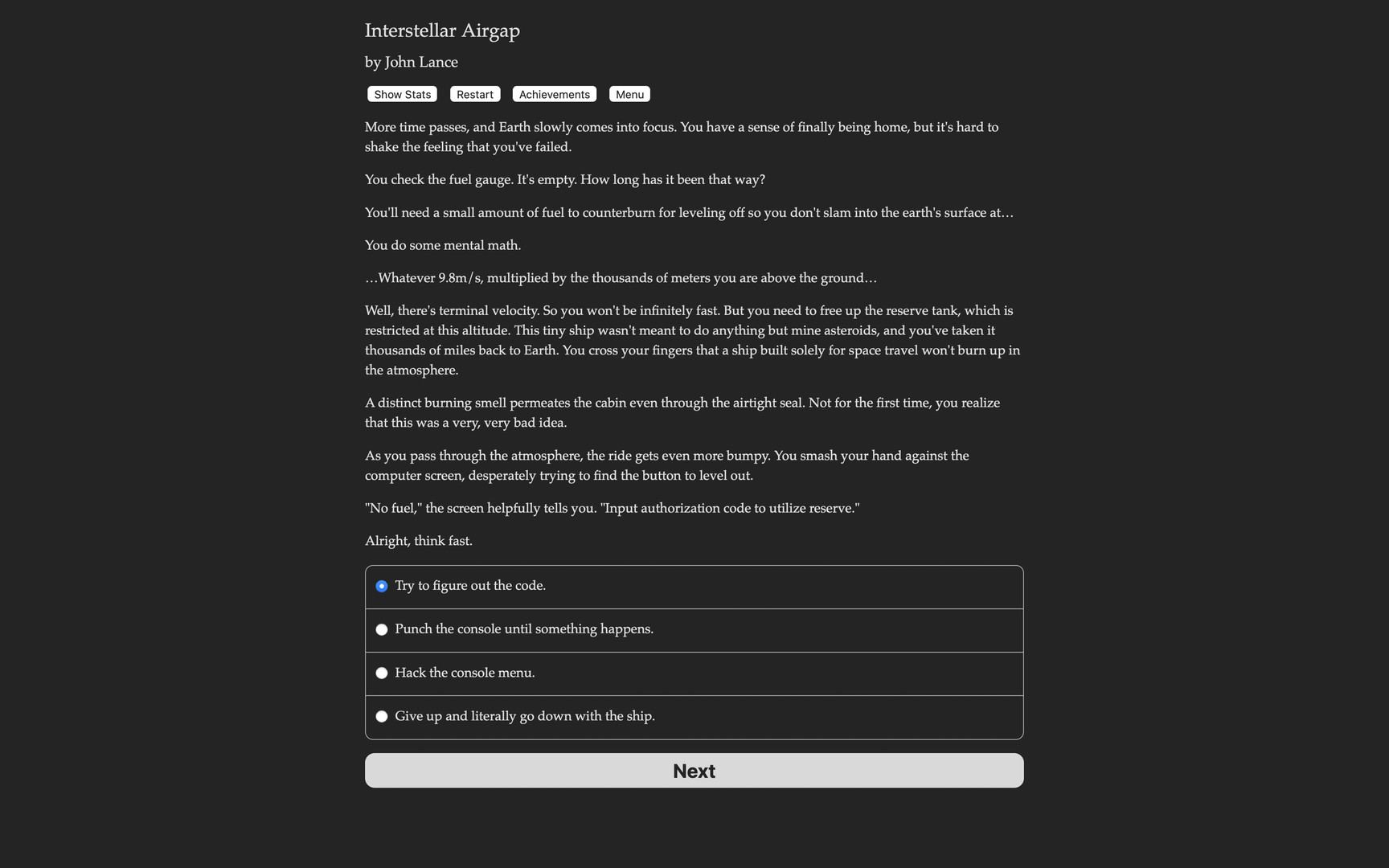 Resistance appears futile--but the hegemon has a very unique weakness. The country of Panwestia has conquered half the globe--and they're not stopping. Backed by terrible interstellar weapons, the leaders are preparing to pull the trigger on the other half. Information exists that can bring the hegemon down, but to retrieve it? You'll need to shoot for the stars.Interstellar Airgap is a thrilling 220,000-word interactive science fiction novel by John Lance, where your choices control the story. It's entirely text-based—without graphics or sound effects—and fueled by the vast, unstoppable power of your imagination. Play as male, female, or non-binary; gay, straight, bi, pan, or asexual. Pilot a nimble ship through the infinite darkness of space. Mastermind a brazen escape from an asteroid prison. Work alongside those looking to dismantle the power structure--or crush their resistance beneath your heel. Find romance with a reformed cop, a revolutionary firebrand, a forthright rocket pilot, a pacifist with a troubled past, or one of the most brilliant minds of their generation. Experience more than a dozen unique endings, all with unique twists based on your companion and/or romantic partner. Run away from a very scary bear!Stay One Step Ahead On A Galaxy-spanning Heist!. Далее