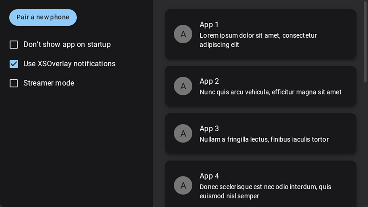 NotiVR for Android™ allows you to wirelessly sync your Android phone's notifications to your SteamVR compatible headset.Using NotiVR you can see a live feed of notifications from your Android and reply to messages without removing your headset (reply function requires compatible phone and support may vary per app)Setup is simple, just download the NotiVR Android app and scan the pairing code. Your phone will automatically send any notifications to SteamVR. Plus you can check your notification history at any time without taking your headset off using our custom SteamVR dashboard overlay.Features. Seamless notification mirroring from your Android device Reply to texts from most messaging apps without removing your VR headset (Android 7.0+ required, apps that support inline replies are supported) Supports XSOverlay notifications (Requries purchase of XSOverlay) Quick and easy setup process Desktop control panel with notification history and pairing controls See your notification history in SteamVR Далее