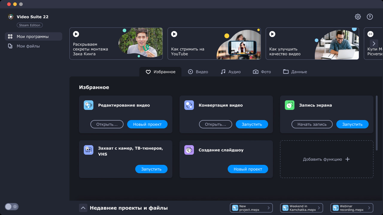 Movavi Video Suite — это три программы для обработки видео в одном наборе. Создавайте подкасты и инструкции для прохождения игр, чтобы рассказать, как справиться с врагами и получить новые достижения. Включите камеру, чтобы зрители знали своего героя в лицо. А потом обработайте видео: удалите лишние фрагменты, добавьте спецэффекты, отрегулируйте громкость. После можно конвертировать видео в любой формат, чтобы посмотреть с друзьями по телевизору.В новой версии появилась интеграция с DLC! Теперь вы можете разнообразить игровой процесс и усовершенствовать любимых персонажей.А ещё можете добавлять фоны, стикеры и титры из разных наборов эффектов — «Я влогер», «Творческий», «VHS» и других. Для юзеров, которые купят Movavi Video Suite, мы приготовили подарок: бесплатный набор эффектов «Эпоха пикселей»! Настоящая ностальгия по 8-битным играм из 90-х: титры, стикеры и фоны как в любимых играх.Что нового: Интеграция с DLCАудиоинструменты и аудиоэффектыПереходы со встроенным аудиоТехнология Fast Track HD для работы с файлами в 4К и 8КОтслеживание объектов на видеоРисование на видео во время записиСохранение аудио на Google ДискеМасштабирование таймлайна для более точной обрезкиПревью кадров на таймлайнеСпинбокс времени: обрезайте фрагменты с точностью до секундыФункция Назад/Повторить для отмены или повтора измененийОбновленный интерфейс с выбором Светлой темыПревратите редактирование видео в увлекательное занятие. С Movavi Video Editor Suite вы не только смонтируете видео, но сможете проявить творческие способности и научиться пользоваться профессиональными инструментами для видеомонтажа. Работайте с файлами на удобном монтажном столе и не беспокойтесь о «тяжелых» видео: благодаря технологии Fast Track HD компьютер не будет тормозить при работе с файлами Full HD или даже 4K.Используйте базовые инструменты: обрезайте и поворачивайте клипы, меняйте яркость и контрастность, соединяйте слайды переходами — с том числе со встроенными звуками. Когда освоите простые инструменты, переходите к более сложным. Стилизуйте видео с помощью цветовых шаблонов, используйте спецэффекты — Хромакей, Стоп-моушен, Анимацию по ключевым кадрам — добавляйте стикеры, лого и титры. Обрезайте аудио и синхронизируйте со слайдами, регулируйте громкость и добавляйте аудиоэффекты в эквалайзере. Вы даже можете создать собственные вступительные титры: соберите их из встроенных фонов, титров и стикеров, а потом добавьте музыку.Конвертируйте файлы со скоростью света. Программа поддерживает 180+ форматов — выбирайте любой. Есть и другой вариант: выбрать профиль с готовыми настройками, тогда вы сможете сразу загрузить файл на любое устройство. В программу постоянно добавляют новые профили, в том числе с настройками для последних моделей смартфонов, планшетов и ноутбуков. Режим SuperSpeed гарантирует сжатие без потерь за считанные секунды, а также вы можете использовать и другие типы аппаратного ускорения: Intel HD Graphics, AMD, NVIDIA NVENC и CUDA.Перед конвертацией видео можно отредактировать. Масштабируйте таймлайн и используйте покадровое превью, чтобы быстрее найти нужный фрагмент видео. Обрезать клип теперь можно с точностью до секунды: появился спинбокс времени. Выставляйте точные временные значения, чтобы вырезать нужную часть. А если что-то пошло не так, то изменения можно отменить. Ещё вы можете добавить фильт