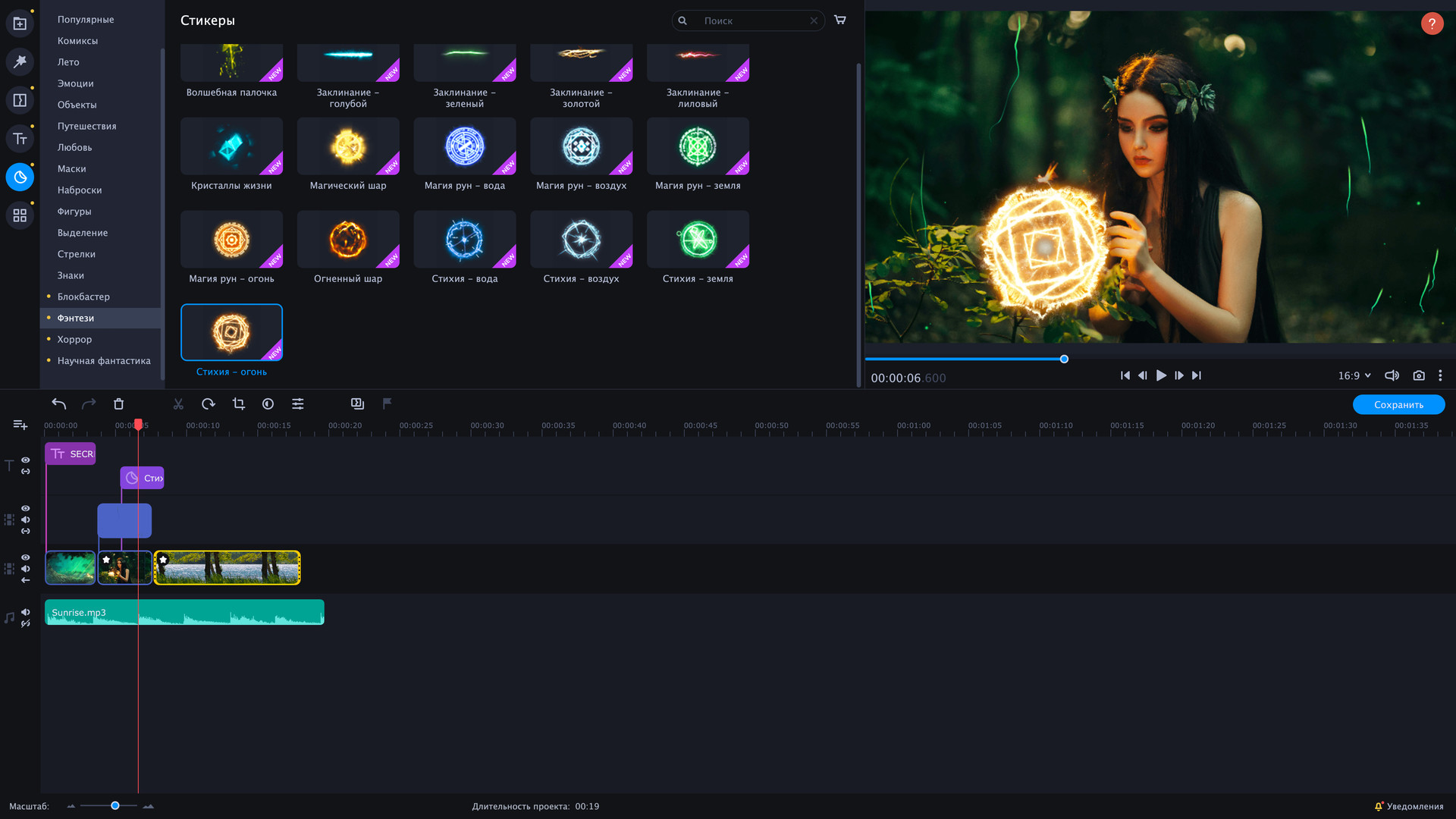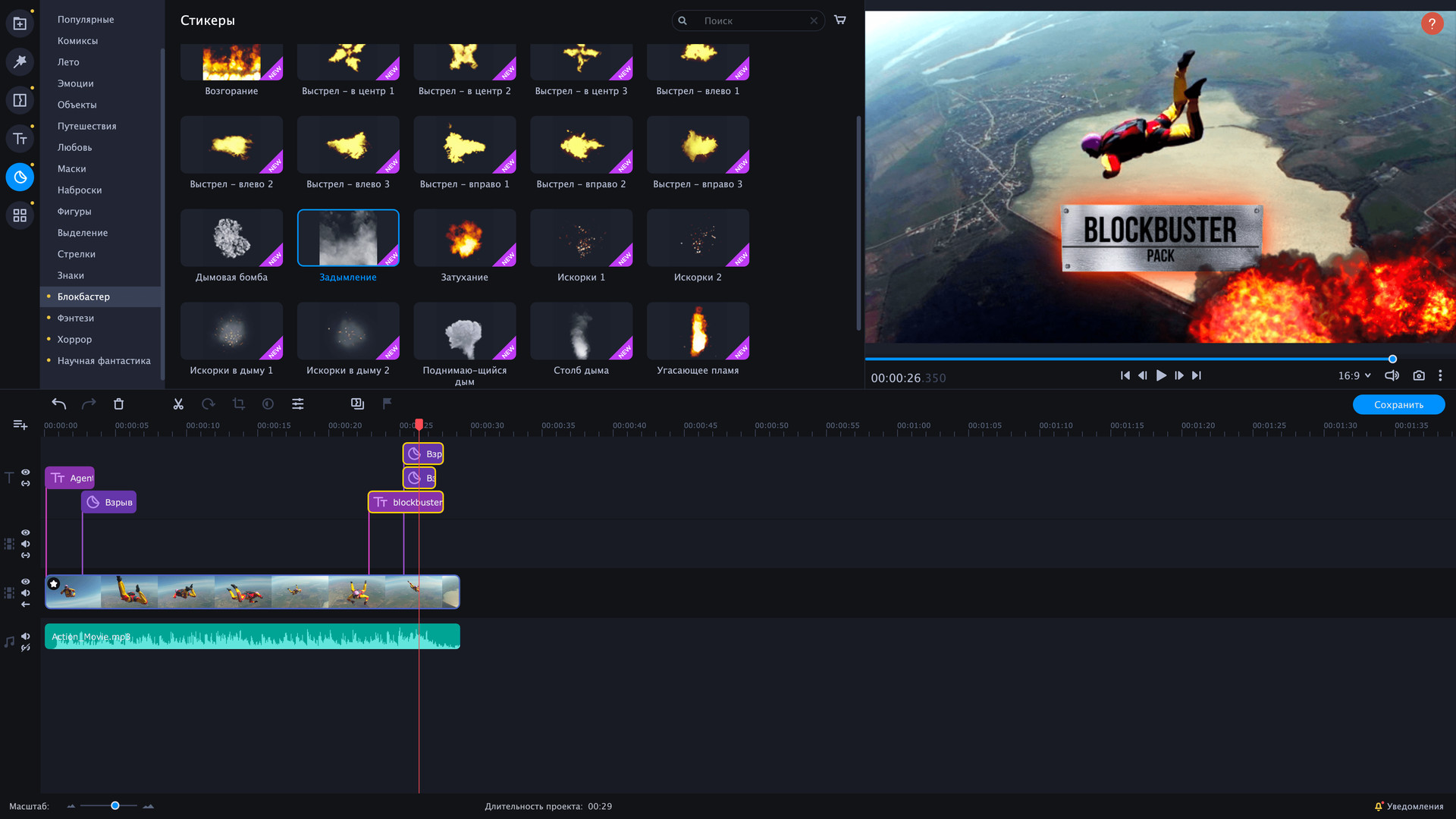 Создайте голливудский фильм с помощью взрывов, дымовых завес, сказочных фонов и футуристических переходов.В наборе 4 пака:БлокбастерФэнтезиНаучная фантастикаХоррорВыберите фон для эпичного сражения с инопланетянами или прикрепите магические элементы, чтобы сотворить...Создайте голливудский фильм с помощью взрывов, дымовых завес, сказочных фонов и футуристических переходов.В наборе 4 пака:БлокбастерФэнтезиНаучная фантастикаХоррорВыберите фон для эпичного сражения с инопланетянами или прикрепите магические элементы, чтобы сотворить заклинание. Добавьте пугающие маски в хоррор – так, чтобы кровь стыла в жилах.В наборе:14 титров 98 стикеров7 переходов16 фонов7 рамокЭтот DLC набор совместим с Movavi Video Suite 2022 Steam Edition.Далее
